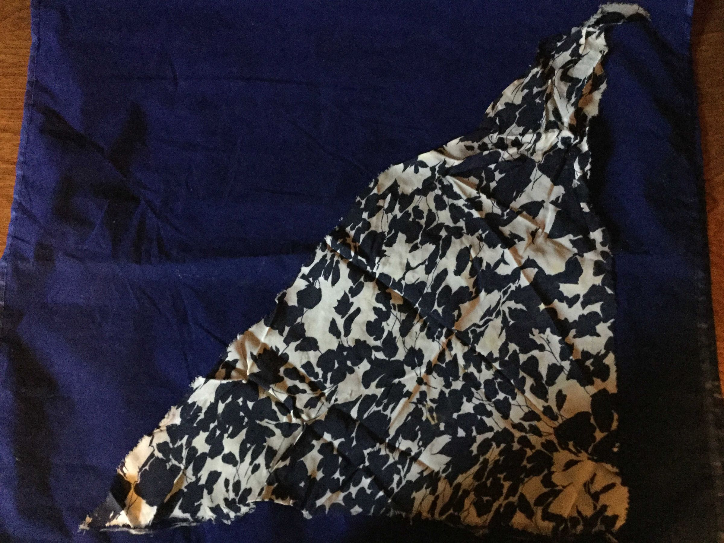 Georgette fabric scrap, navy blue abstract leaf design on off-white ground