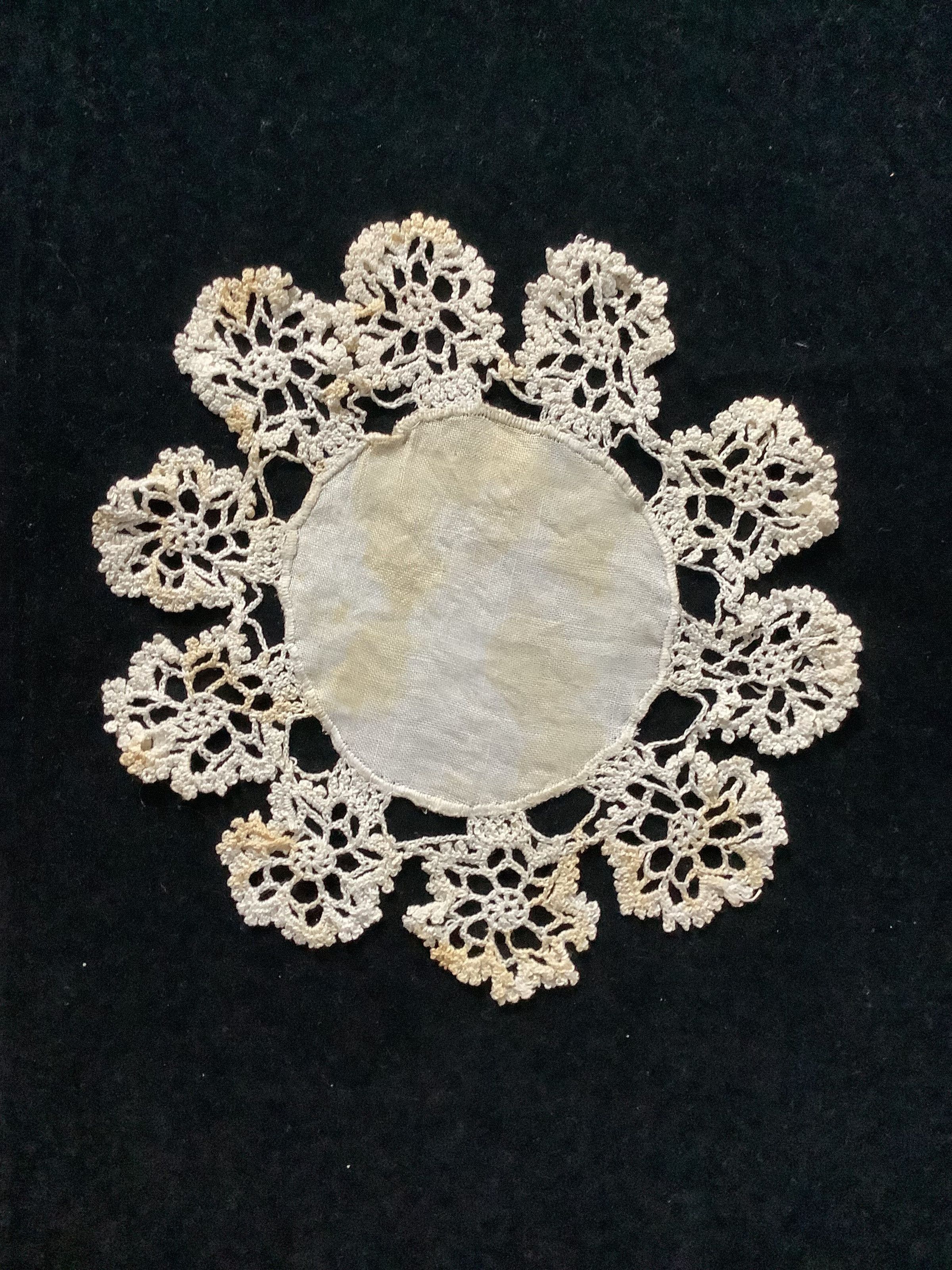 This is a small doily with a crocheted lace around the edges and cotton in the middle.