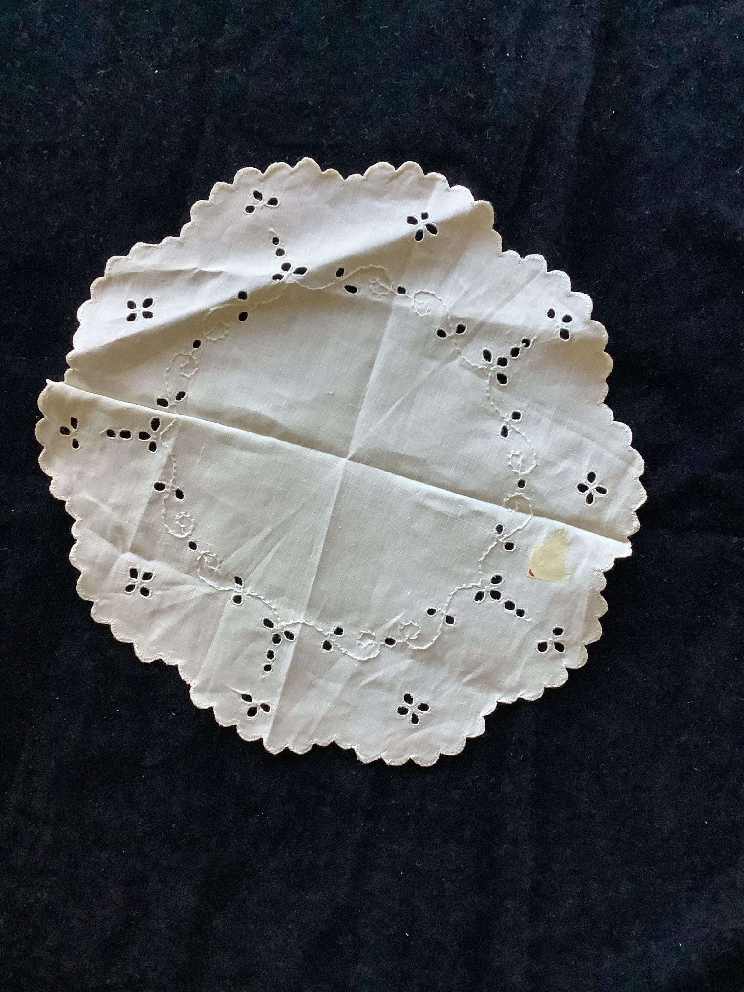 This is a round cotton doily with embroidery and drawn designs. On the back there is yellow residue left over from a price tag