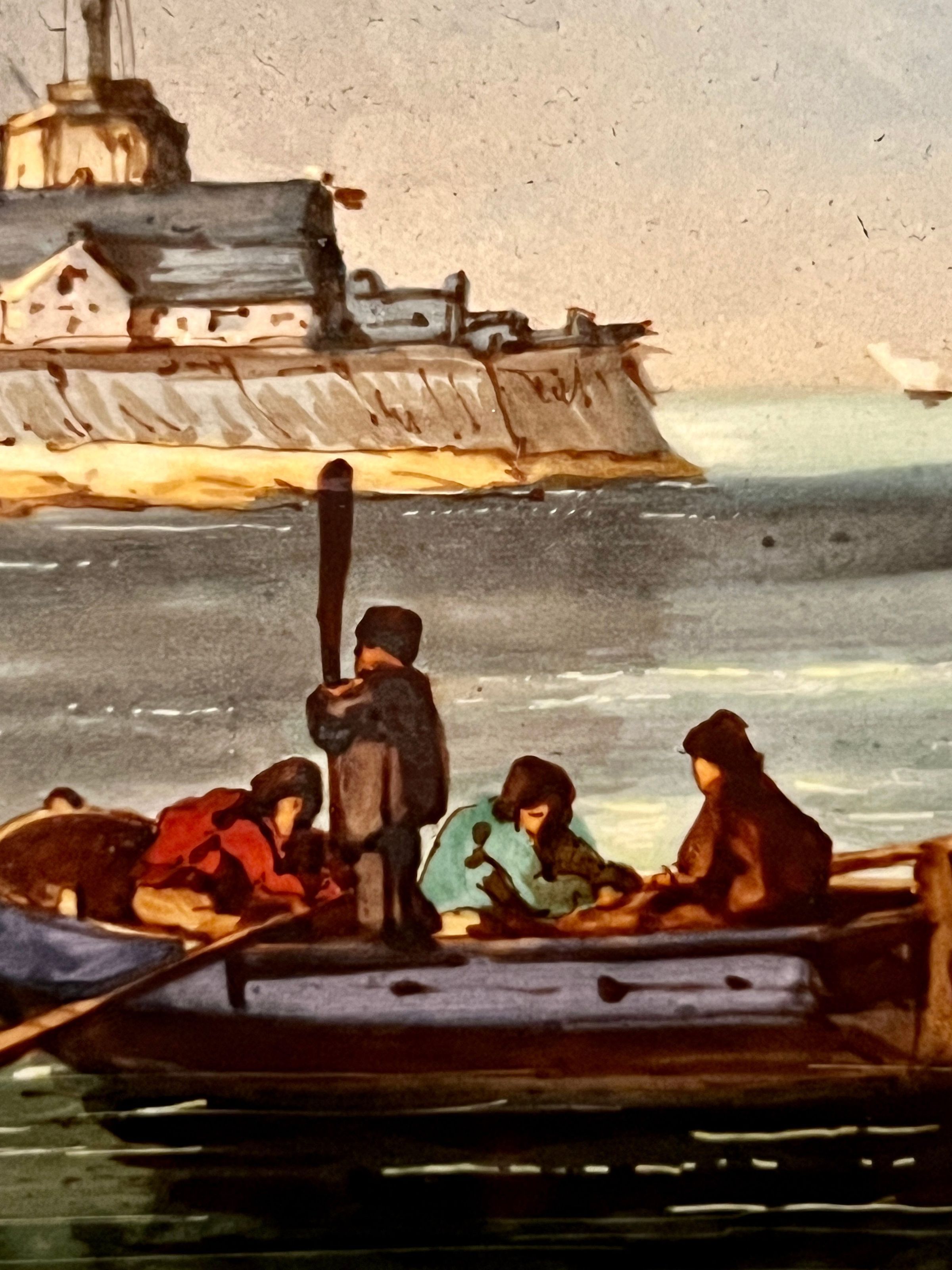 Ceramic and bronze vase with a painted nautical scene of a harbor with boats pulled ashore, figures just off the shore in a rowboat and sailboats at sea; painted filigree detail on the sides and back; bronze gargoyle head handles and bronze lion head feet.Inscription/Signature/Marks
