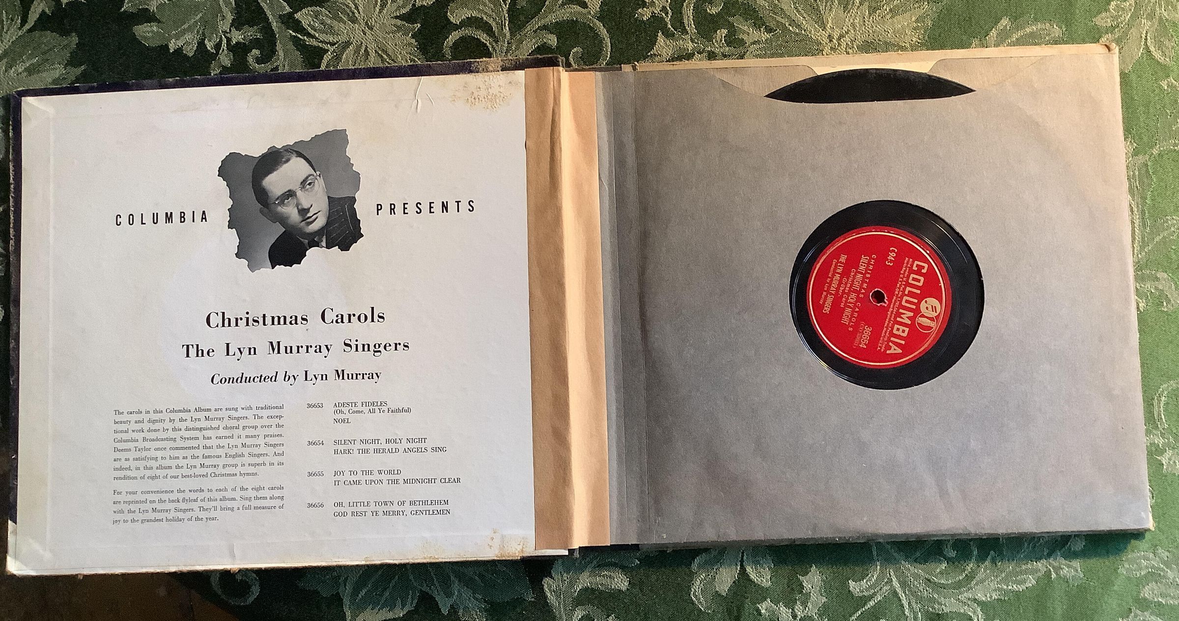 Cover to a set of 4 two-sided 78 RPM records. Christmas Carols sung by the Lyn Murray Singers, conducted by Lyn Murray.