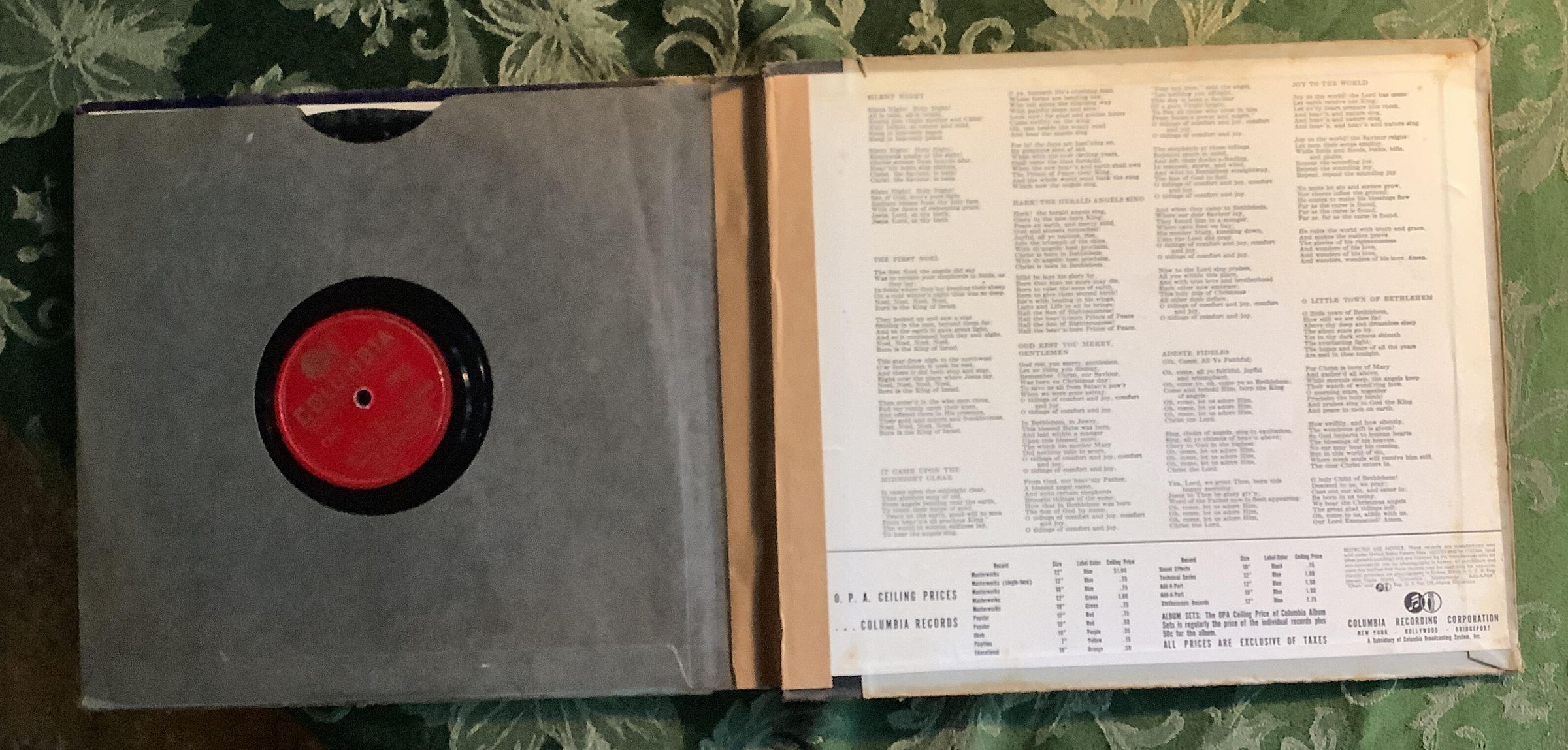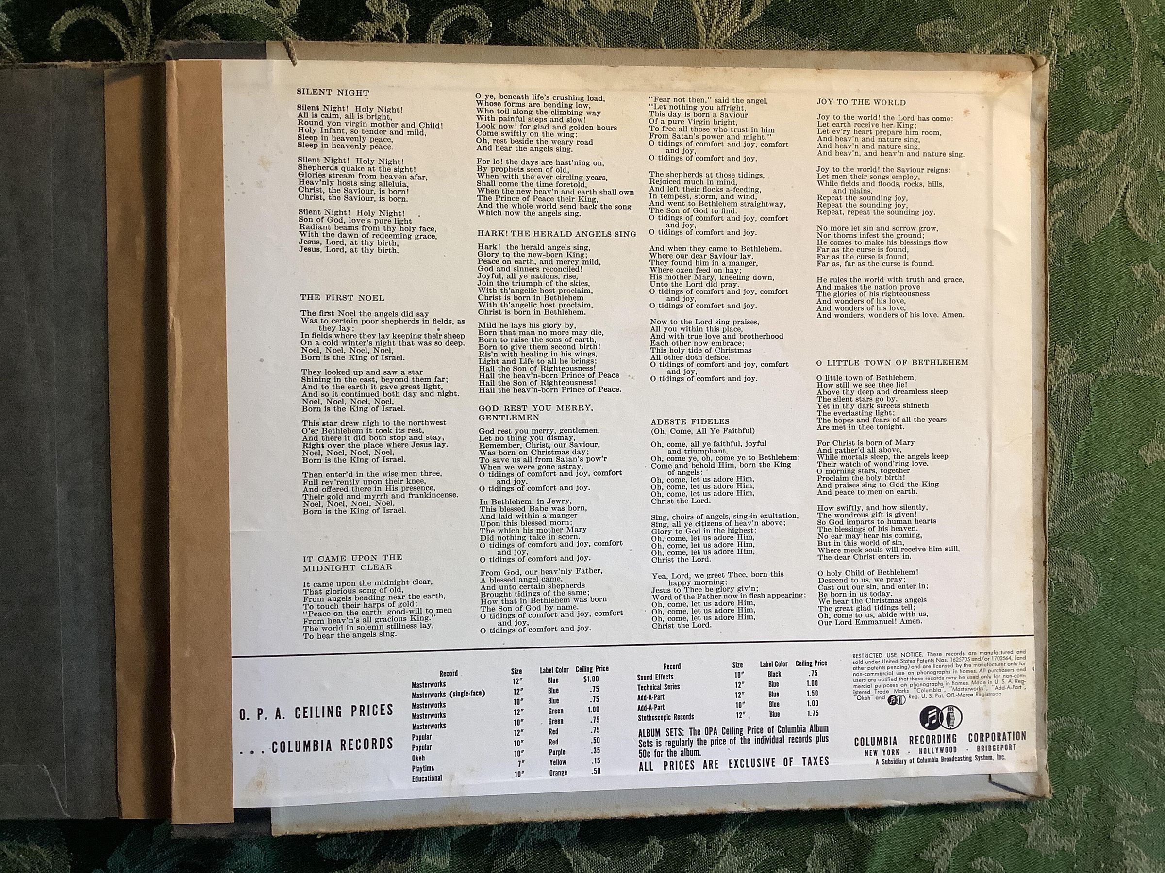 Inside back cover printed with lyrics to the carols, as well as advertising listing the pricing for Columbia Records' different recording lines.Create Date