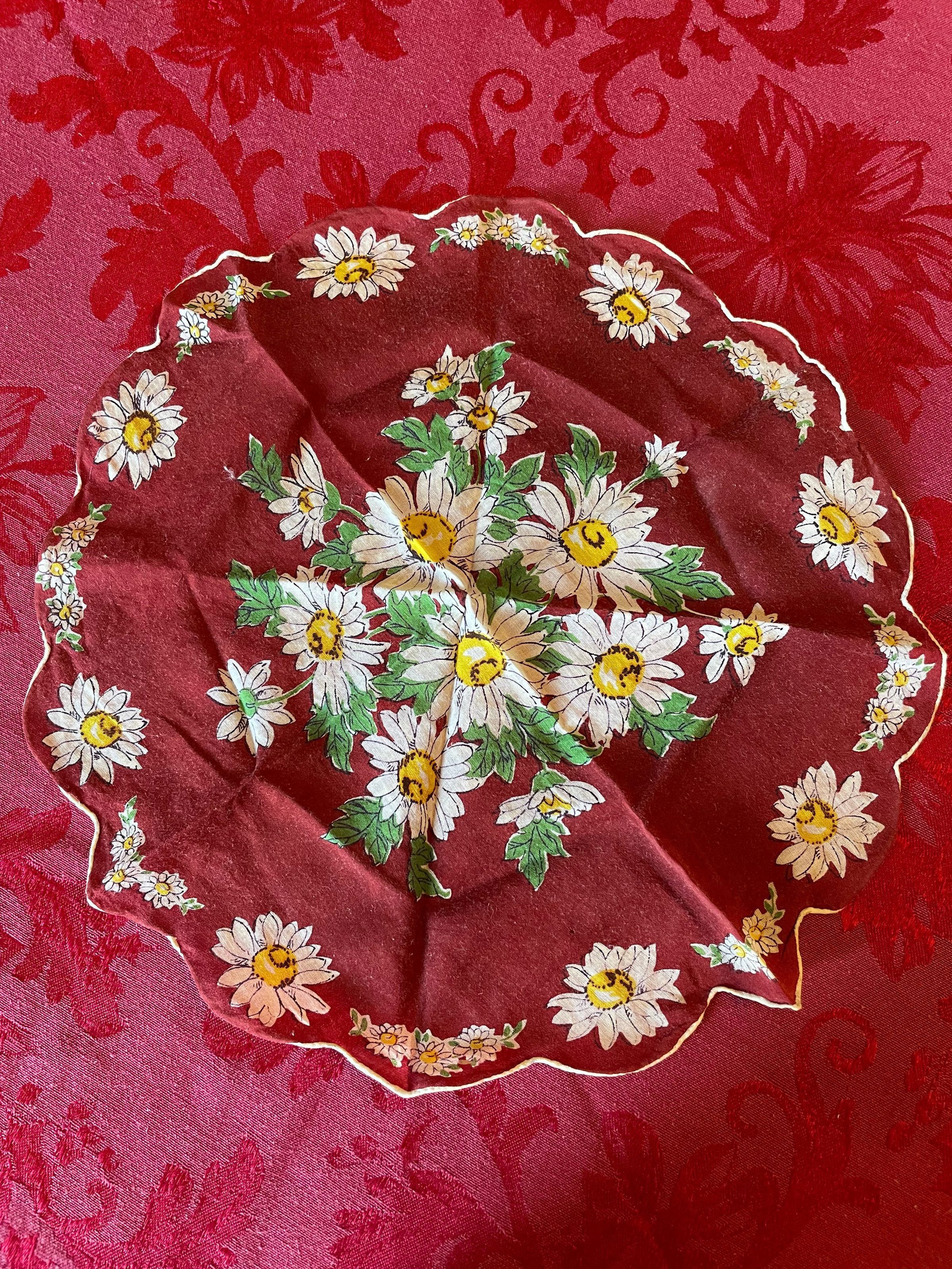 A circular maroon handkerchief with a daisy pattern decorating both the center and border. It would’ve been folded in a triangular manner and been kept in the pocket of a blouse or blazer. There’s also a thin white trim on the outer edge.Color