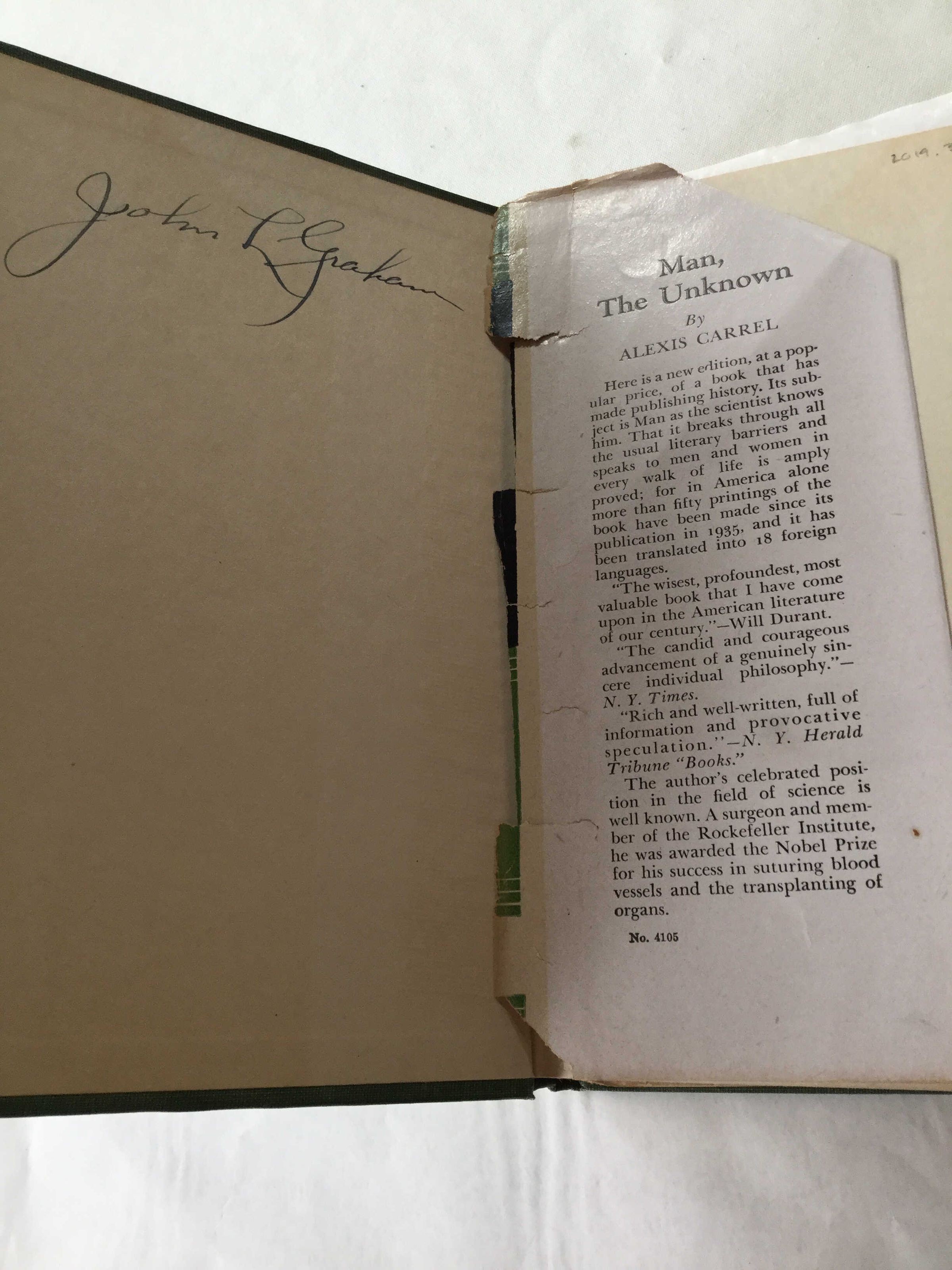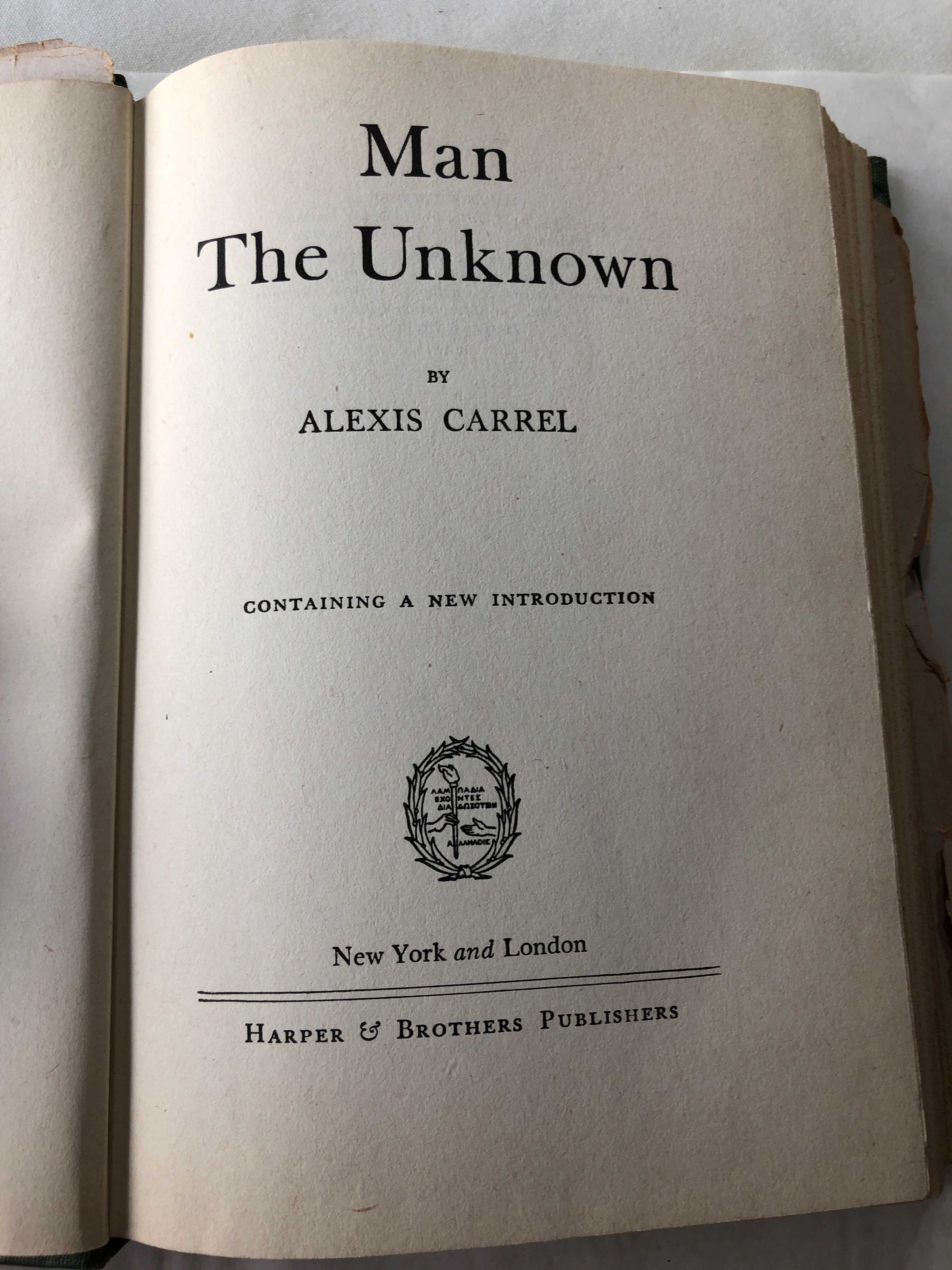 Man, the Unknown (L'Homme, cet inconnu) is a best-selling[1] 1935 book by Alexis Carrel in which he endeavours to outline a comprehensive account what is known and, more importantly, unknown of the human body and human life. The book elucidates problems of the modern world and possible routes to a better life for human beings. It is specifically known for its advocacy of eugenics and euthanasia. -WikipediaInscription/Signature/Marks