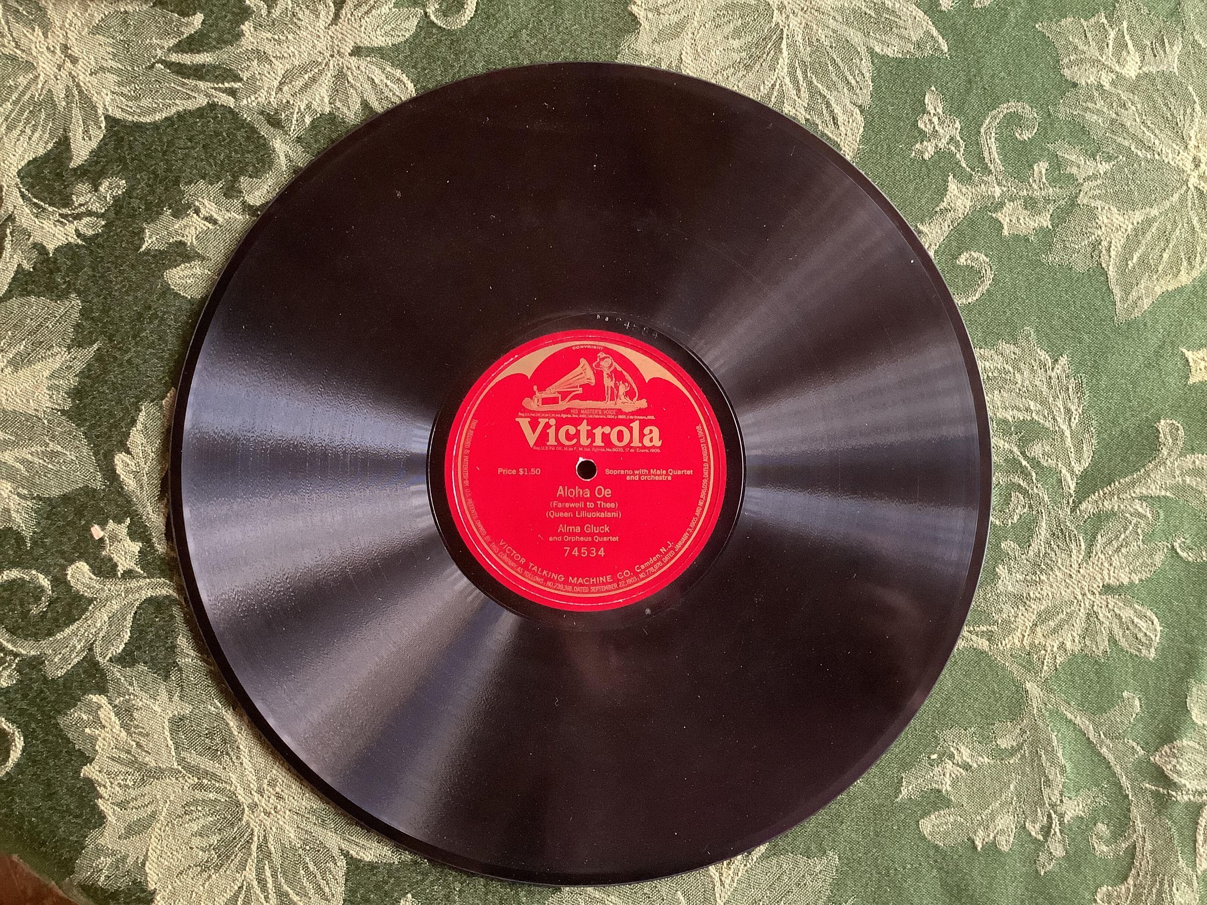 Victrola record. Aloha Oe (Farewell to Thee), Queen Liliuokalani. Soprano with Male Quartet and Orchestra. Alma Gluck and Orpheus Quartet. 74534.Create Date