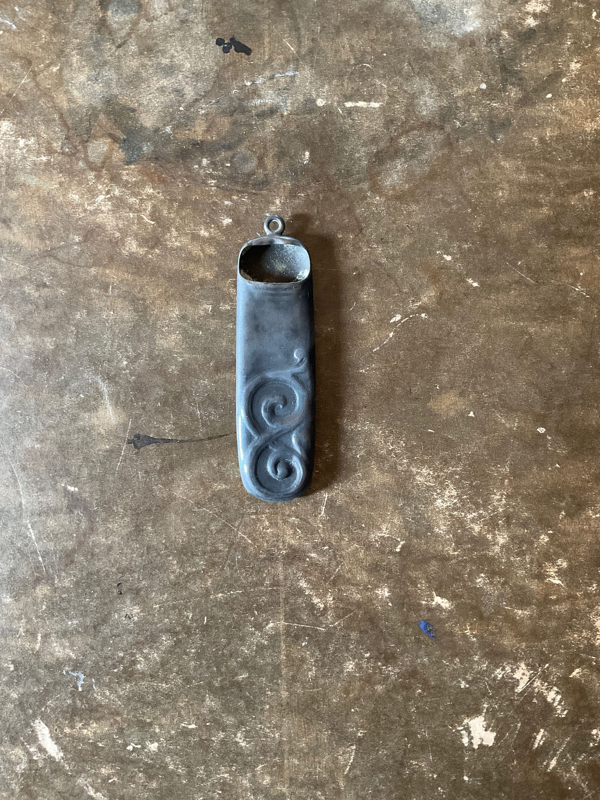 A metal holder of some sort that has a circular loop at the top. Looks like it could be hung somewhere, a necklace, a keychain, etc. The metal tube has a spiral pattern at the bottom.Collection