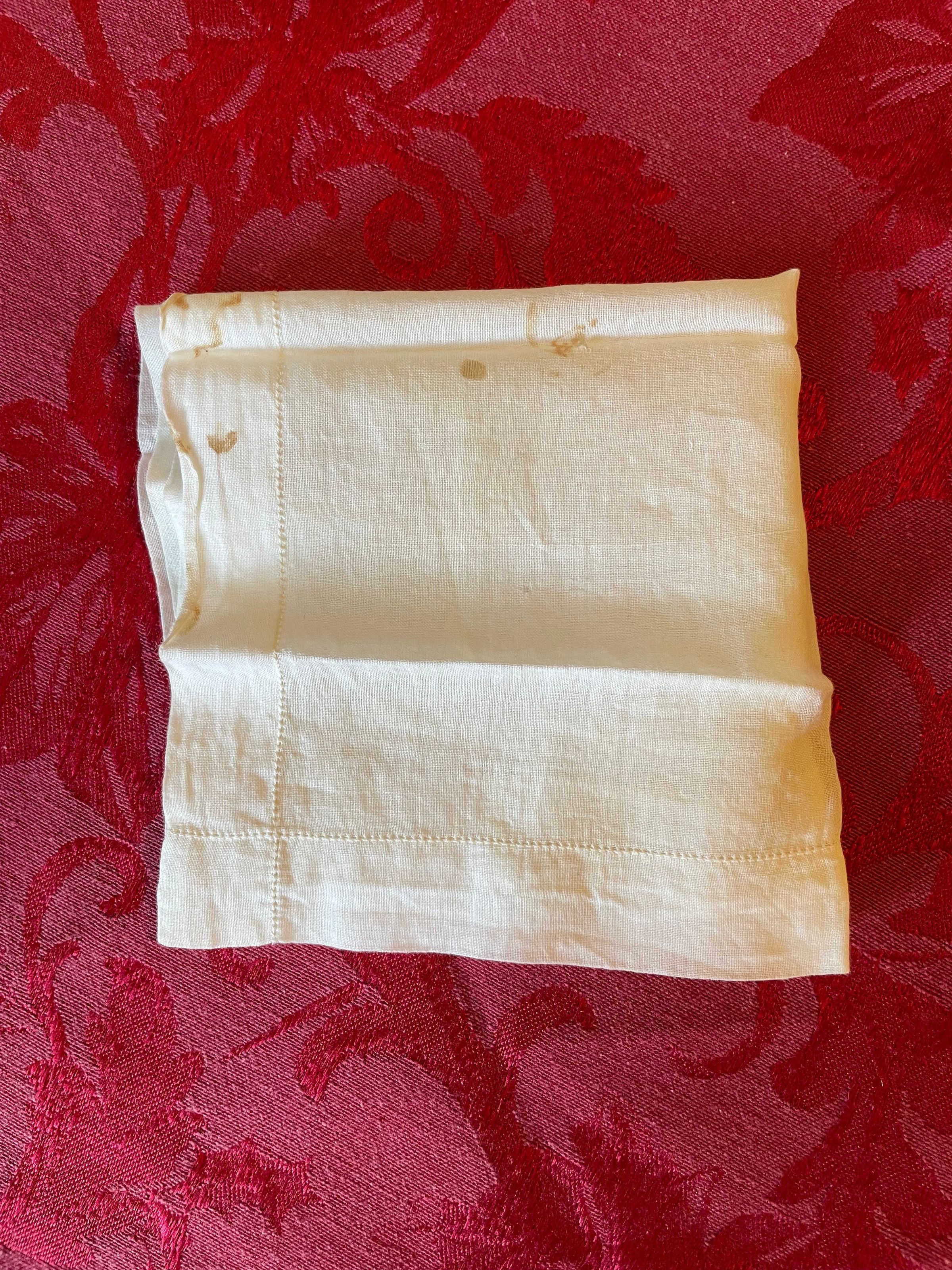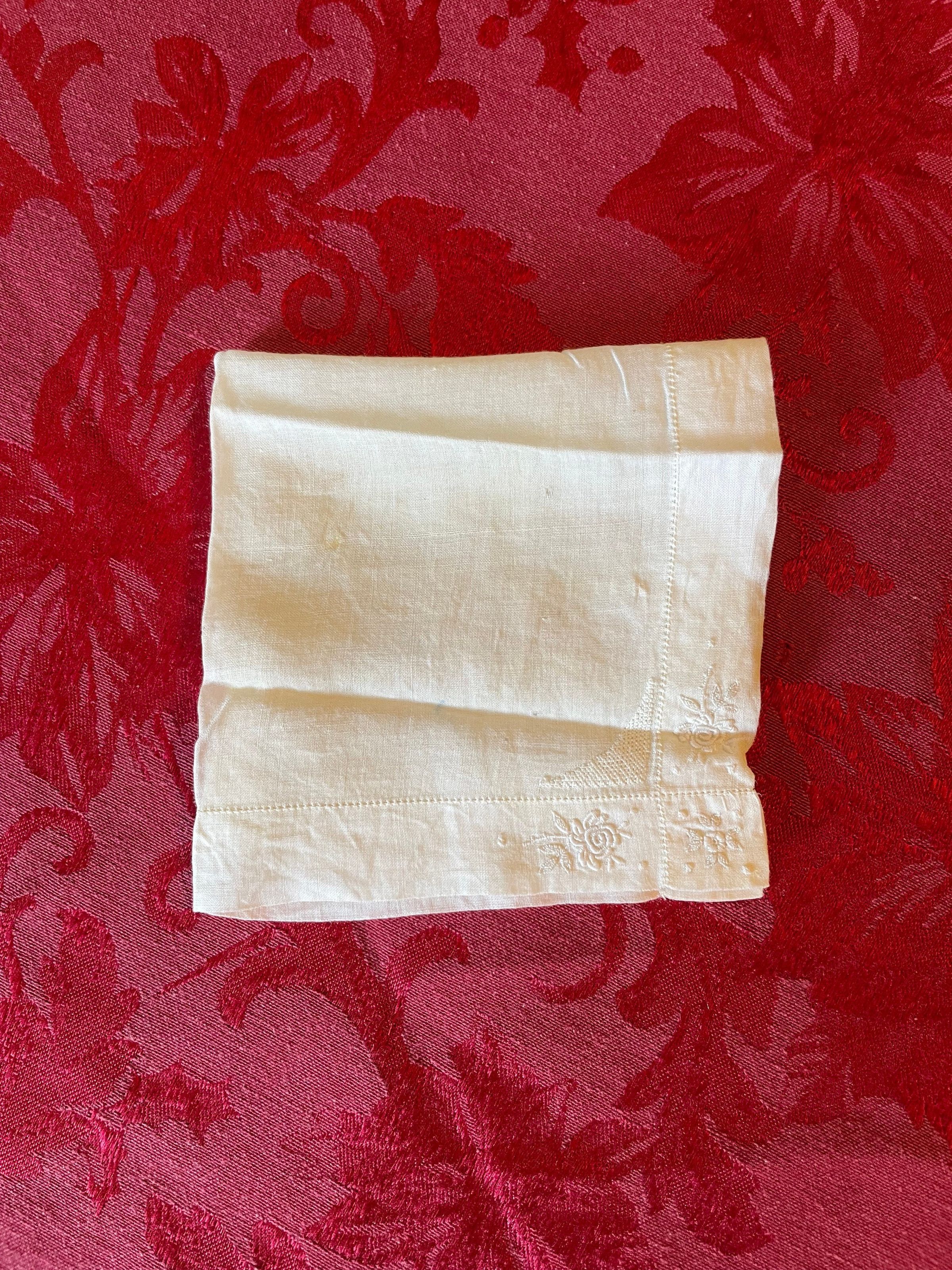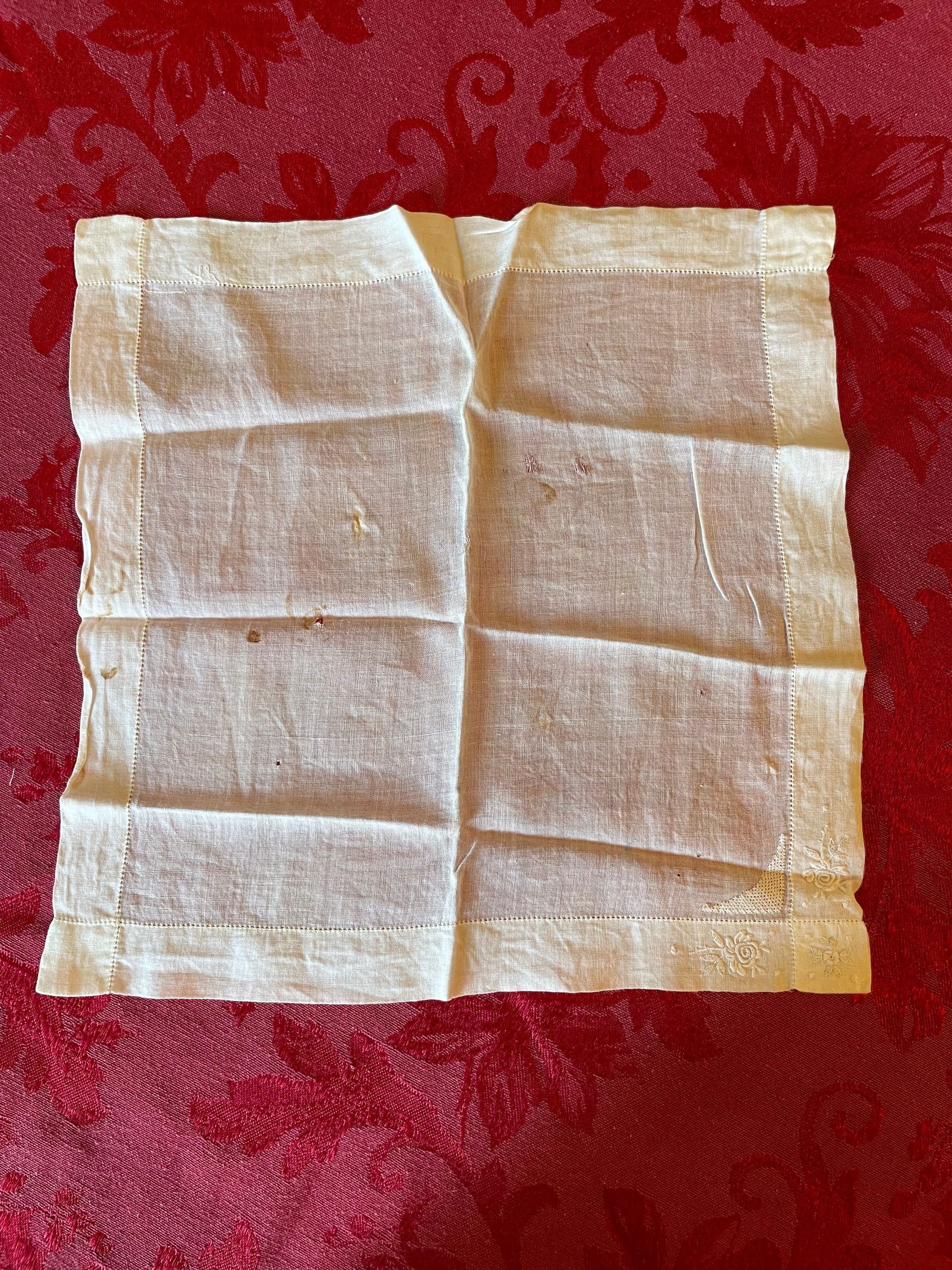A white handkerchief with fine stitching and roses embroidered onto the corners. There is some faint brown staining but otherwise it appears to be in good condition.Create Date