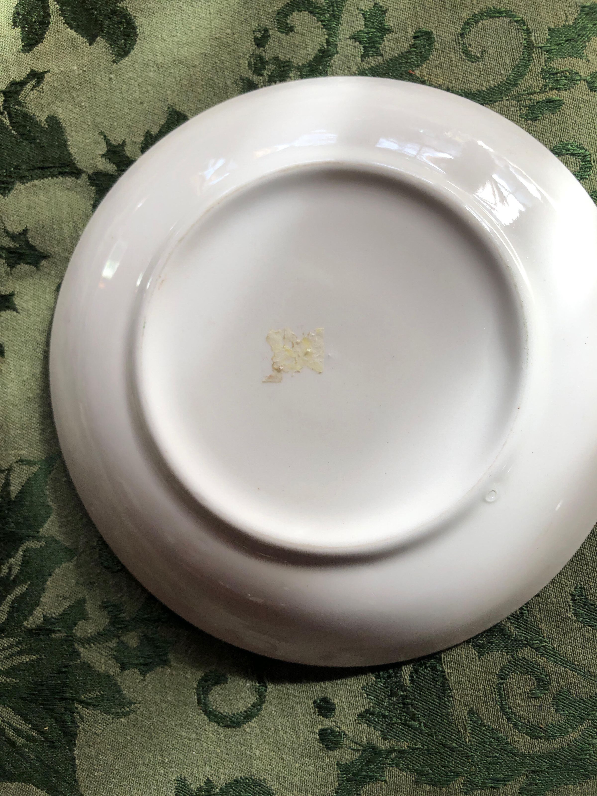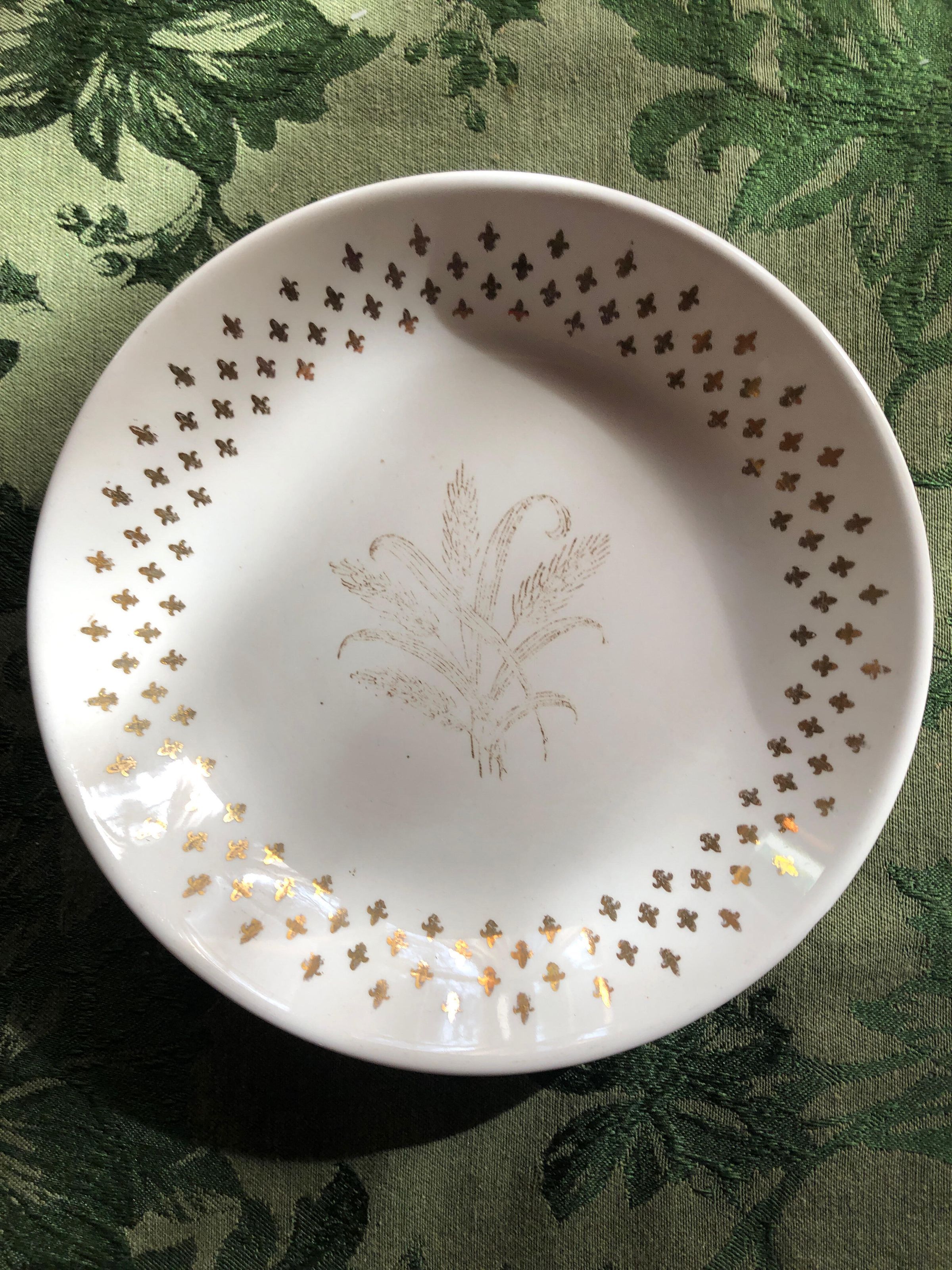 Cream colored shallow bowl decorated with 3-5 diagonal alternating rows of gold Fleur de Lis, center of bowl has a painted depiction of a bouquet of wheatInscription/Signature/Marks