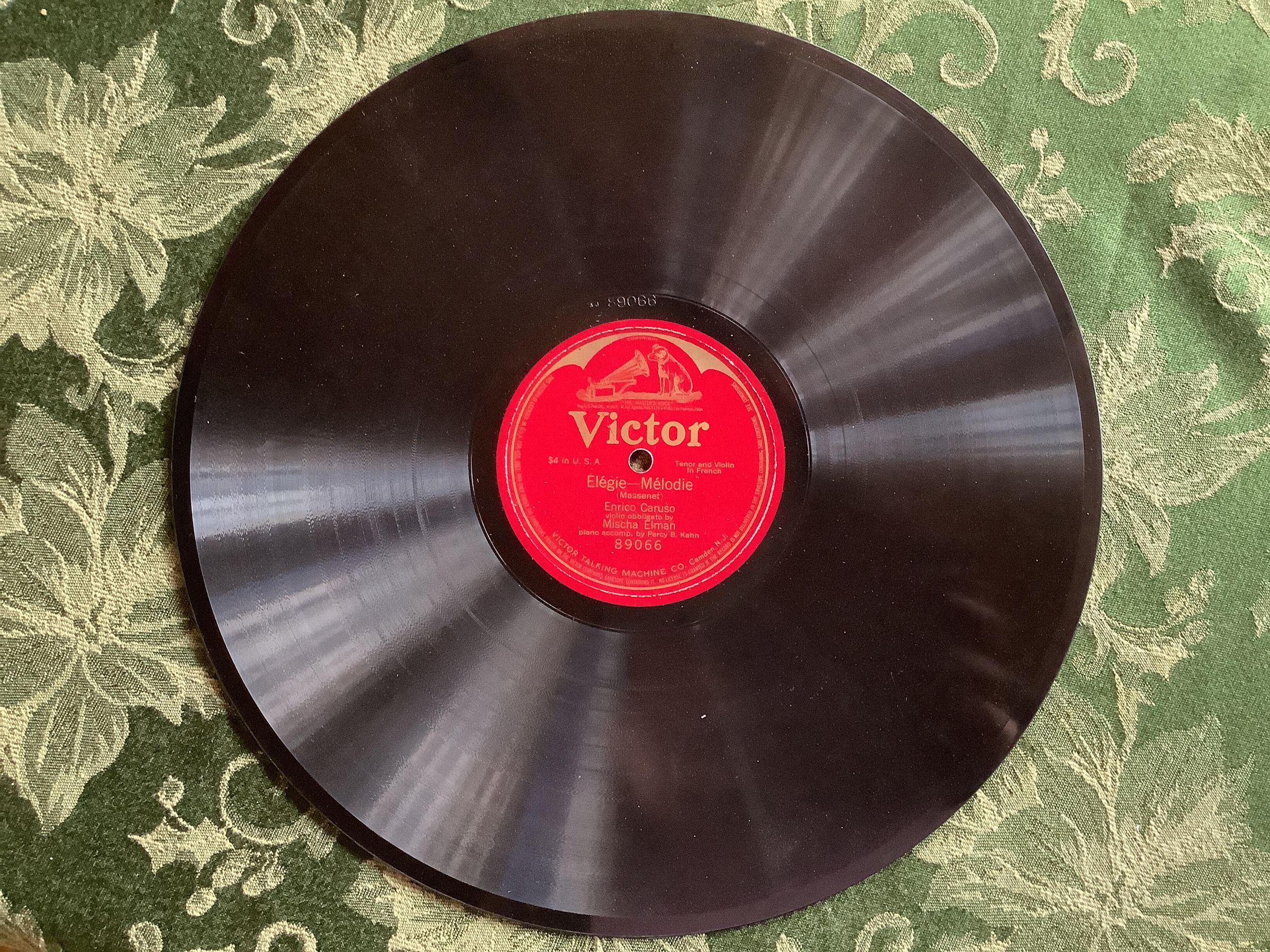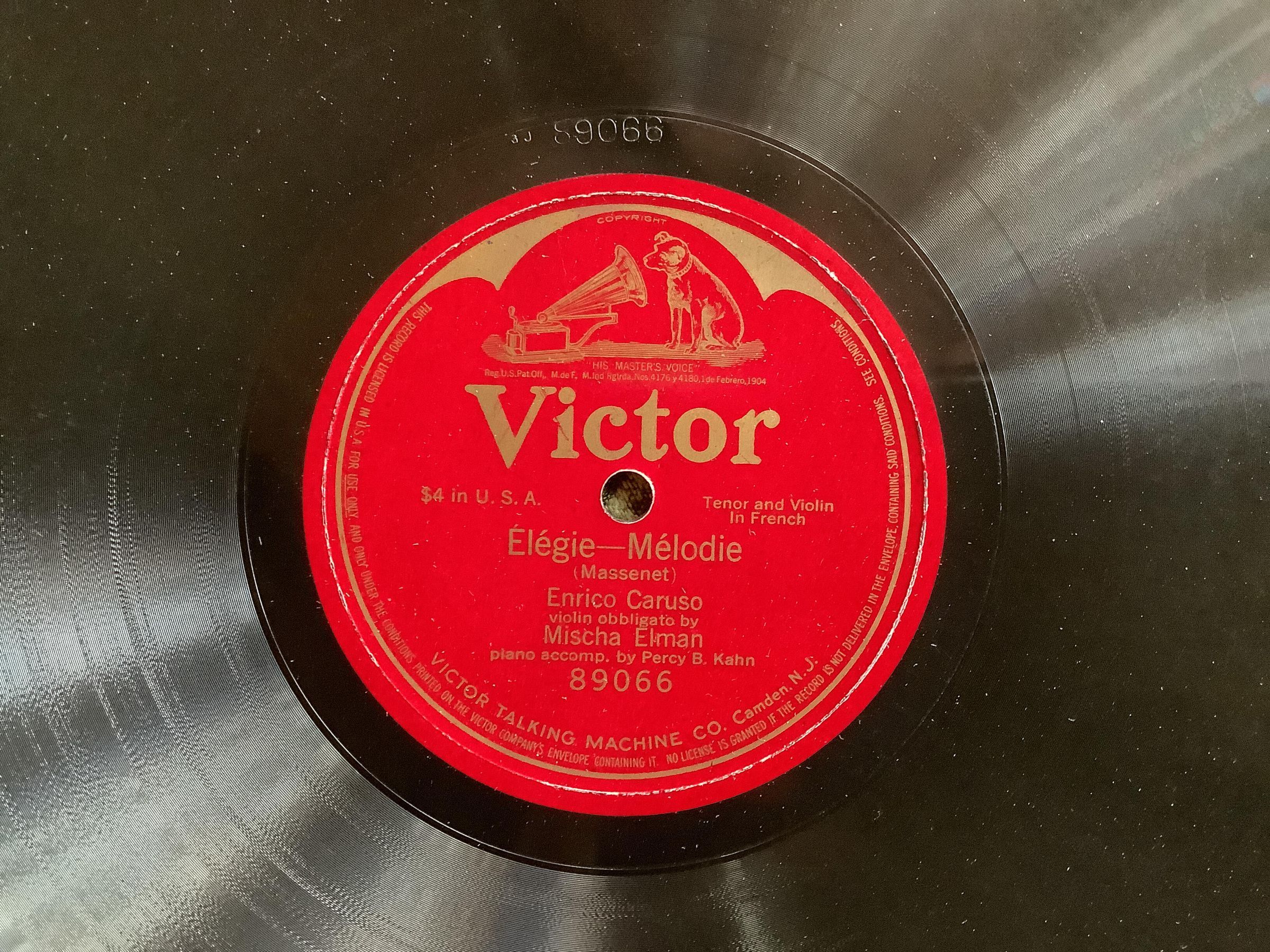 Victrola record. Élégie—Mélodie (Massenet). Tenor and Violin in French. Enrico Caruso, violin obbligato by Mischa Elman, piano accompaniment by Percy B. Kahn. 89066.
