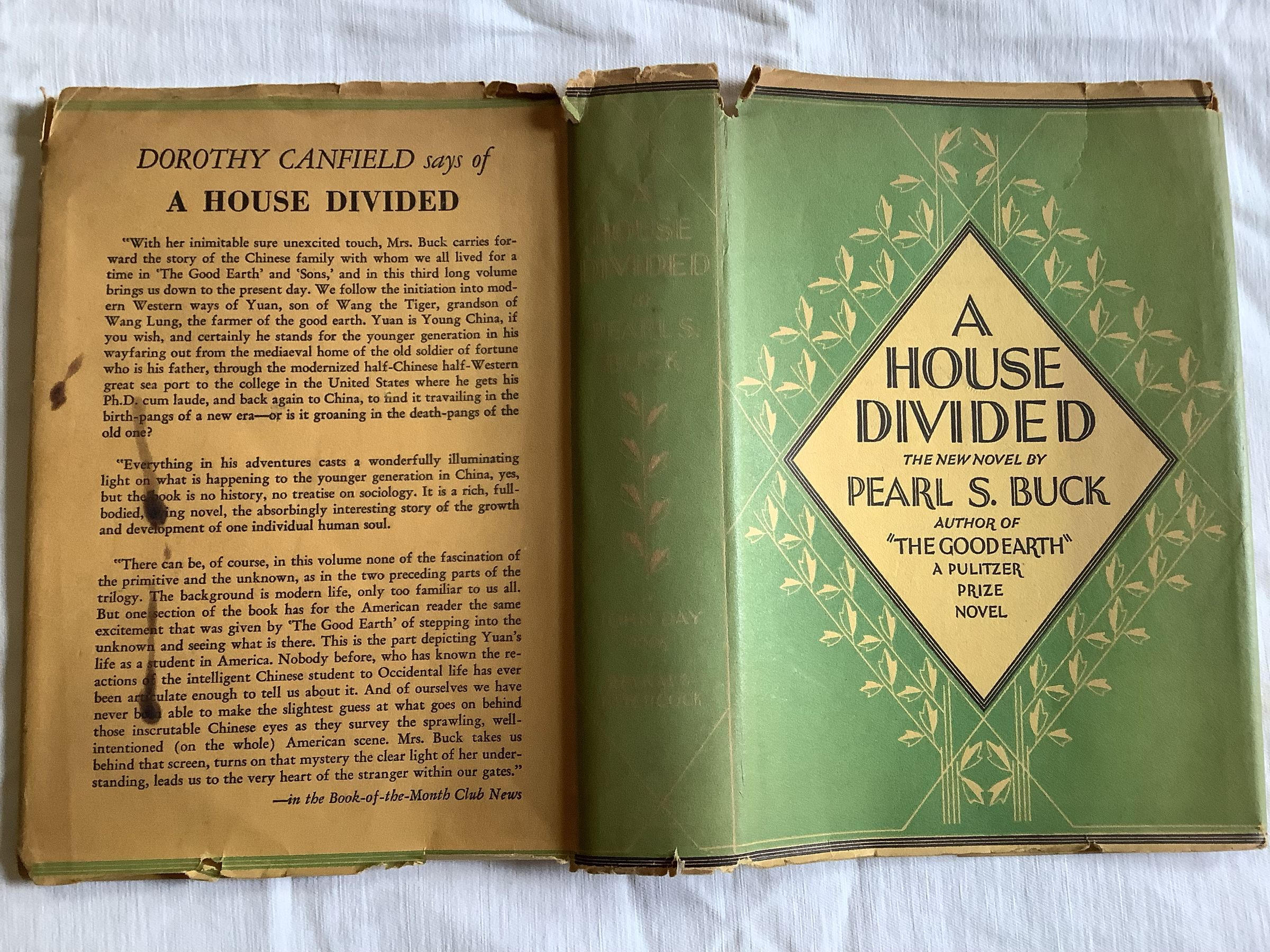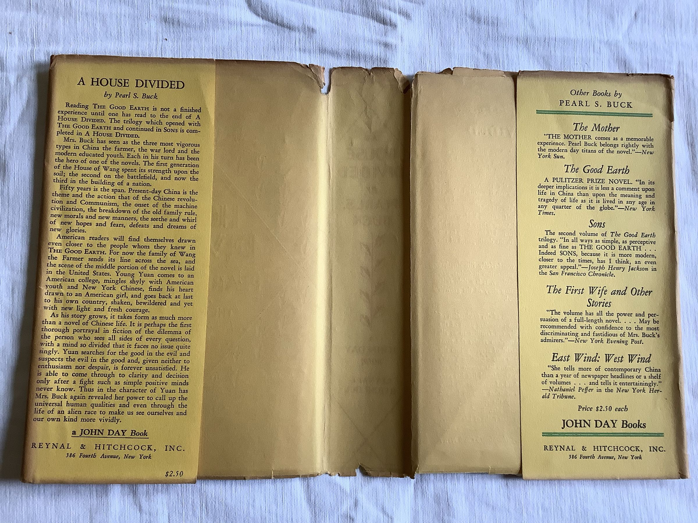 Historical fiction novel that centers on the third generation of Wang Lung's family, focusing particularly on his grandson Wang Yuan. It is the third and final book in The House of Earth trilogy, preceded by Sons. The novel is a powerful portrayal of China in the midst of revolution. Wang Yuan is caught between the opposing ideas of different generations. After 6 years abroad, Yuan returns to China in the middle of a peasant uprising. His cousin is a captain in the revolutionary army, his sister has scandalized the family by her premarital pregnancy, and his warlord father continues to cling to his traditional ideals. It is through Yuan's efforts that a kind of peace is restored to the family.-- WorldCatInscription/Signature/Marks