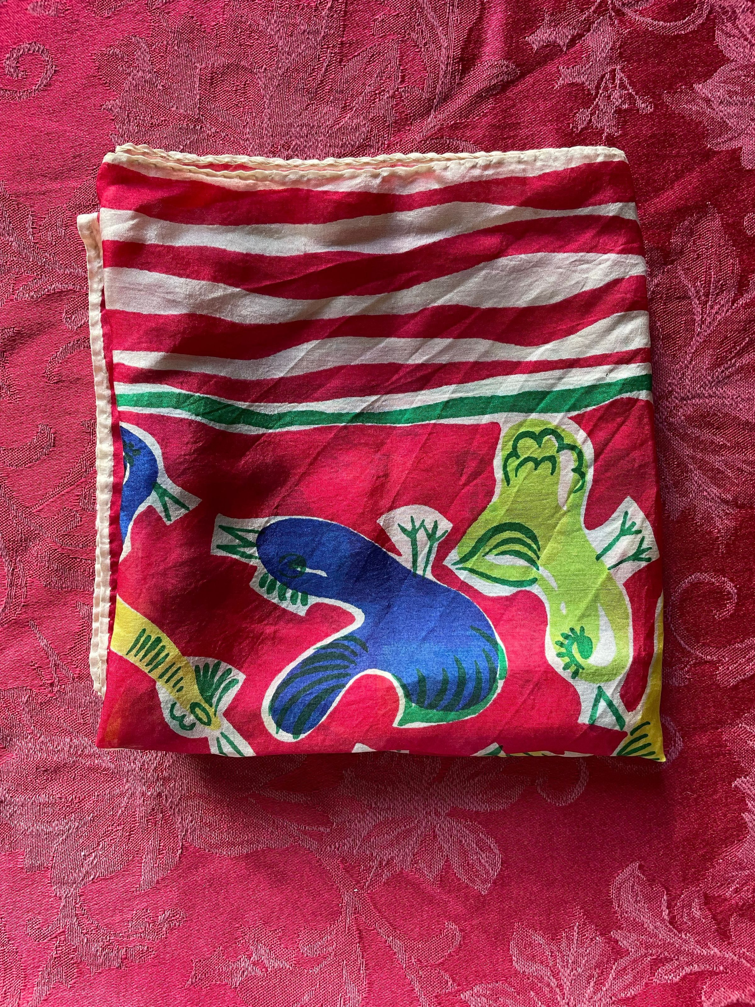 A red patterned scarf with different birds on it in yellow, green, and blue.
