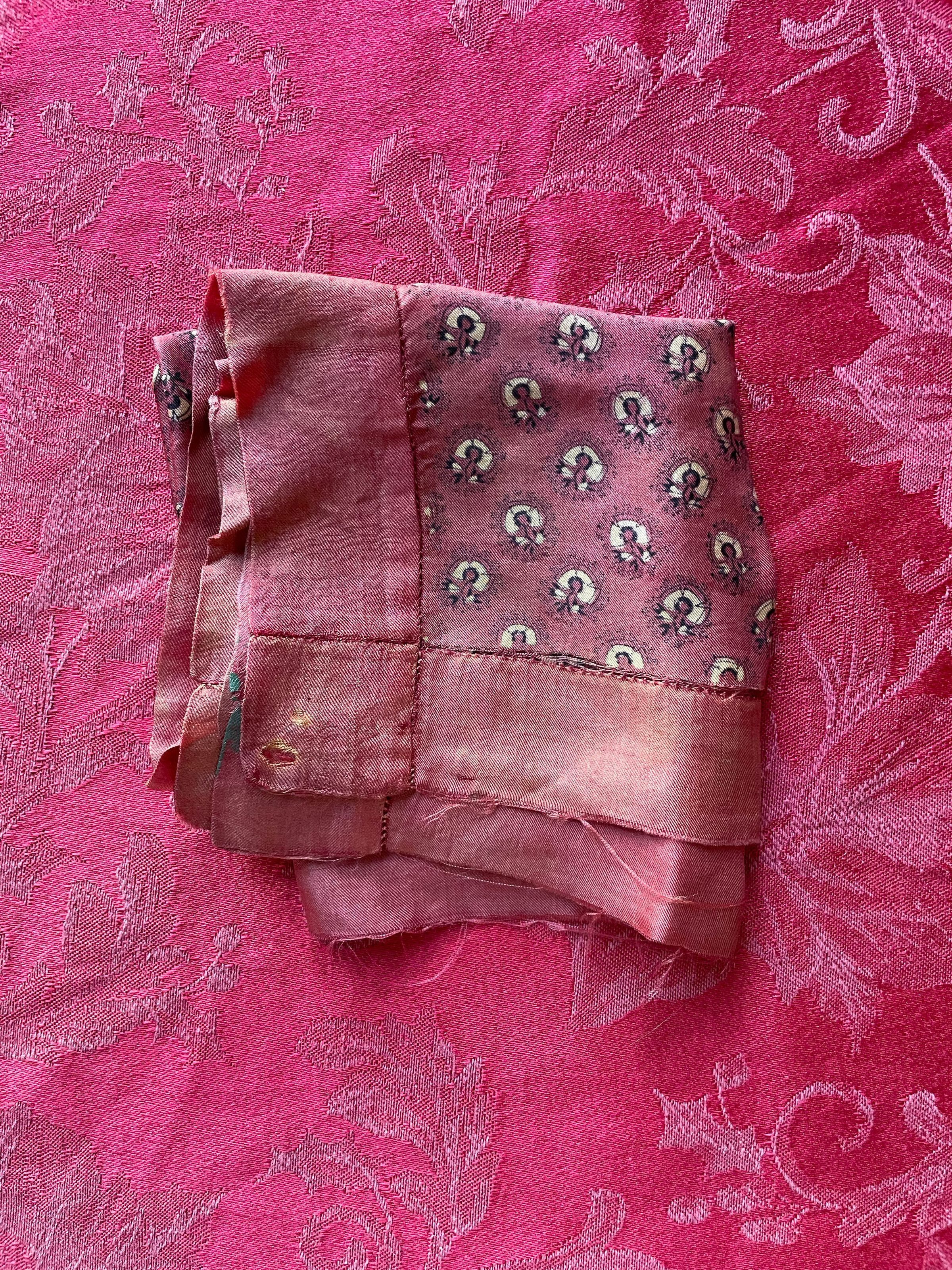 A maroon scarf with an indiscernible pattern littered throughout. It could be a flower, a person, or some other kind of image. There’s a stitched border, followed by a patternless stretch of maroon lining the edges.Create Date