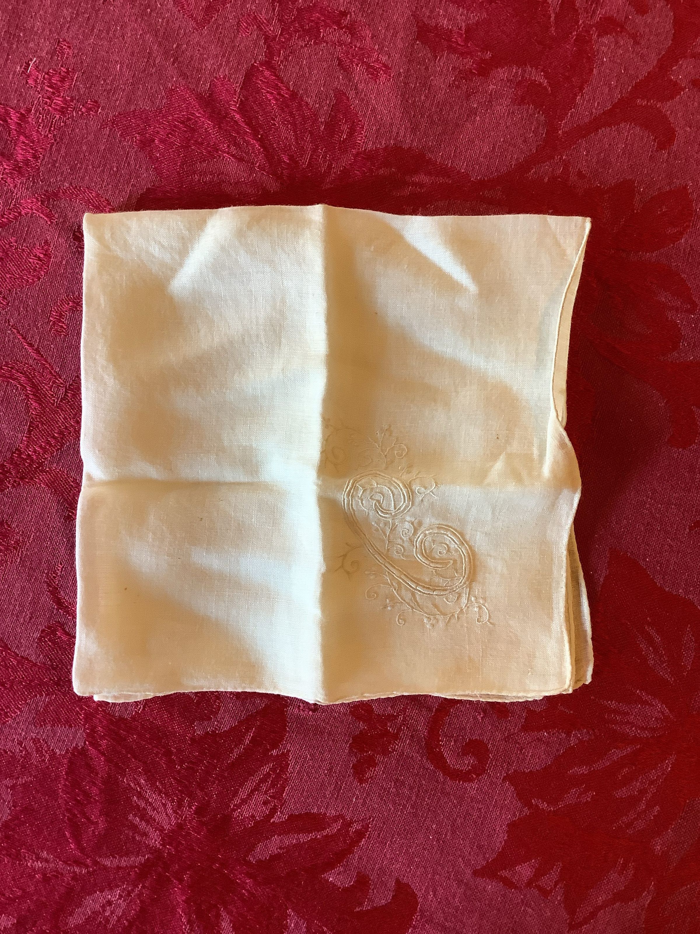A white embroidered handkerchief that’s been initiated “C” for Emelita Cohen.