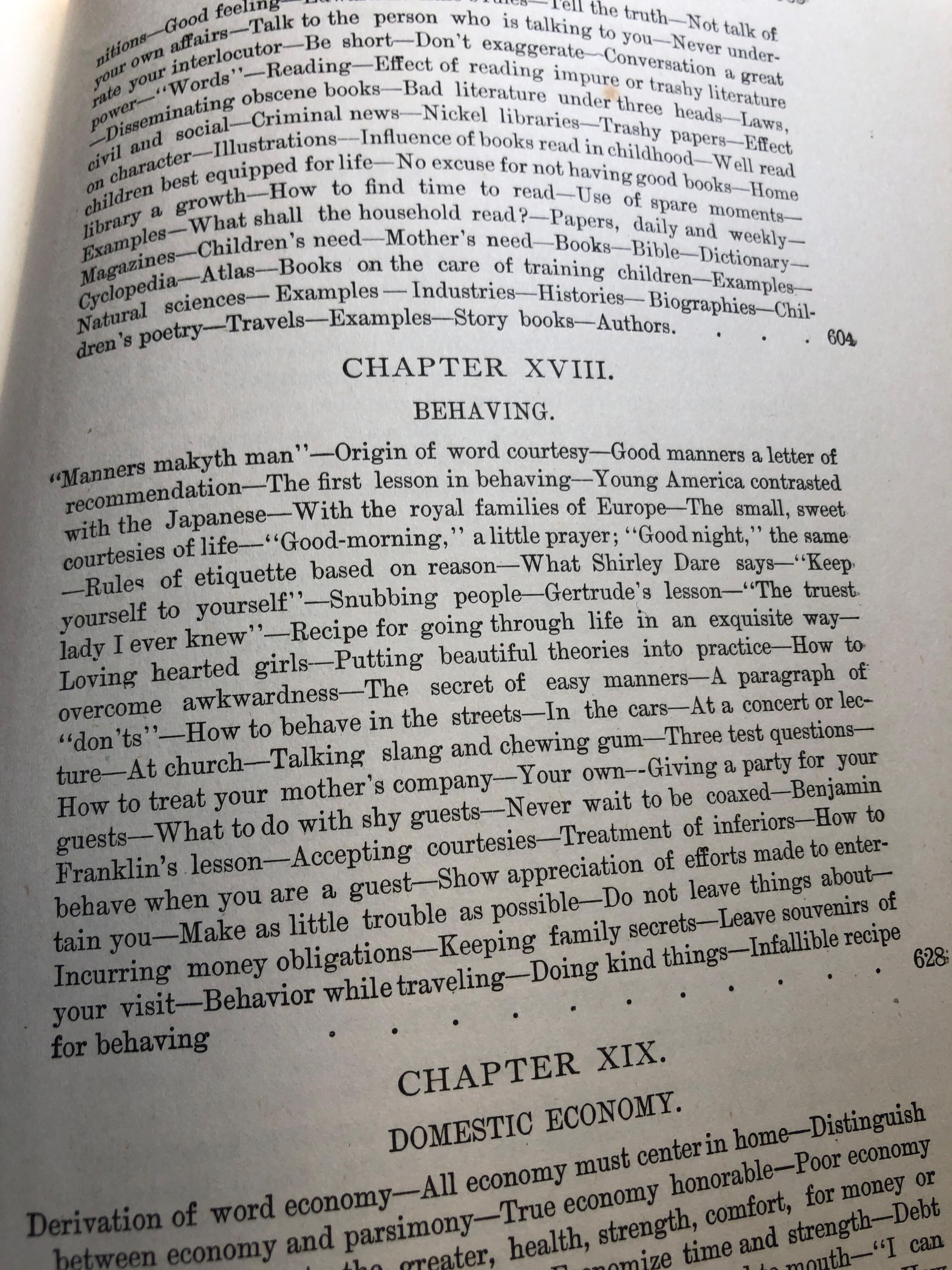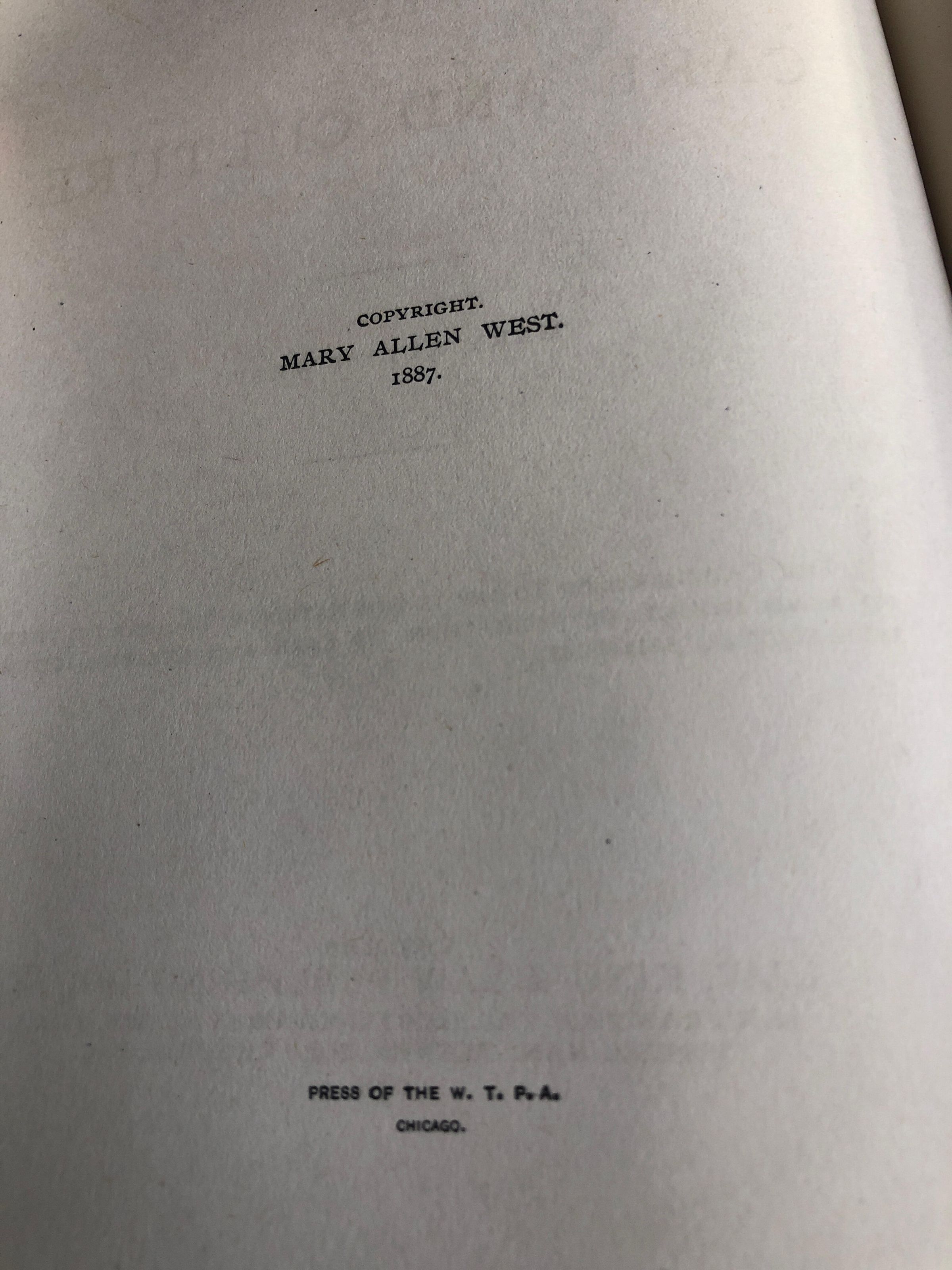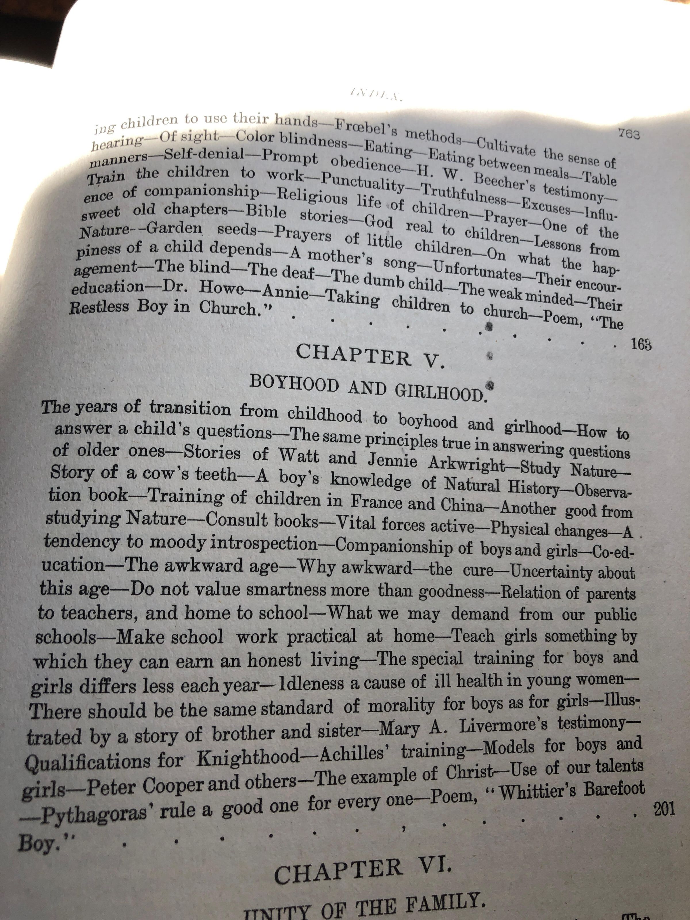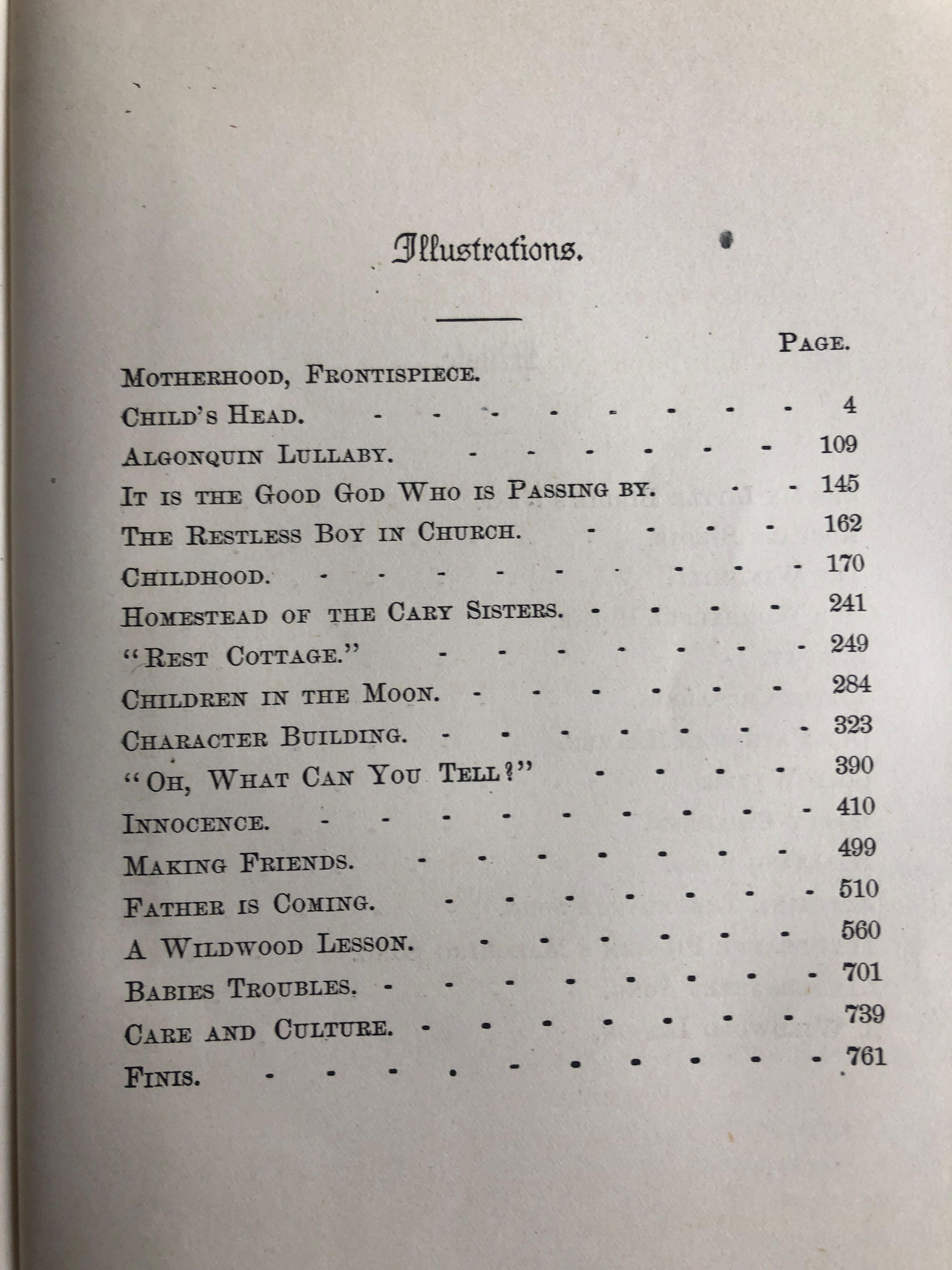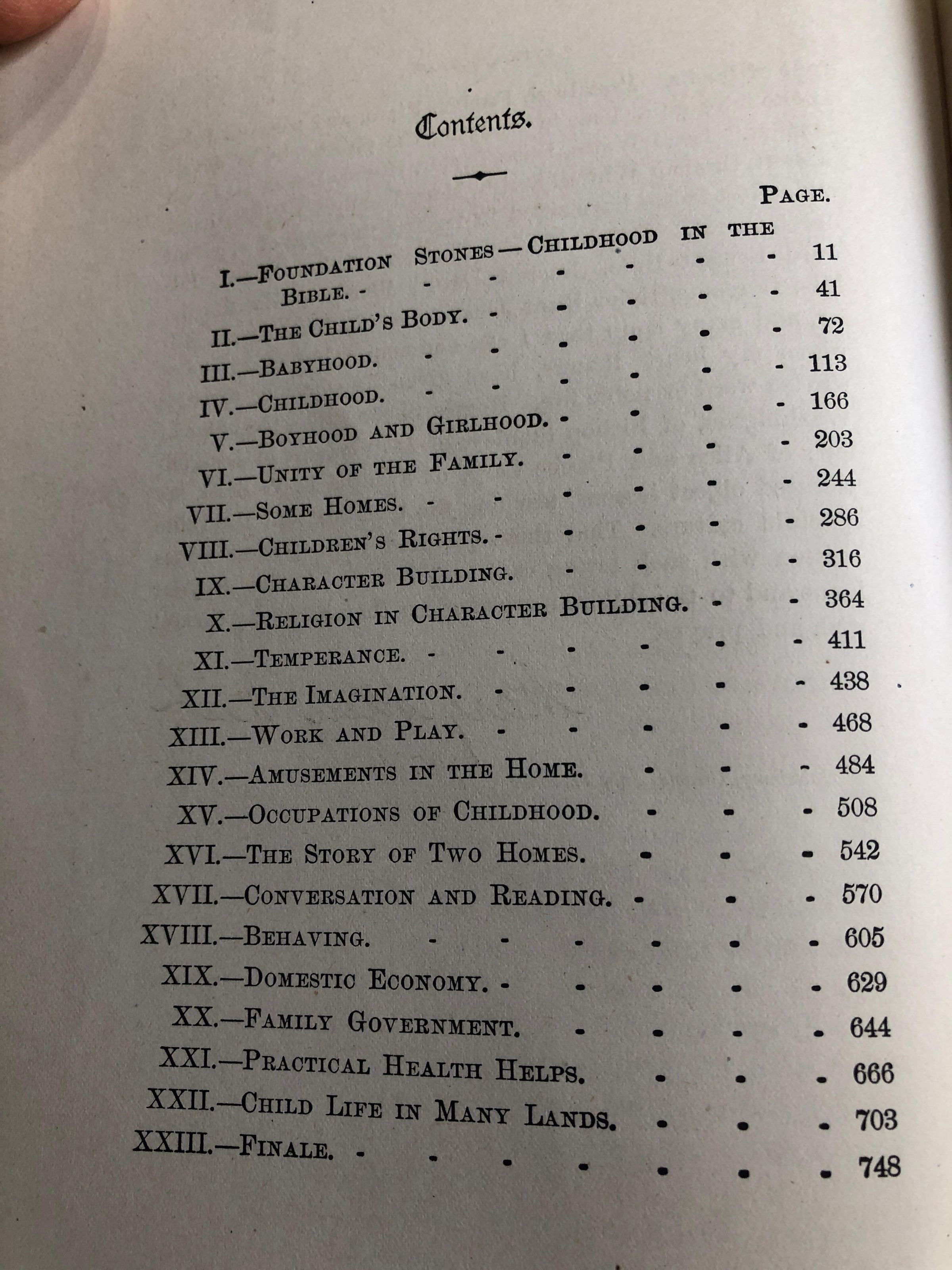 Parenting advice book. The contents were varied, including chapters on the child's body, babyhood, childhood, boyhood and girlhood, children's rights, work and play, amusements, behavior, domestic economy, family government, practical health hints, and other topics. -WikipediaInscription/Signature/Marks