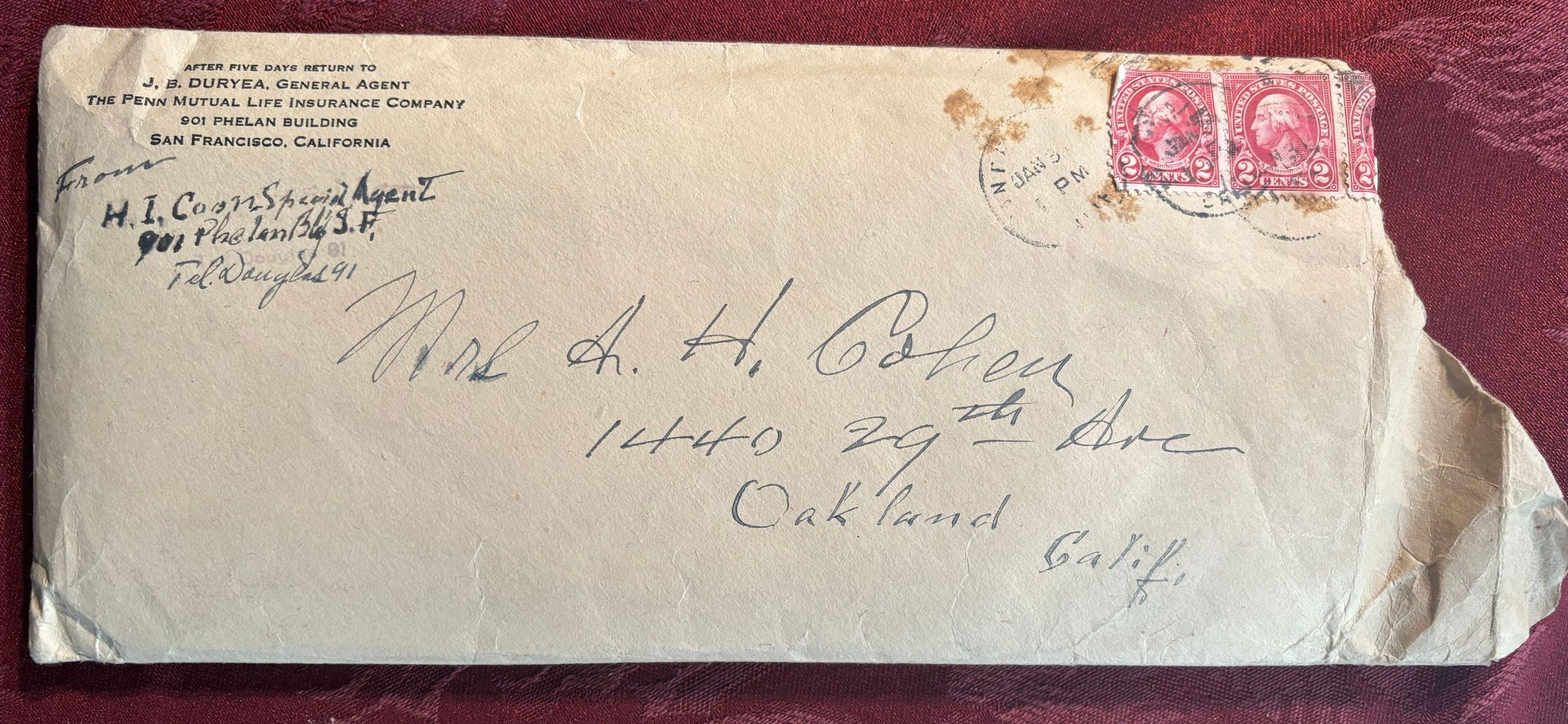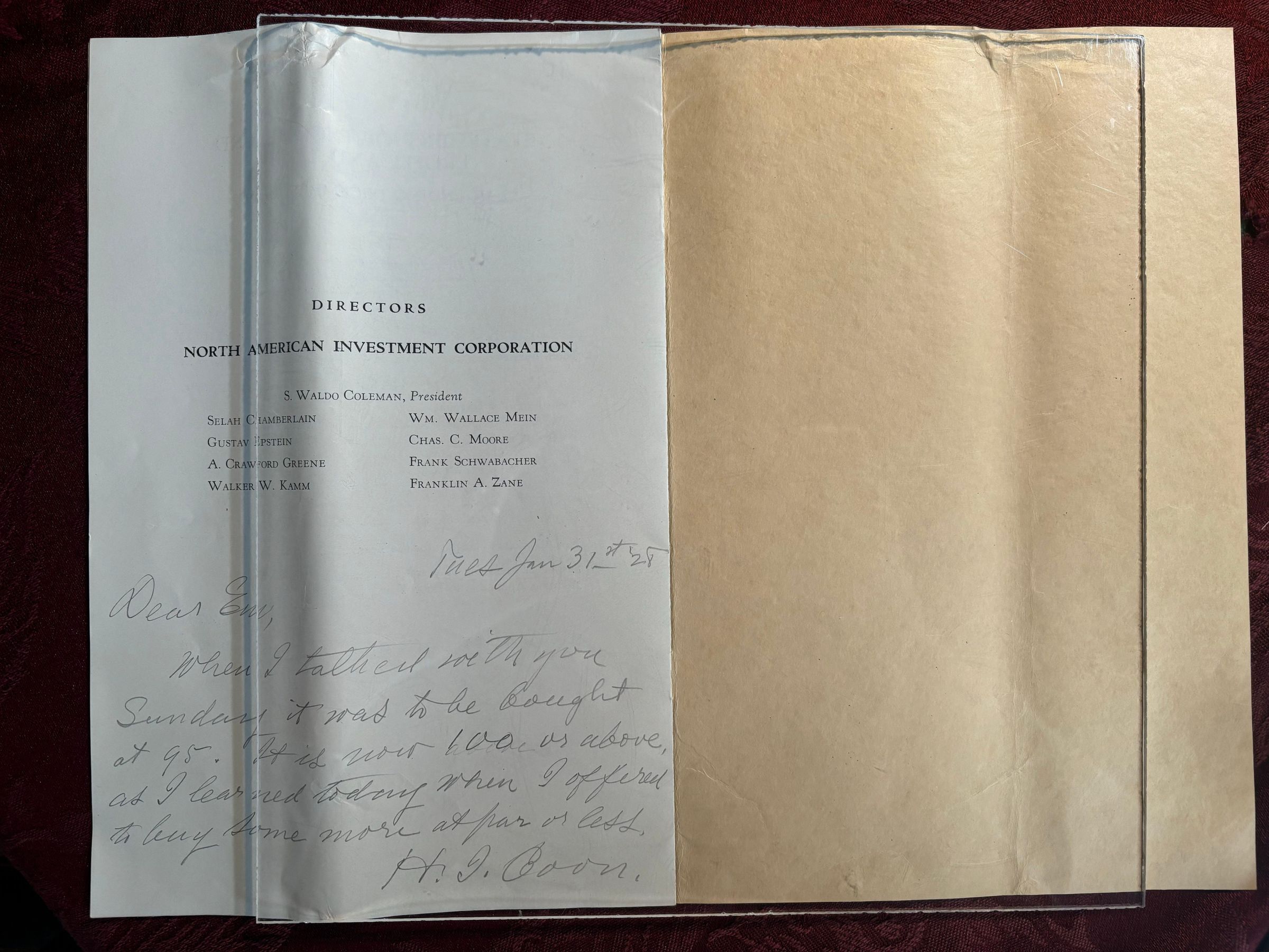 A envelope to "Mrs. A. H. Cohen" from the The Penn Mutual Life Insurance Company. Includes two pamphlets, "Second Annual Report of North American Investment Corporation" and "The Investment Trust." The envelope has a note that says it is from H. I. Coon, and a note from him in the back of one of the pamphlets. The contents are from 1927-1928. H I Coon was Emma's brother in law.Inscription/Signature/Marks