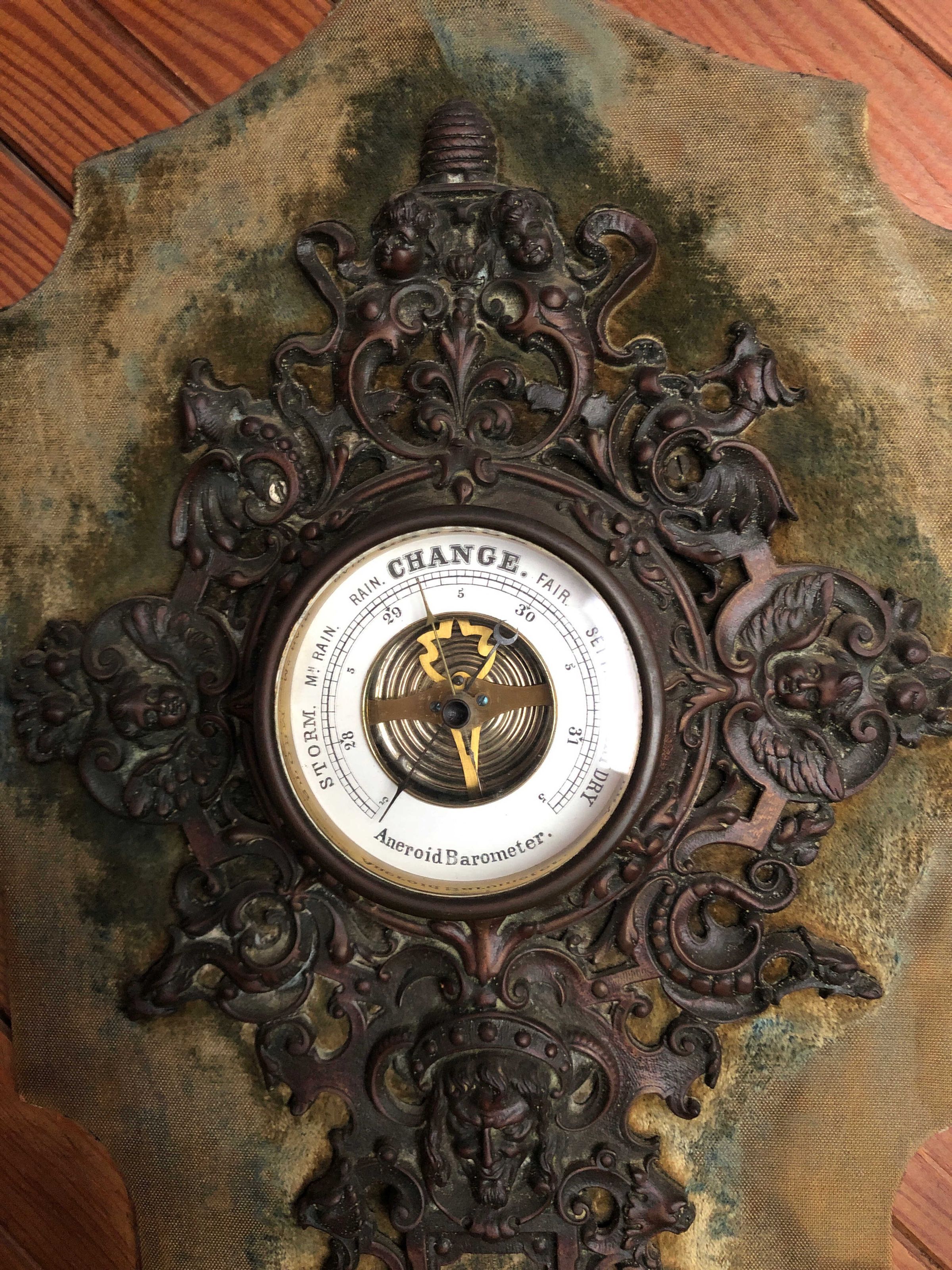 Brass barometer set in green velvet, brass is highly ornate with various cherubs and a face on top of the thermometer