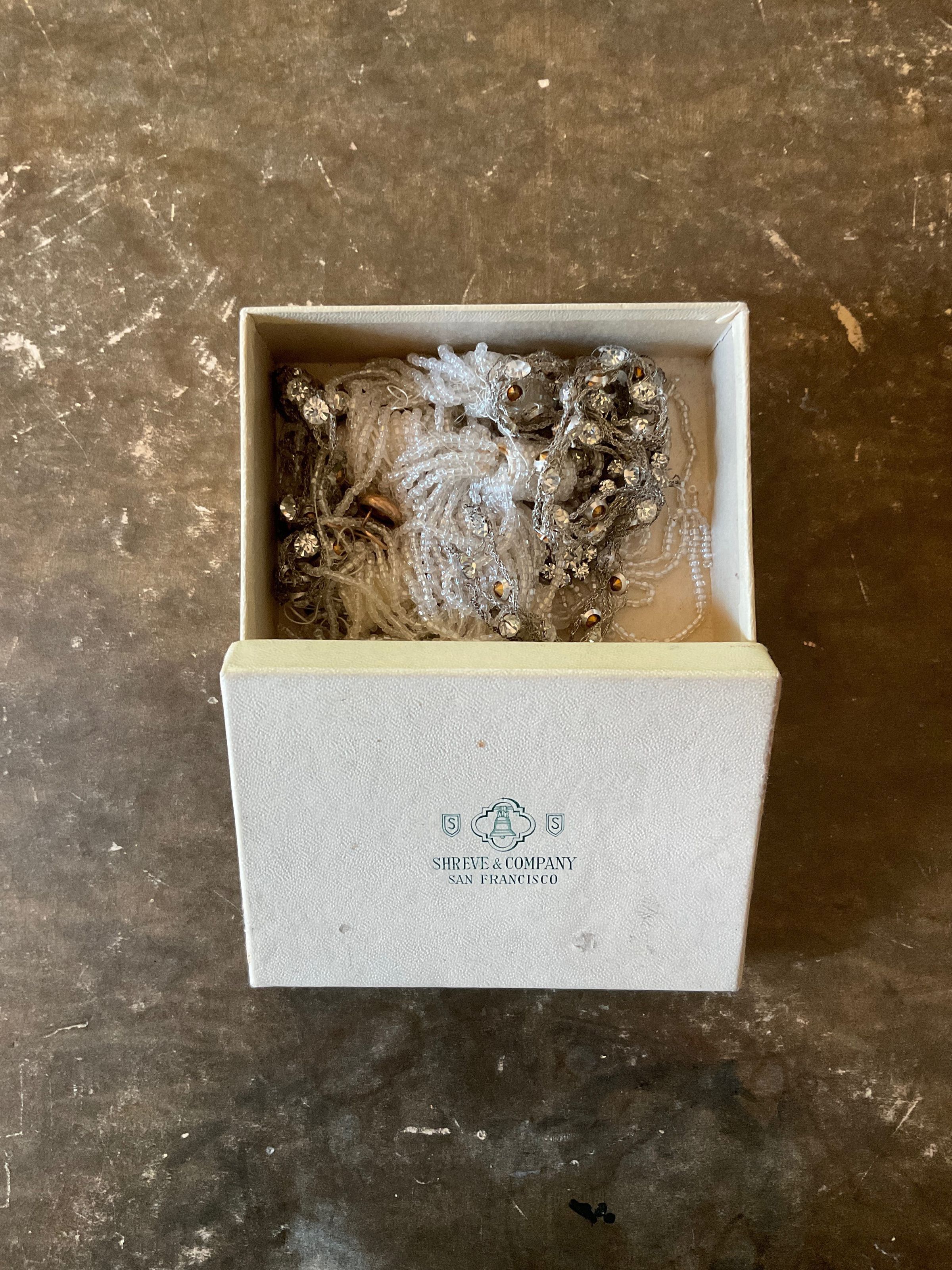 A Shreve & Company box filled with various small pieces of jewelry. There are five white beaded tassels. There are 3 braided silver strands with jewels intertwined. There is a flower made out of jewels. There are several loose beads a jewels in the box.Collection