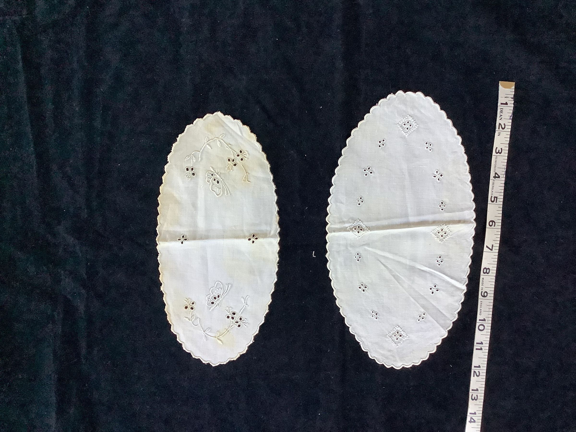 Two small embroidered oval decorative pieces. One has butterflies with drawn holes and the other has square designs with drawn holes
