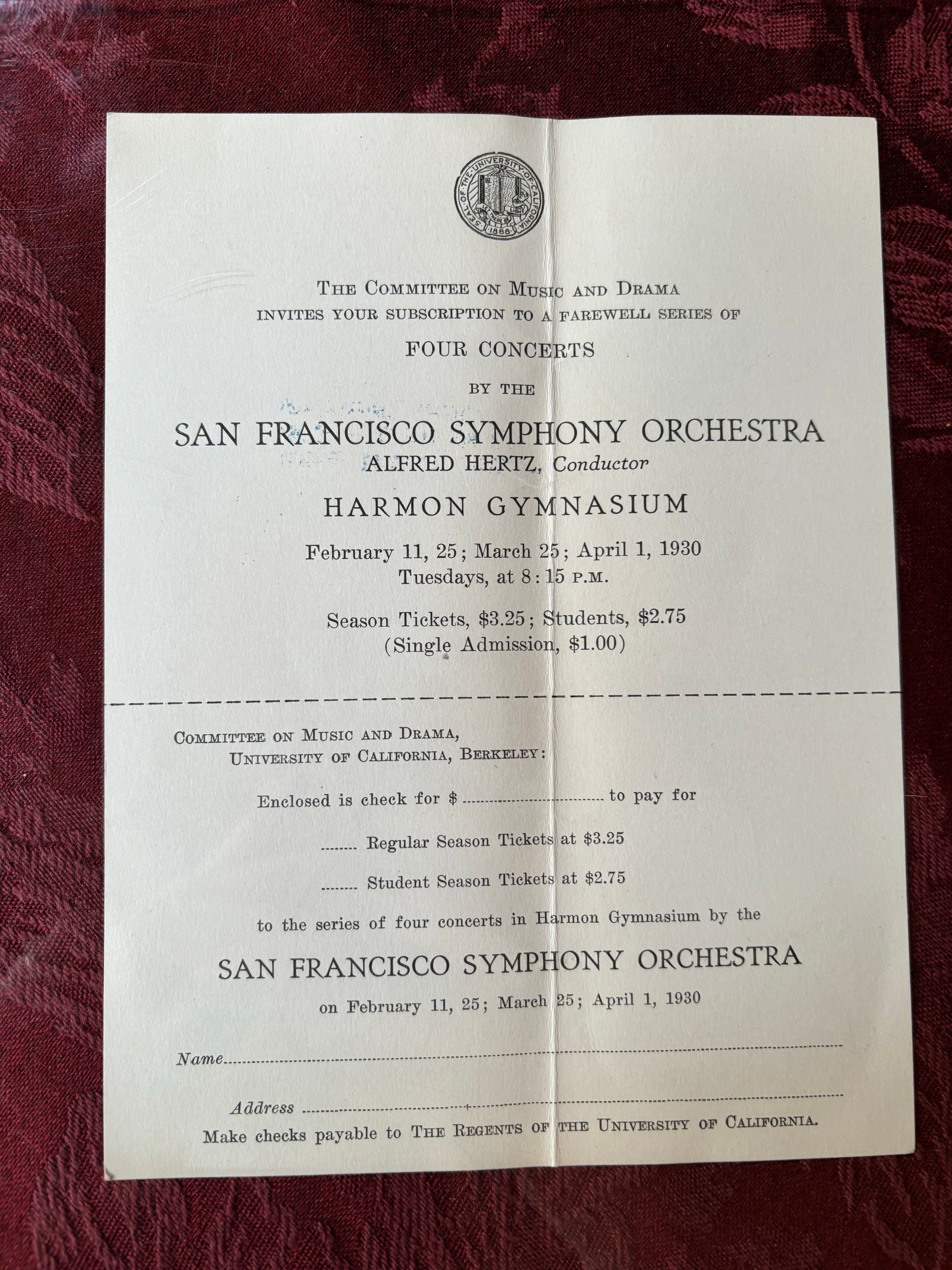This is an advertisement sent to Emelita Cohen, advertising the next San Francisco Symphony Orchestra. This is not from when Emelita was sick, but is stored within the same collection.Create Date