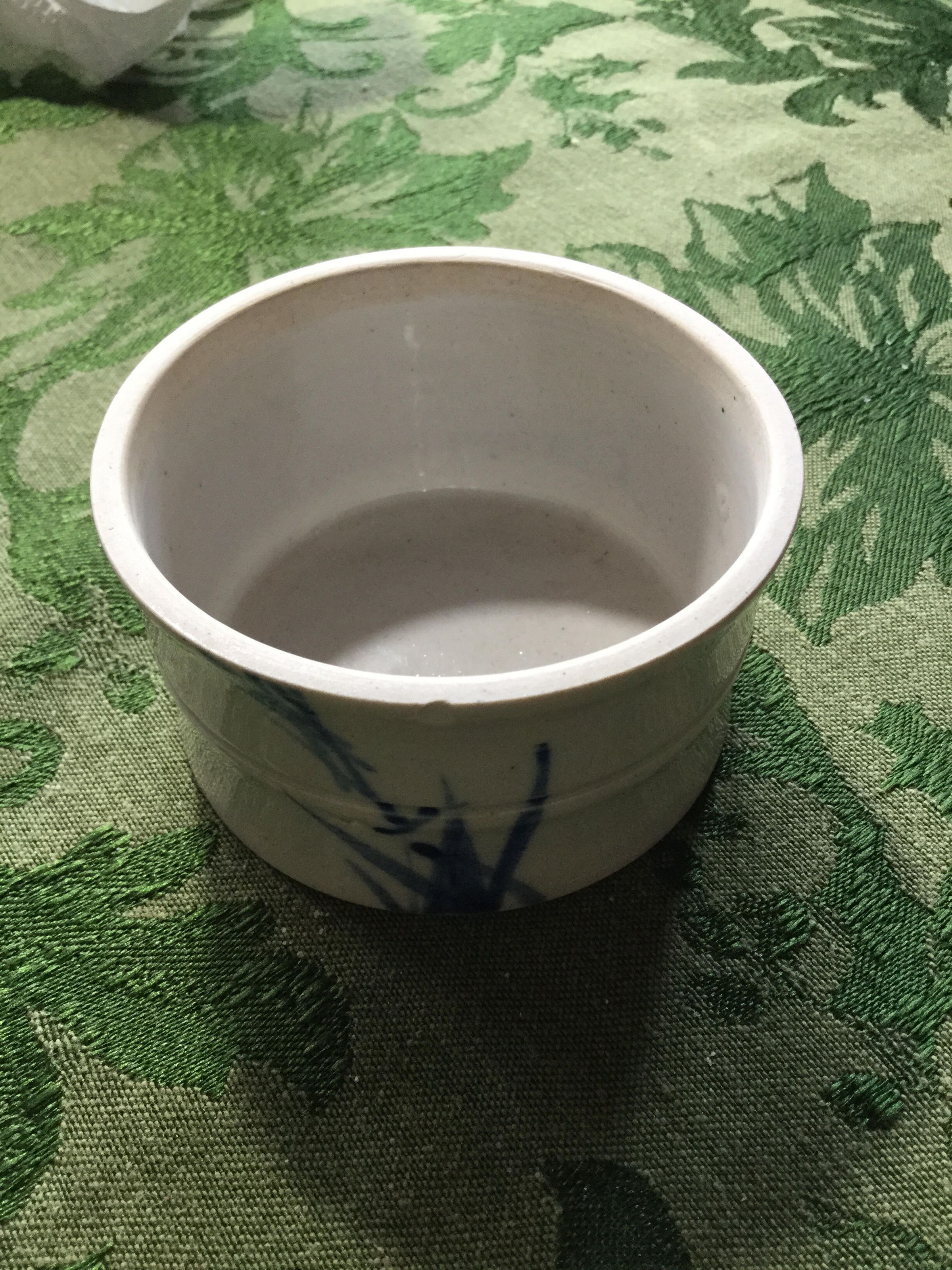 Small round white ceramic dish with subtle blue brushstrokes along the side
