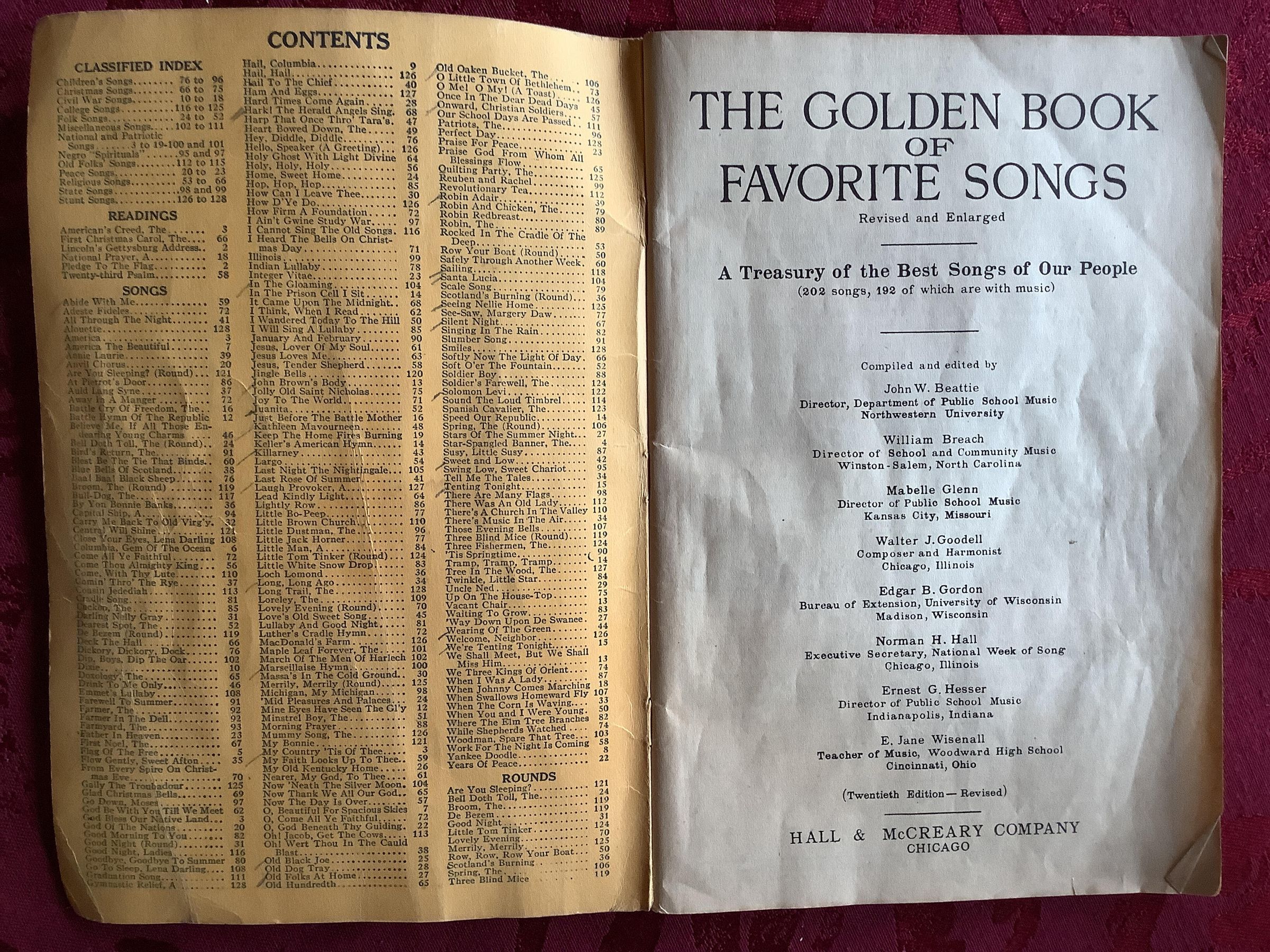 Small sheet music book approx. 5x8" containing patriotic, religious, childrens, and folk songs. Interior cover has full song listing (see photo).