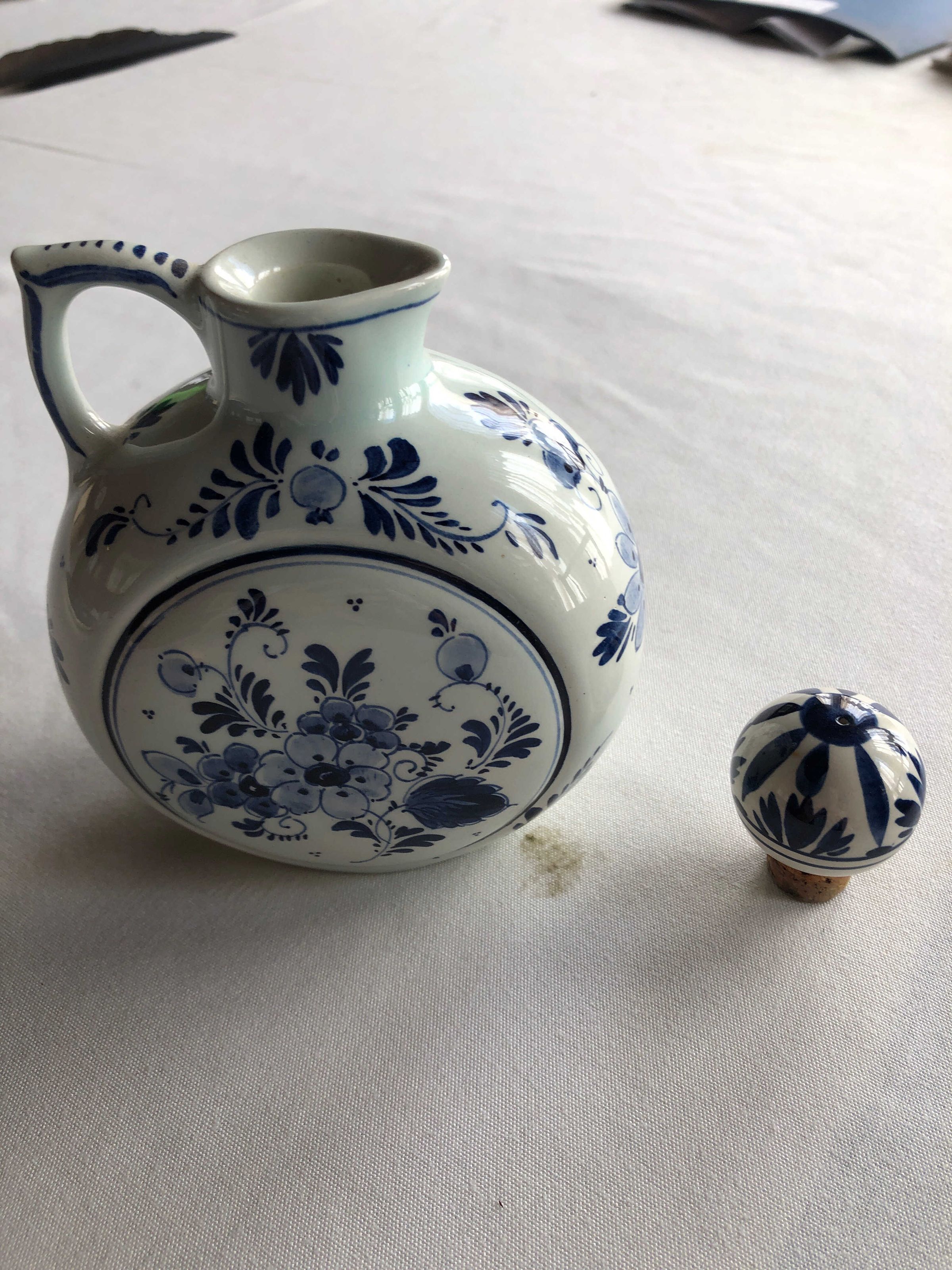 Ceramic pitcher, flattened spherical shape, done in cobalt blue over white background, cork stopper, single finger loopInscription/Signature/Marks