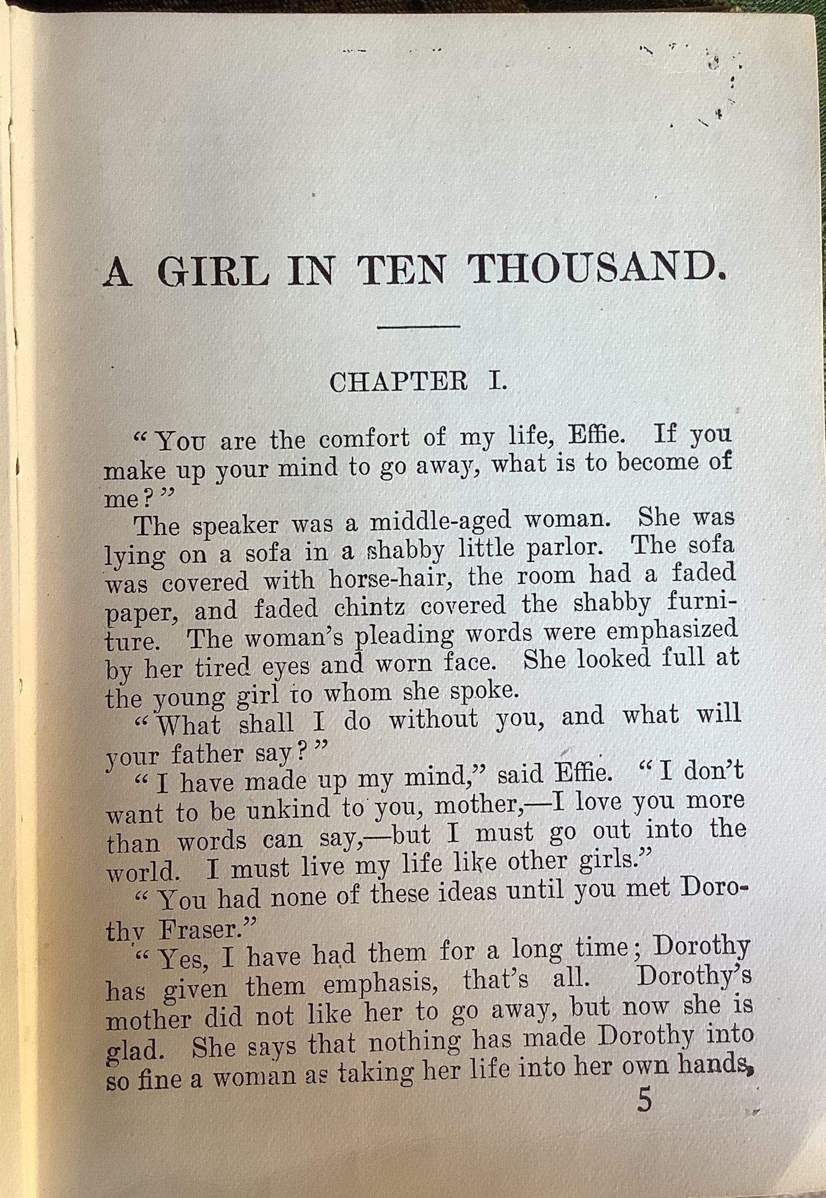 "Effie Staunton desires to become a nurse in spite of the fact that she is the eldest of six children, and the one person in the family upon whom everyone depends. Her father, a country doctor, however, objects to lady nurses, or to advanced ideas of women's work, but when he has to secure the help of a trained nurse in a dangerous case of diphtheria he changes his opinion. His devotion to his patient costs him his life, and then Effie in their time of trouble proves herself to be a girl in ten thousand, saving the family from want and her brother from disgrace."