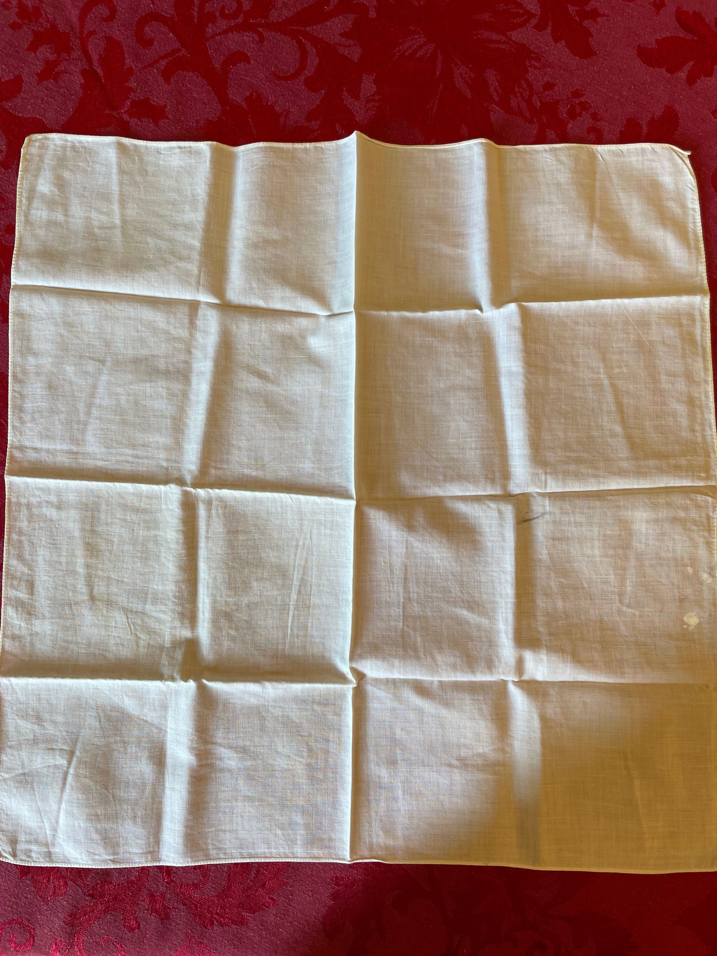 A larger white handkerchief with no visible pattern nor adornment that stretches quite wide and also has no staining. It might’ve been deemed more practical than those with intricate patterns.Create Date