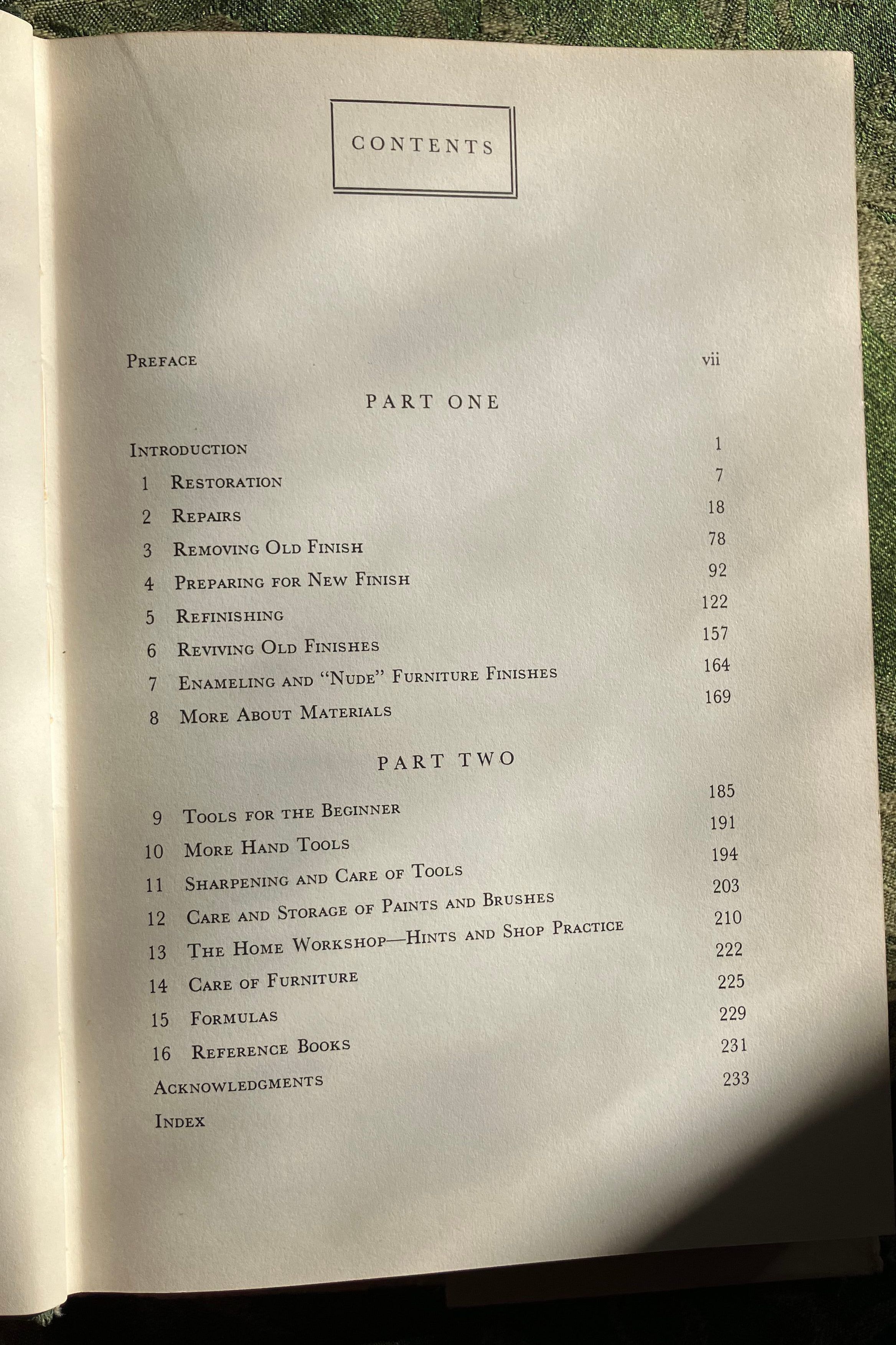From the dust jacket: "...[a] complete work manual on every aspect of furniture repair and refinishing... it gives accurate, easily-understood, step-by-step directions for every single kind of job you might want to tackle."