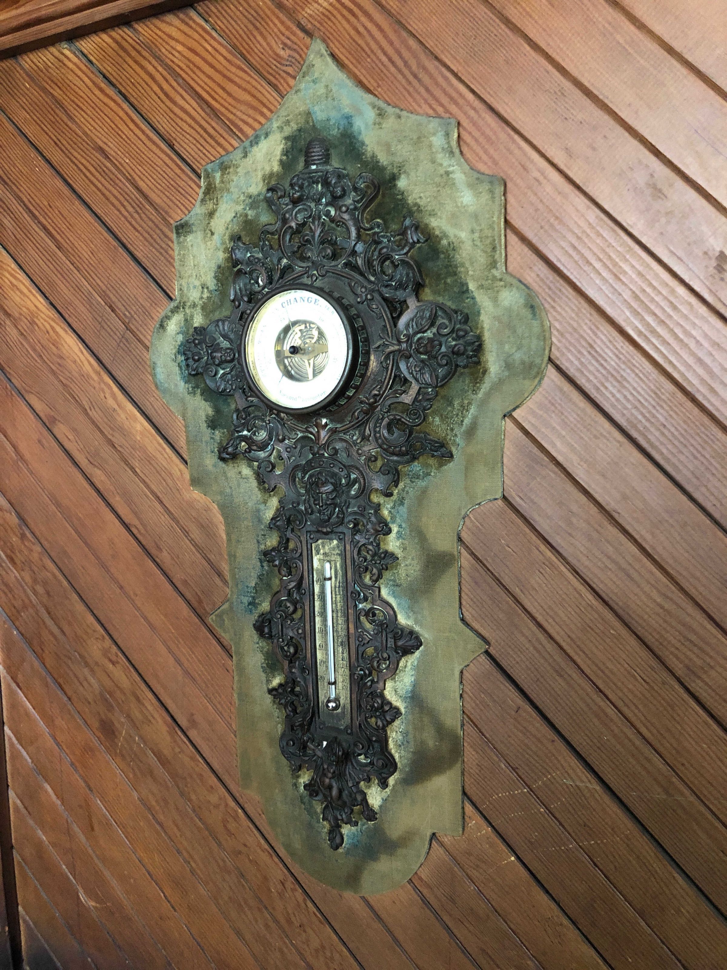 Brass barometer set in green velvet, brass is highly ornate with various cherubs and a face on top of the thermometer