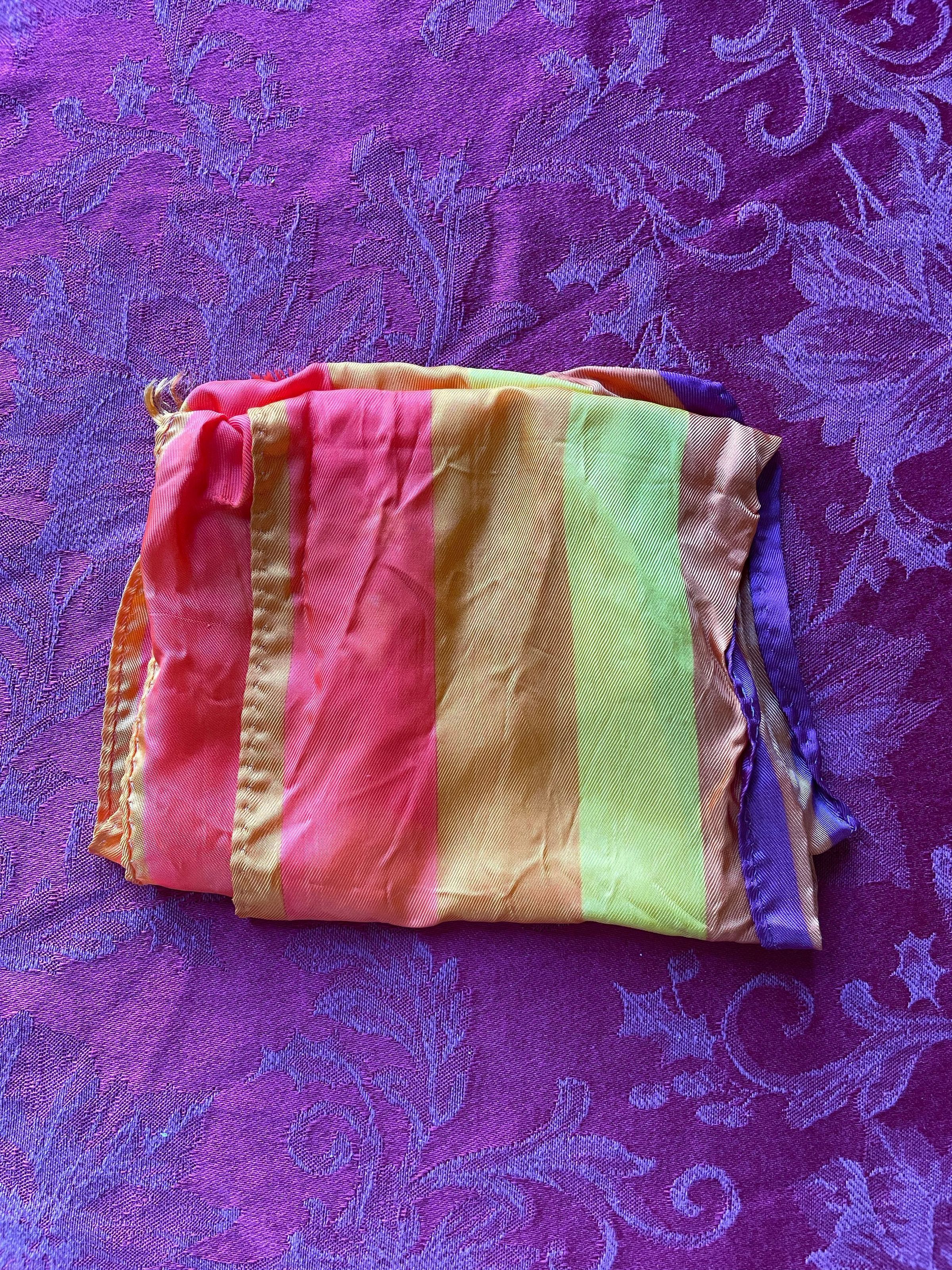 A rainbow-colored scarf with red, orange, yellow, and purple. It’s quite a bit longer in terms of general scarf design. It might’ve been looped around the neck a few times over.Color