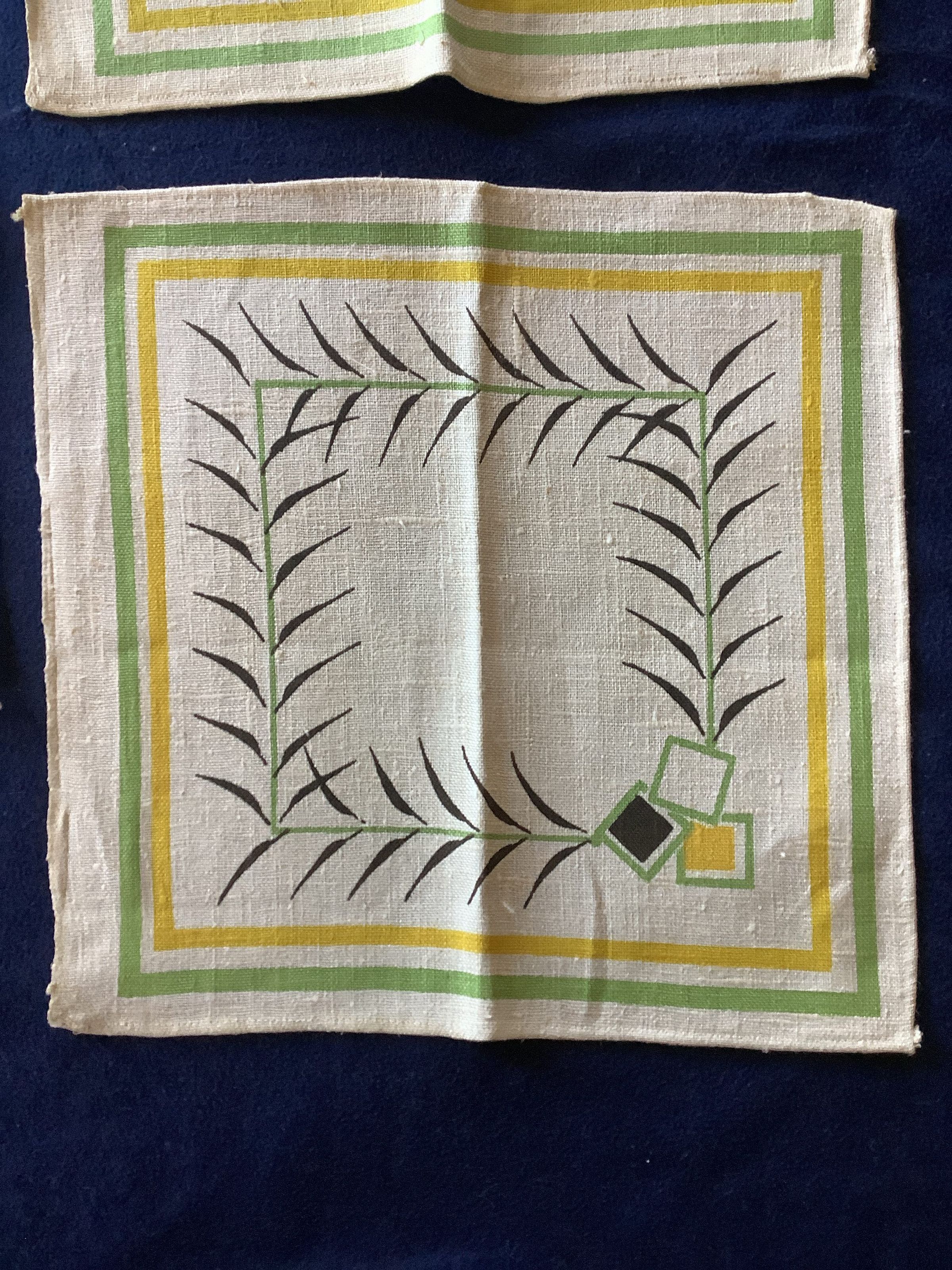 Four decorative squares made of linen with a green and yellow printed design and hemmed edges.
