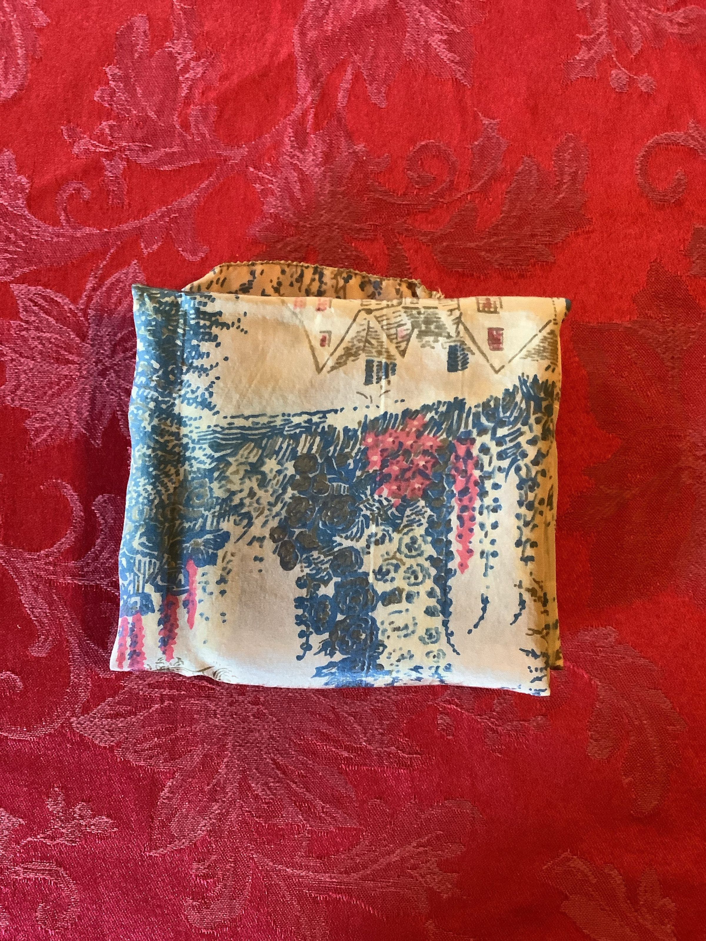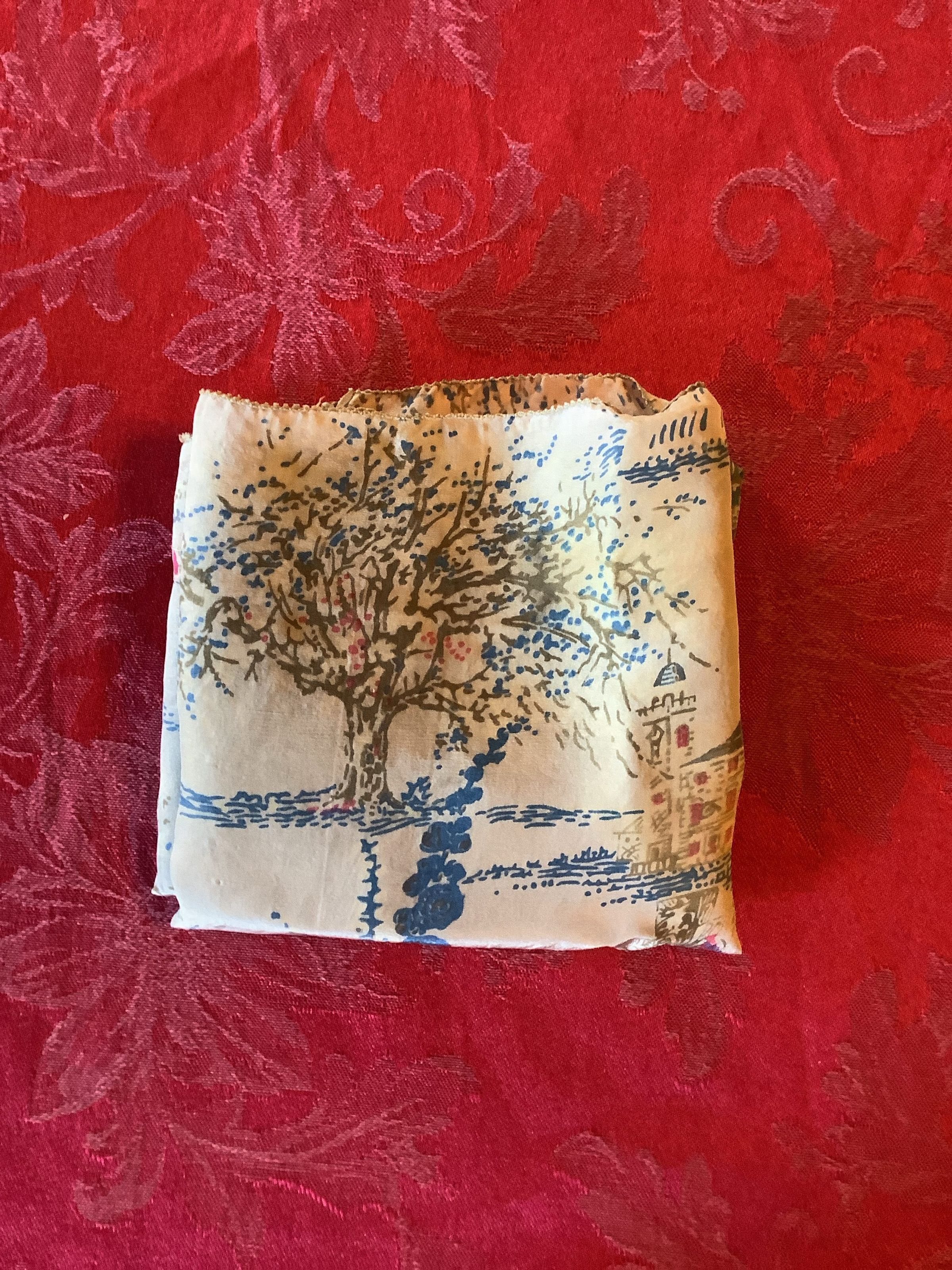 A multicolored patterned scarf which has an ongoing, stretching motif of picturesque landscapes, quaint houses, and blooming flora. The main colors pictured here are light blue, dark blue, red, and green. The maker/manufacturer is unknown.Color