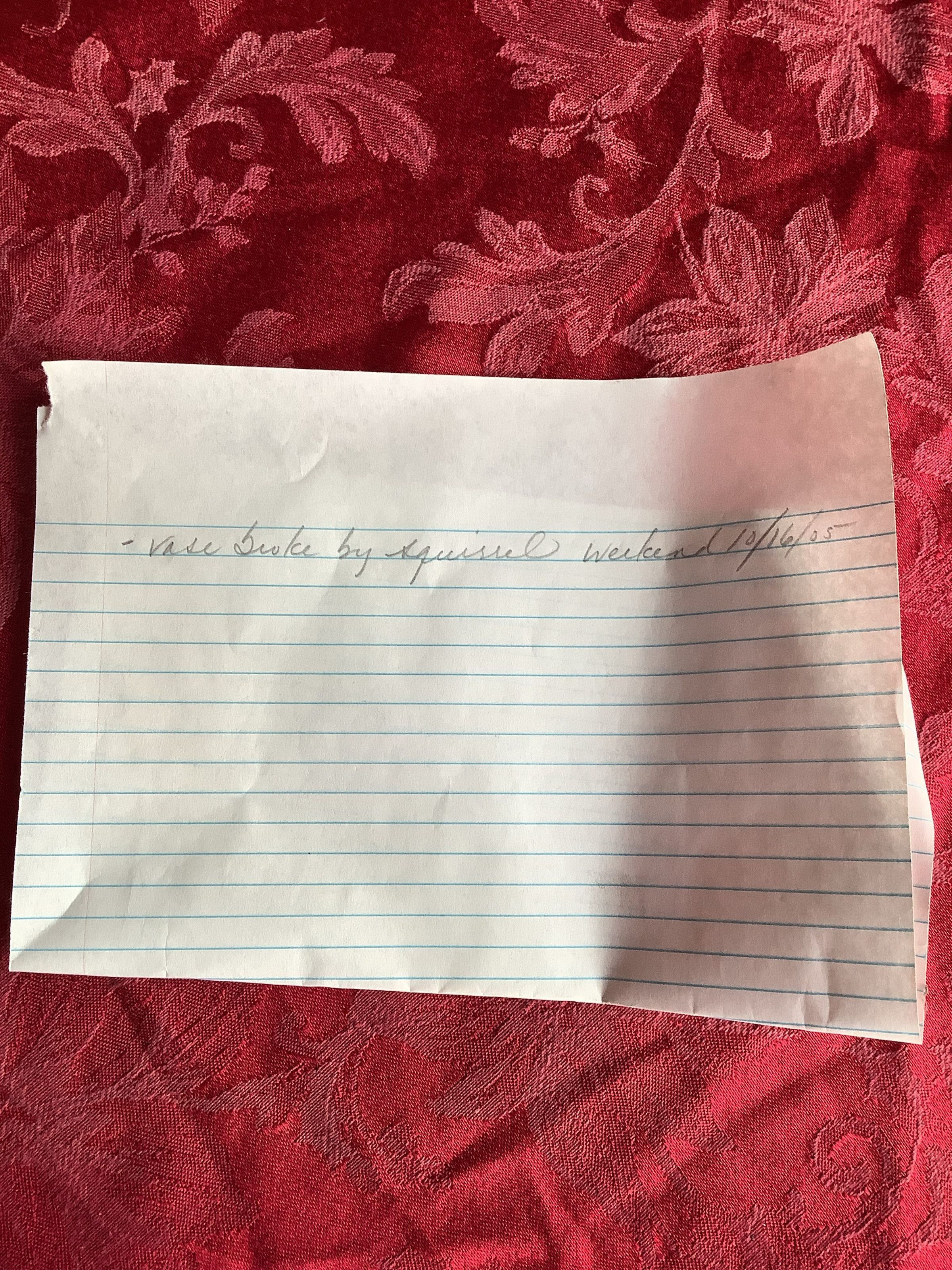 A personal handwritten note on lined paper describing how a vase was broken by a squirrel. It reads, “Vase broken by squirrel weekend 10/16/05.”Inscription/Signature/Marks