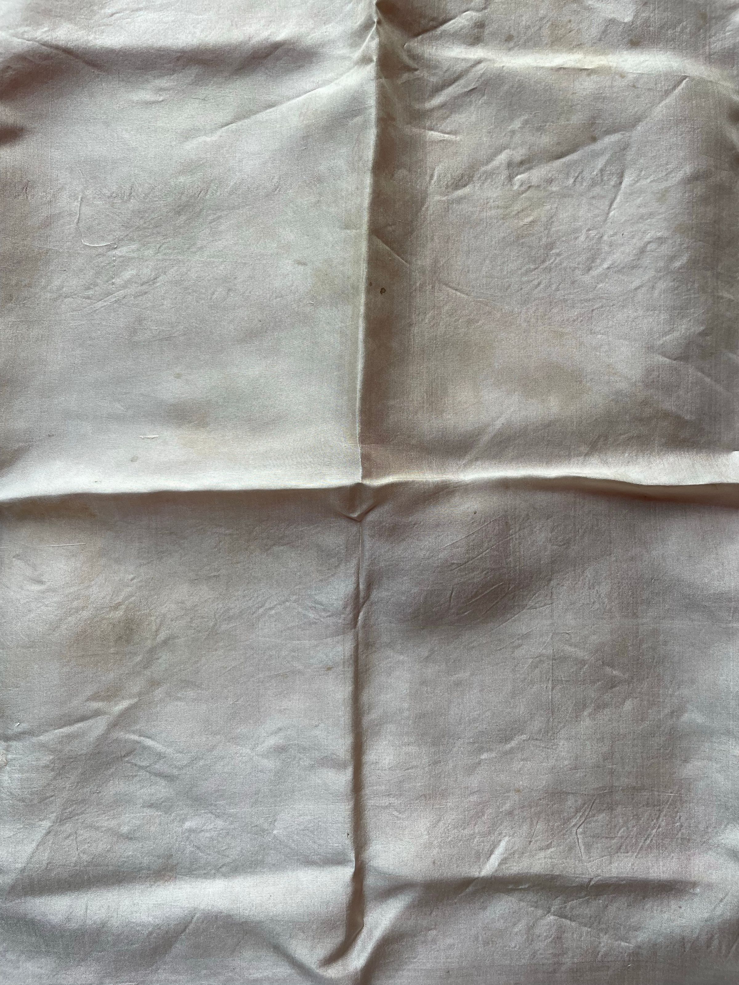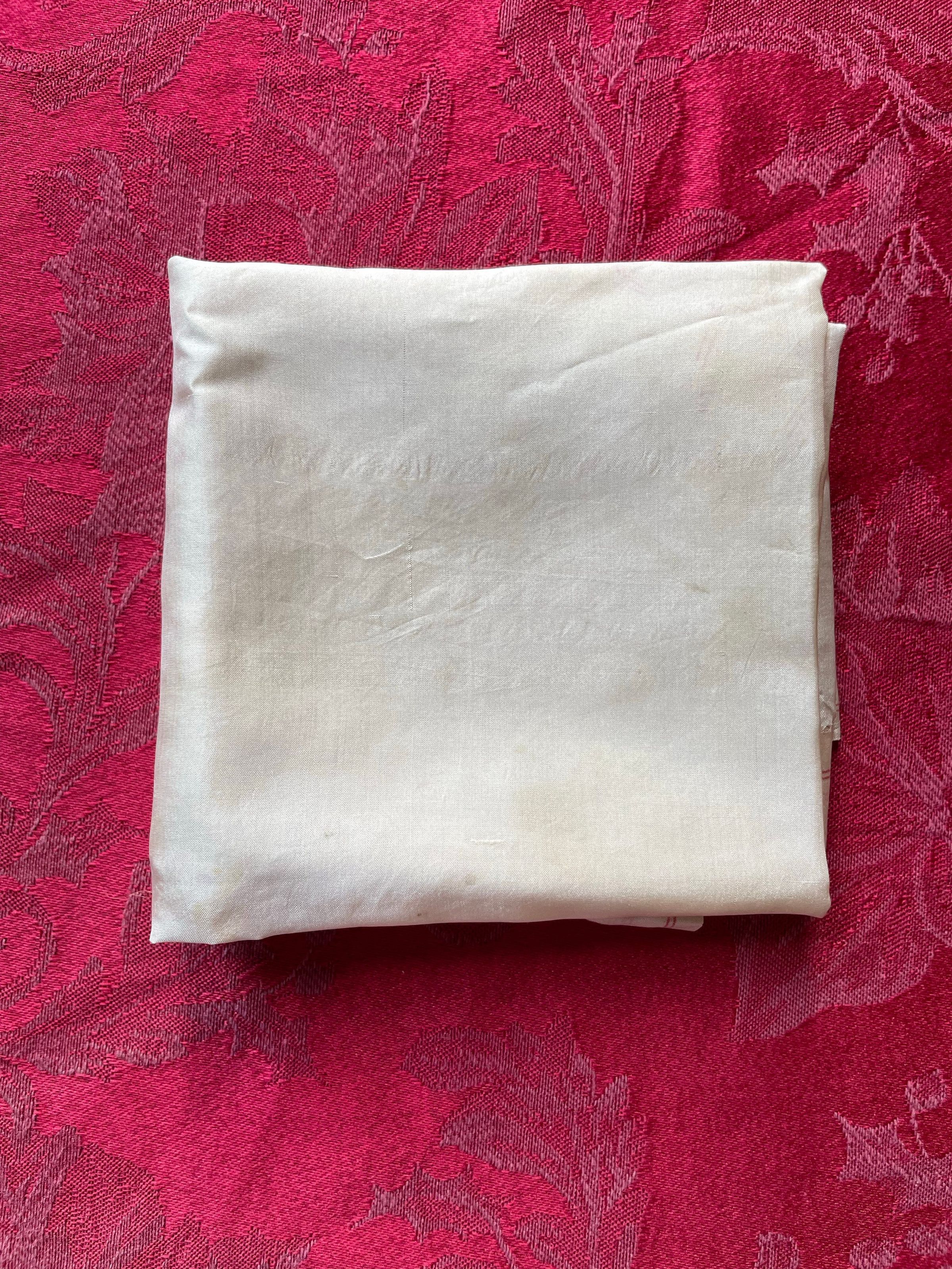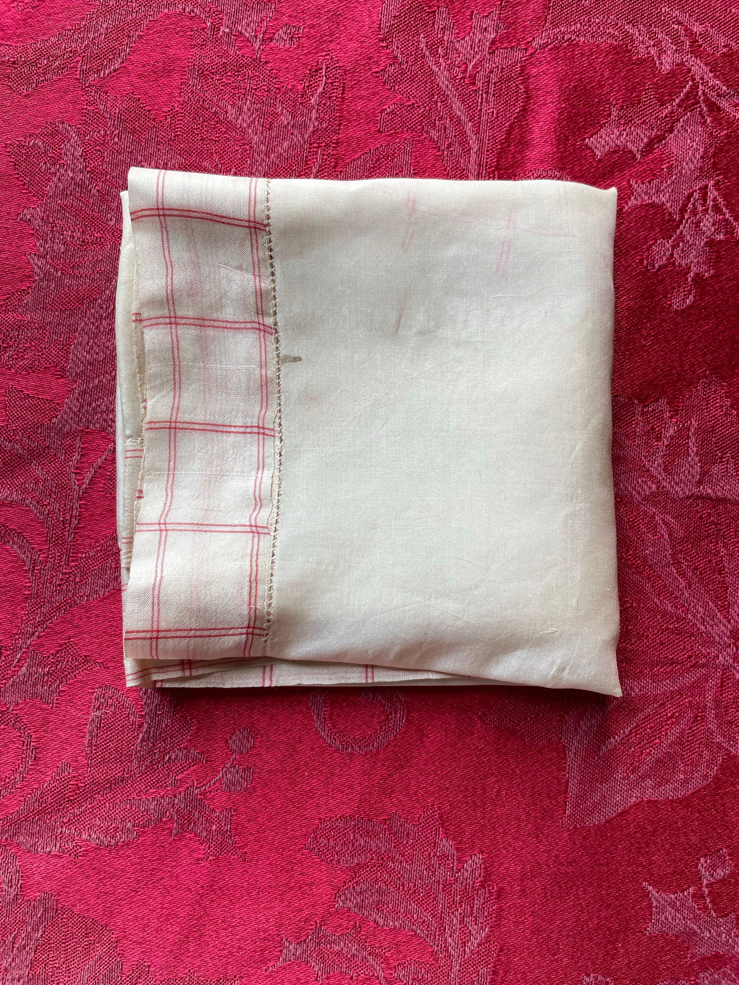 A white scarf with red detailing on the border.