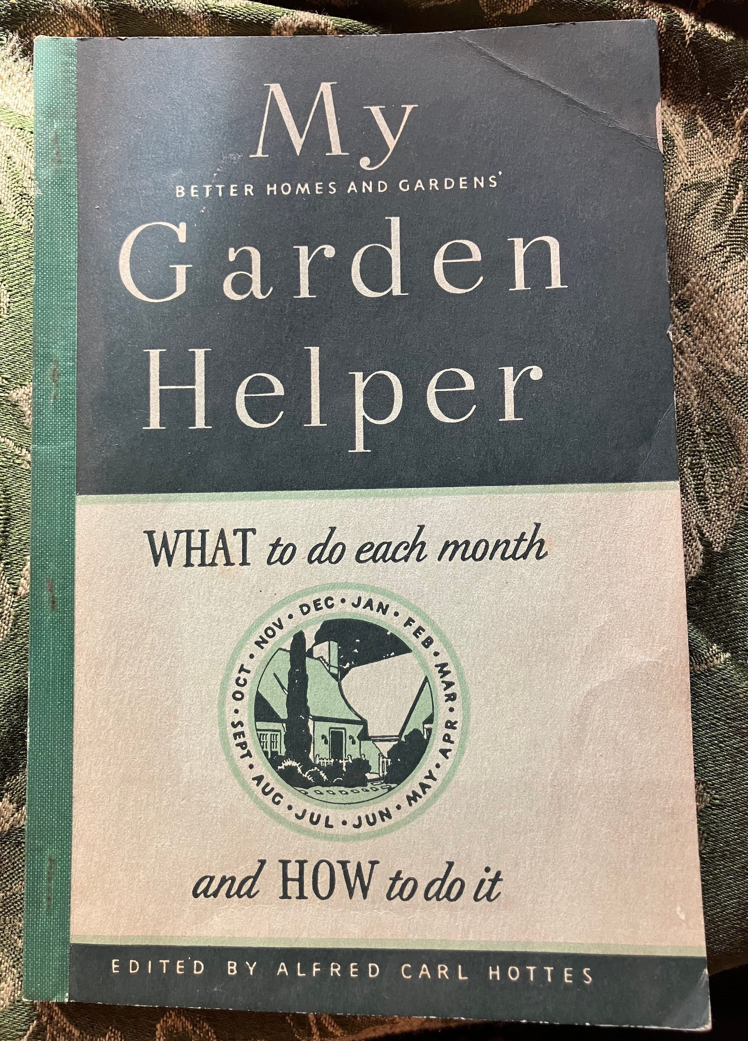 Dark and light green cover. Drawing of a house in a circle with months of the year in outer ring.