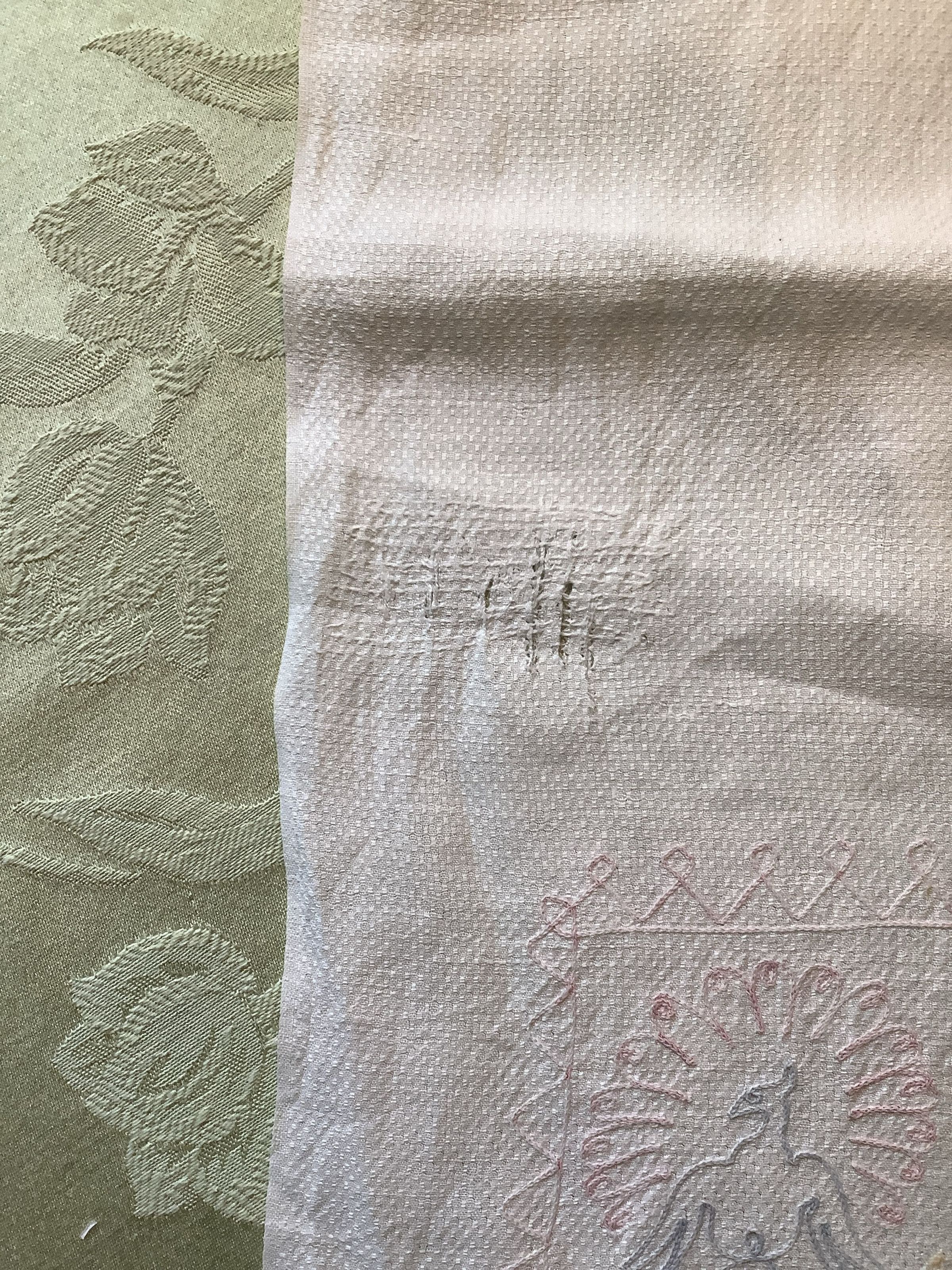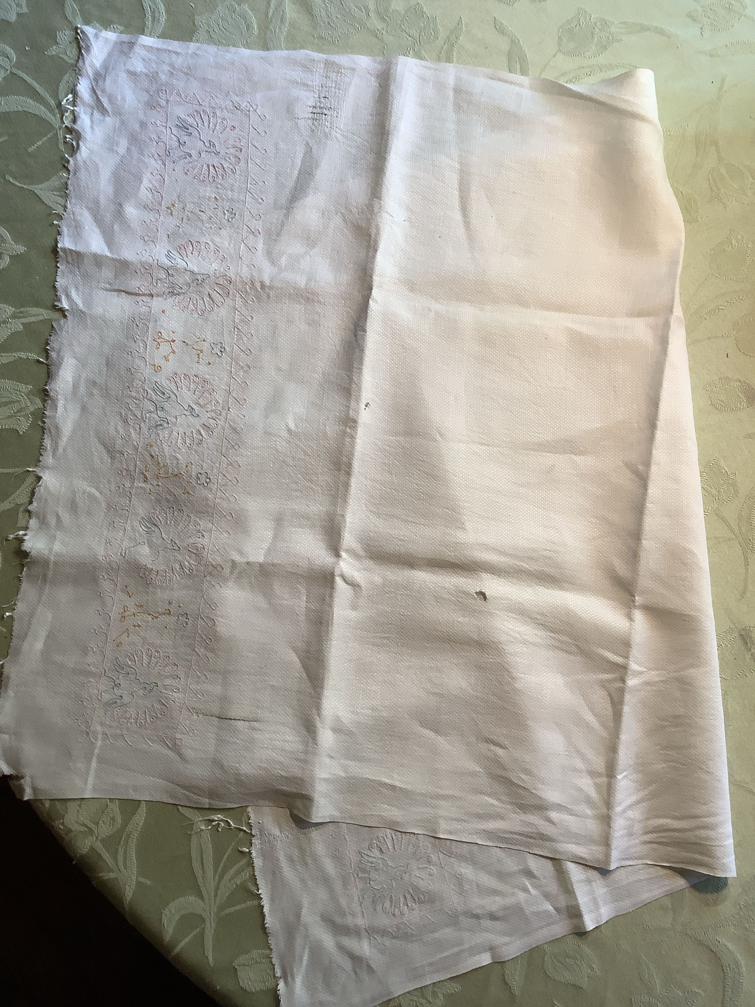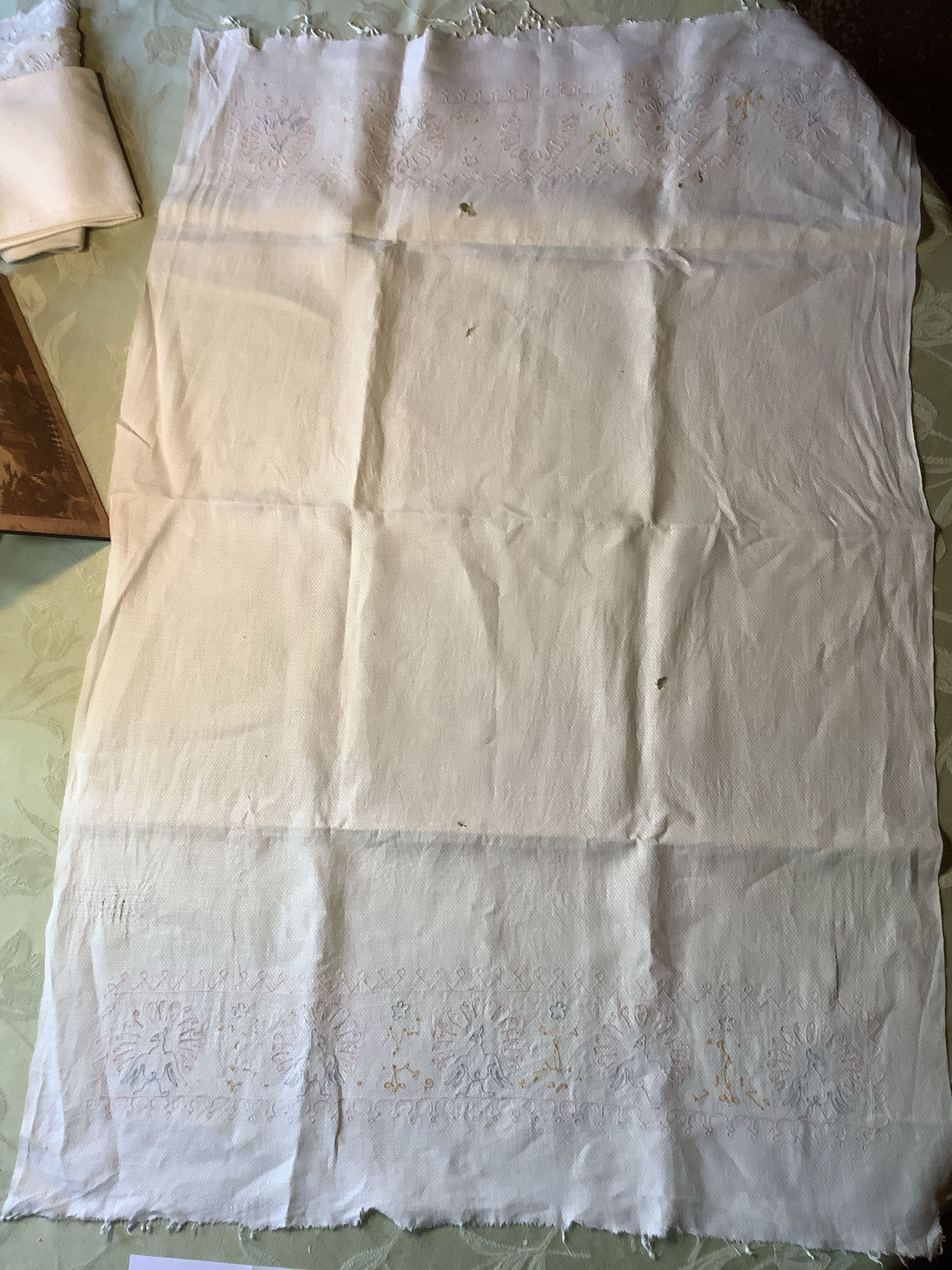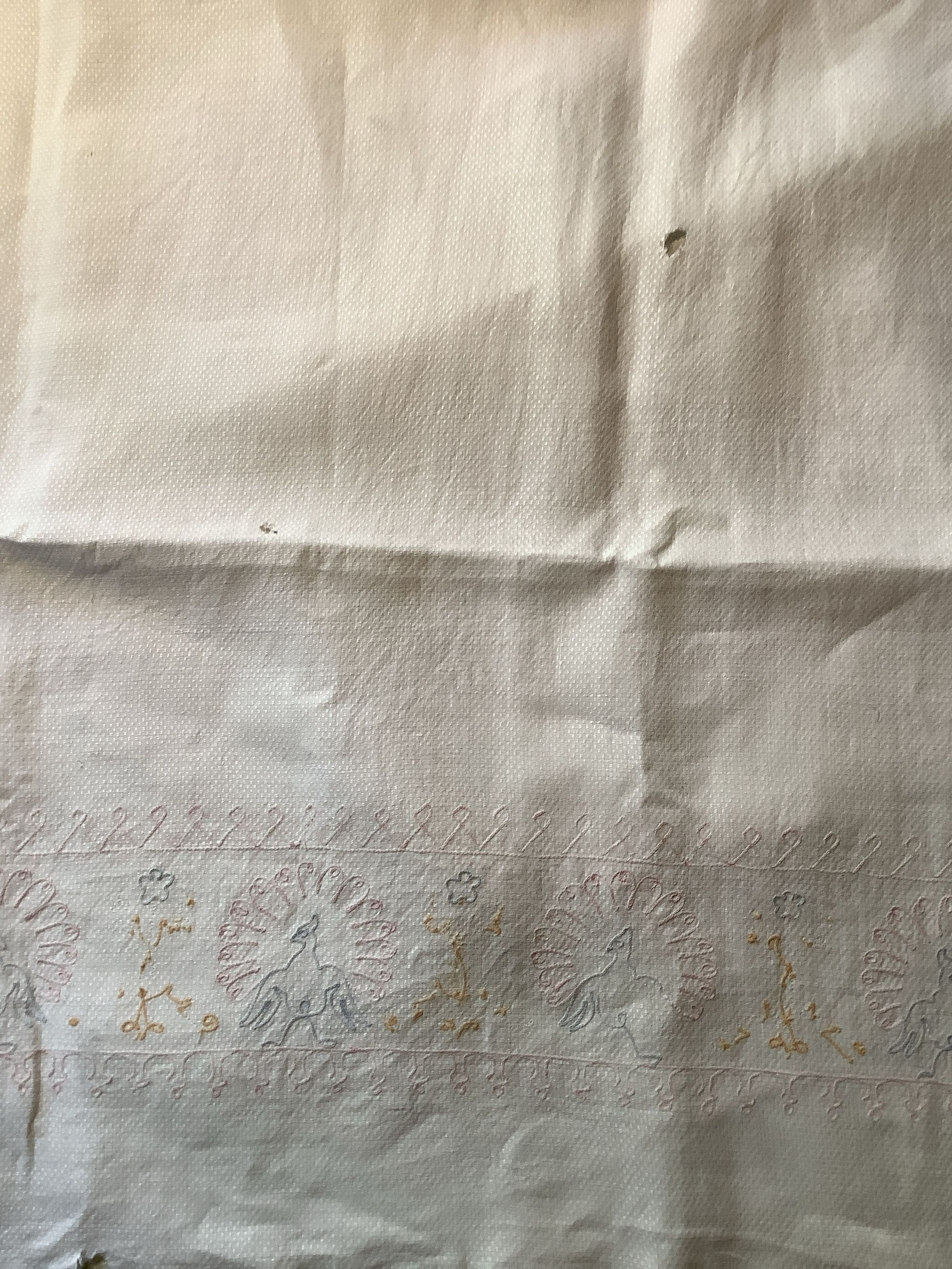 This is a medium sized towel with a bird embroidery detail on both edges. There is a few holes and fraying on the edges. There is also a mended hole