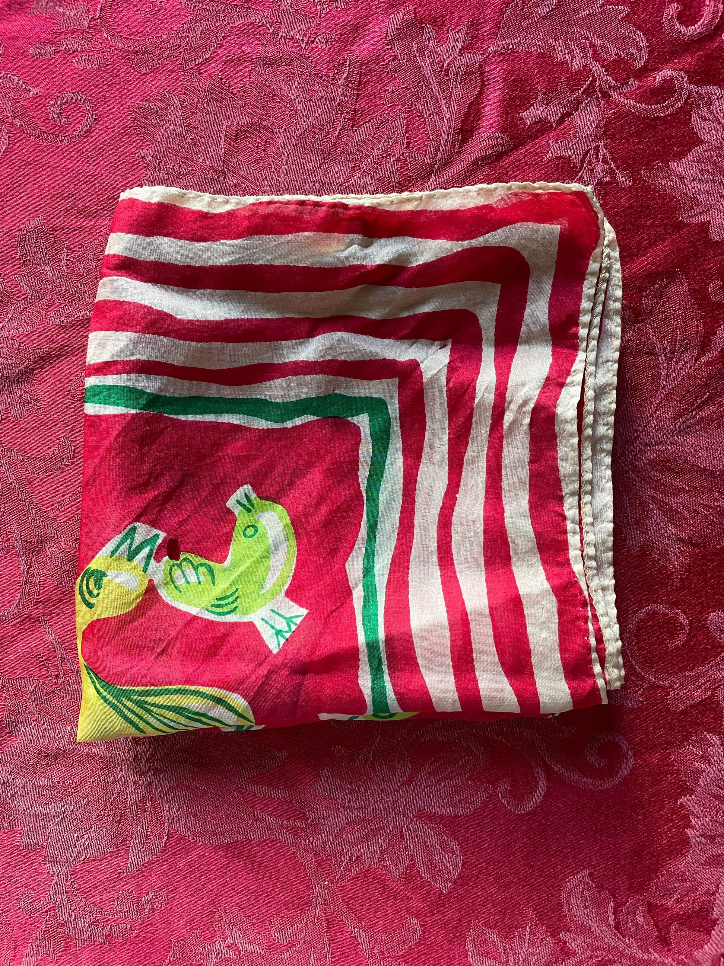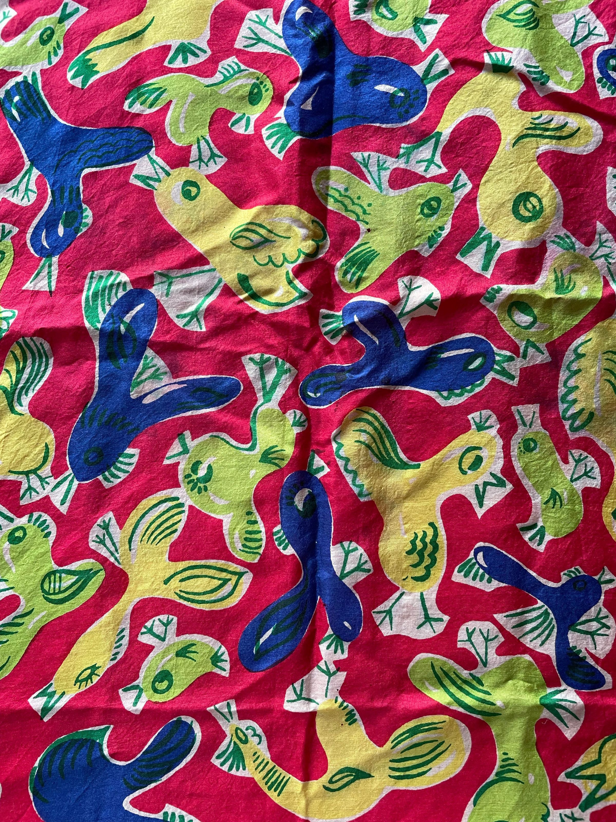 A red patterned scarf with different birds on it in yellow, green, and blue.