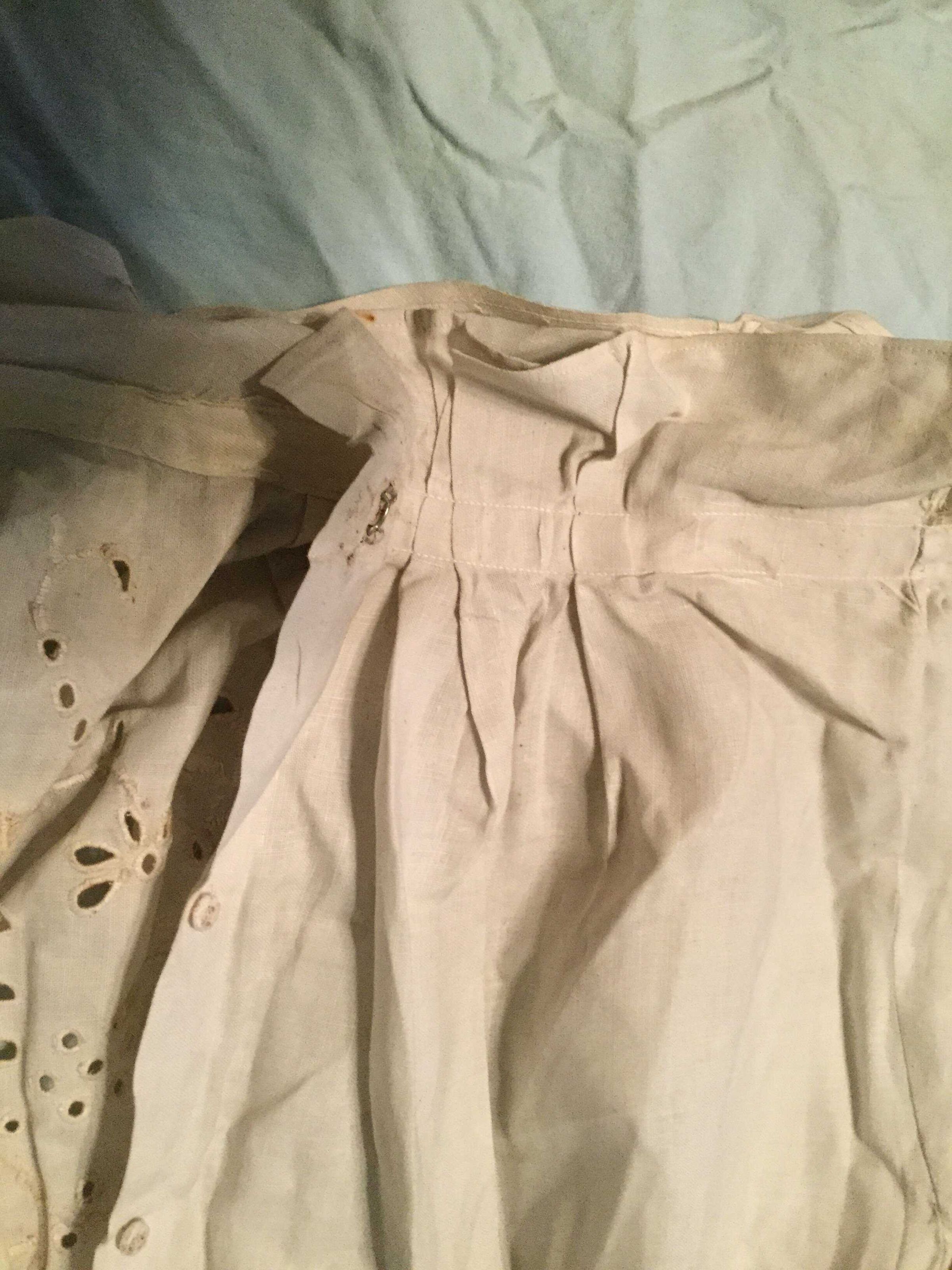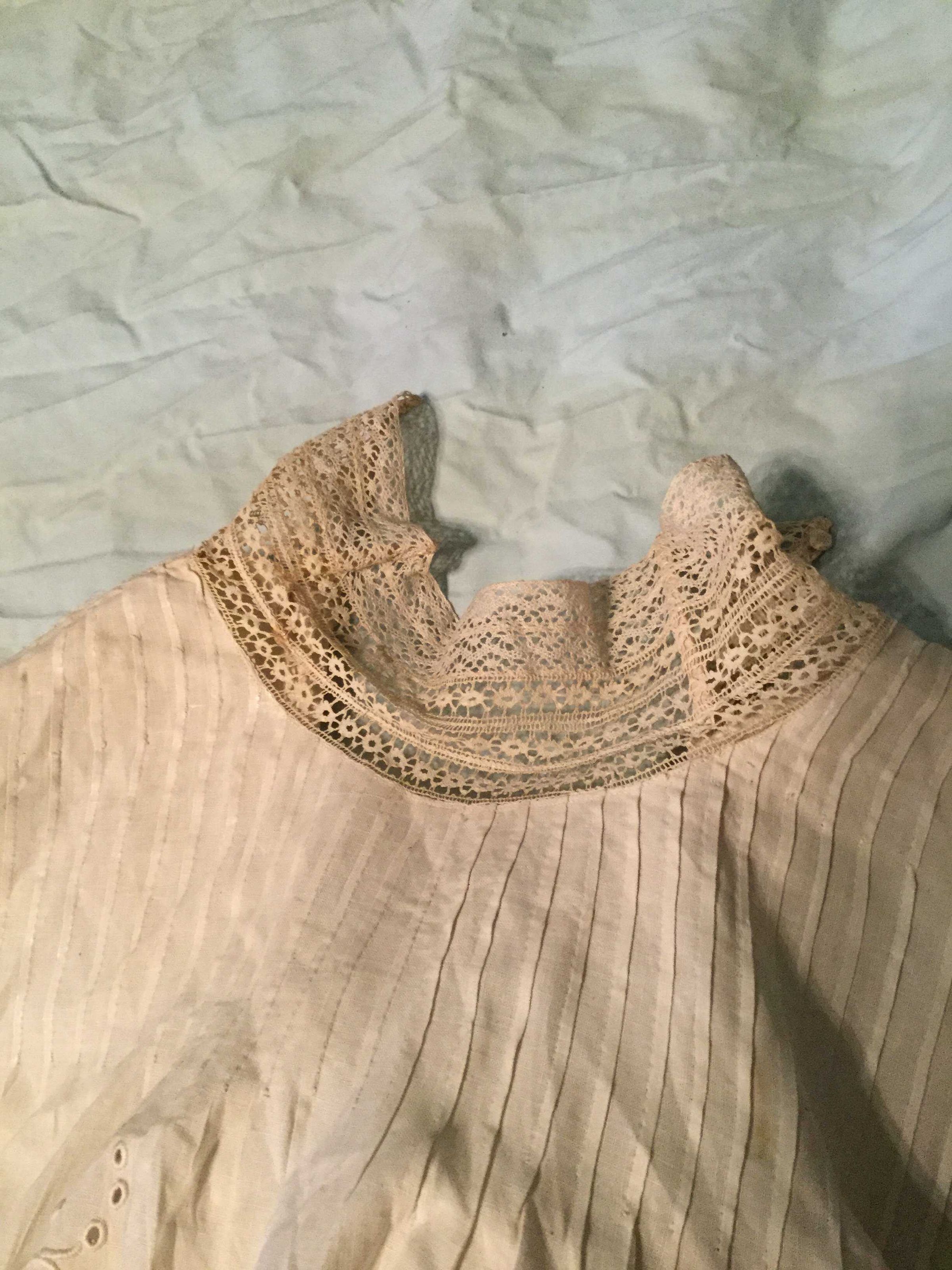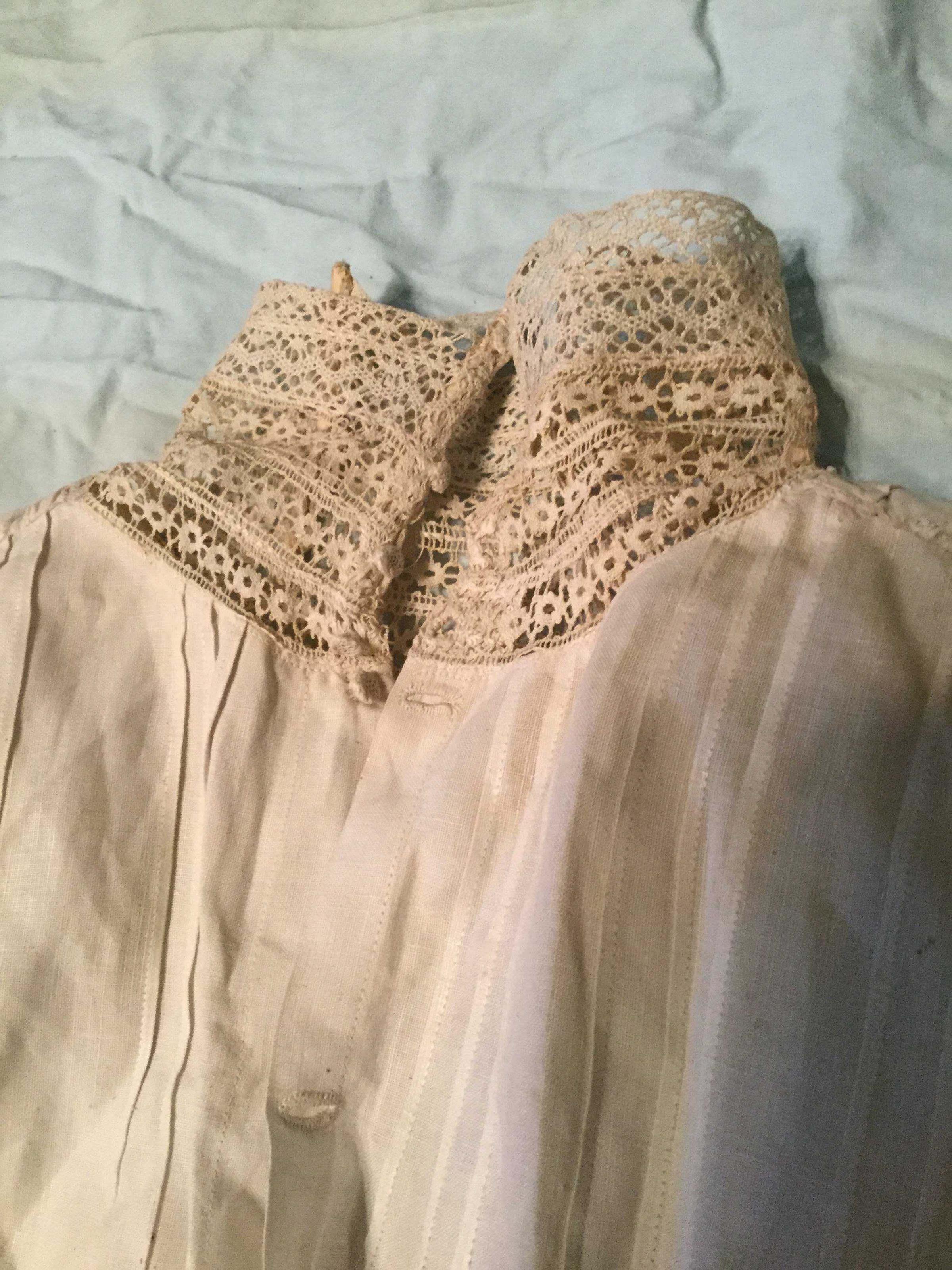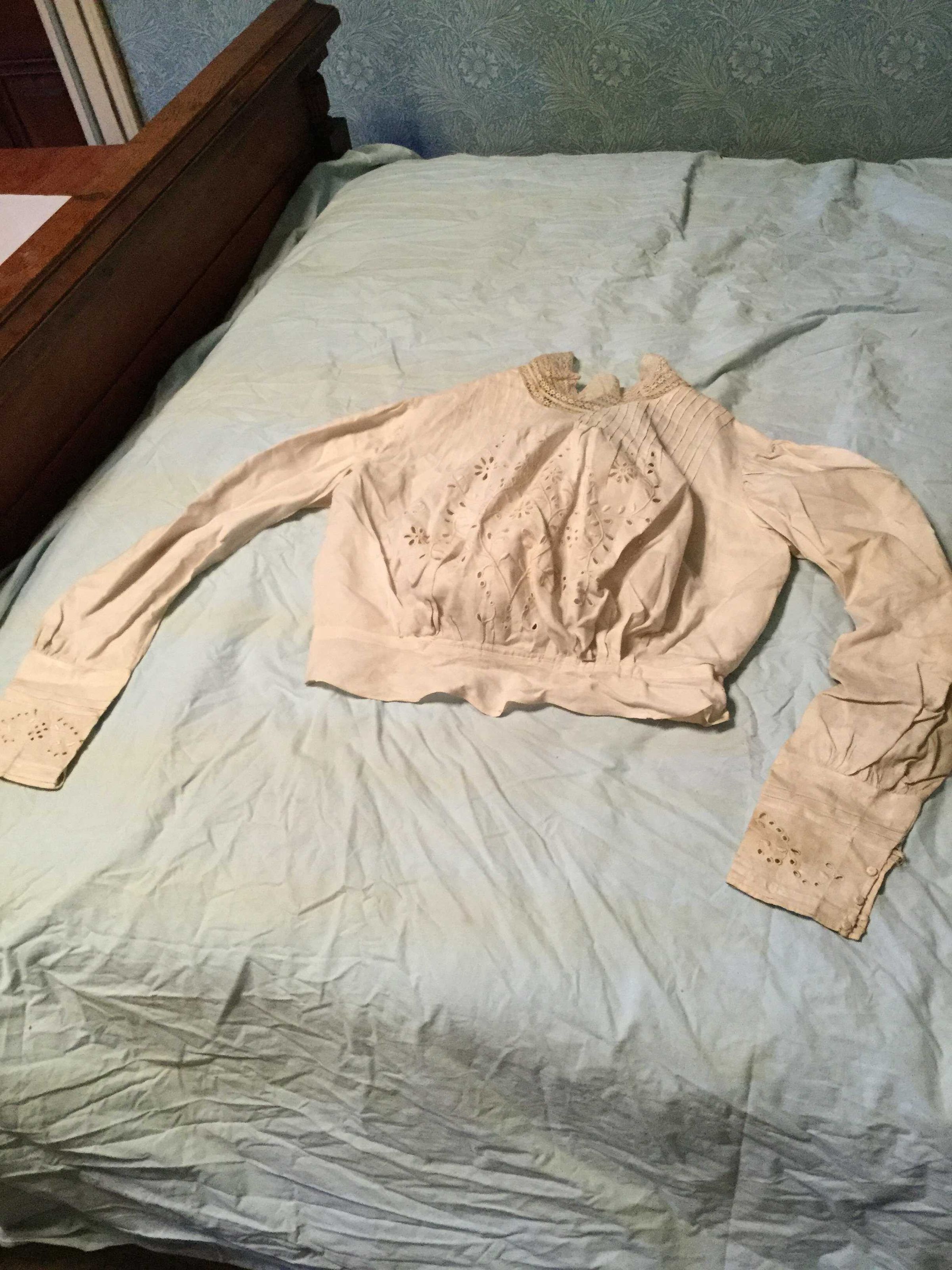 blouse, white linen (?), starched, long sleeve with puff shoulder, gathering above long cuff with eyelet inset and pintucks, 3 buttons (tiny crochet-covered); lace stand up collar with boning; back closure with tiny crochet-covered buttons (9); bodice has waistband with split seams at sides; bodice front has eyelet detail (part of actual fabric - not inset), tucked at back waist, front waist in puffy gibson girl style; good condition, slight discoloring, small tears, machine sewnCollection
