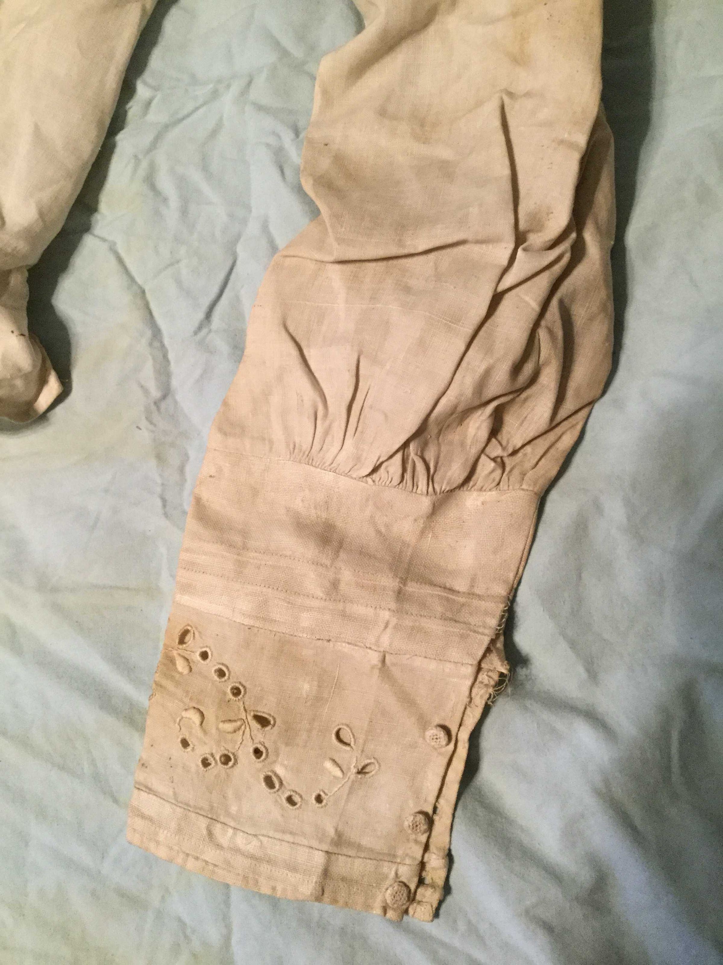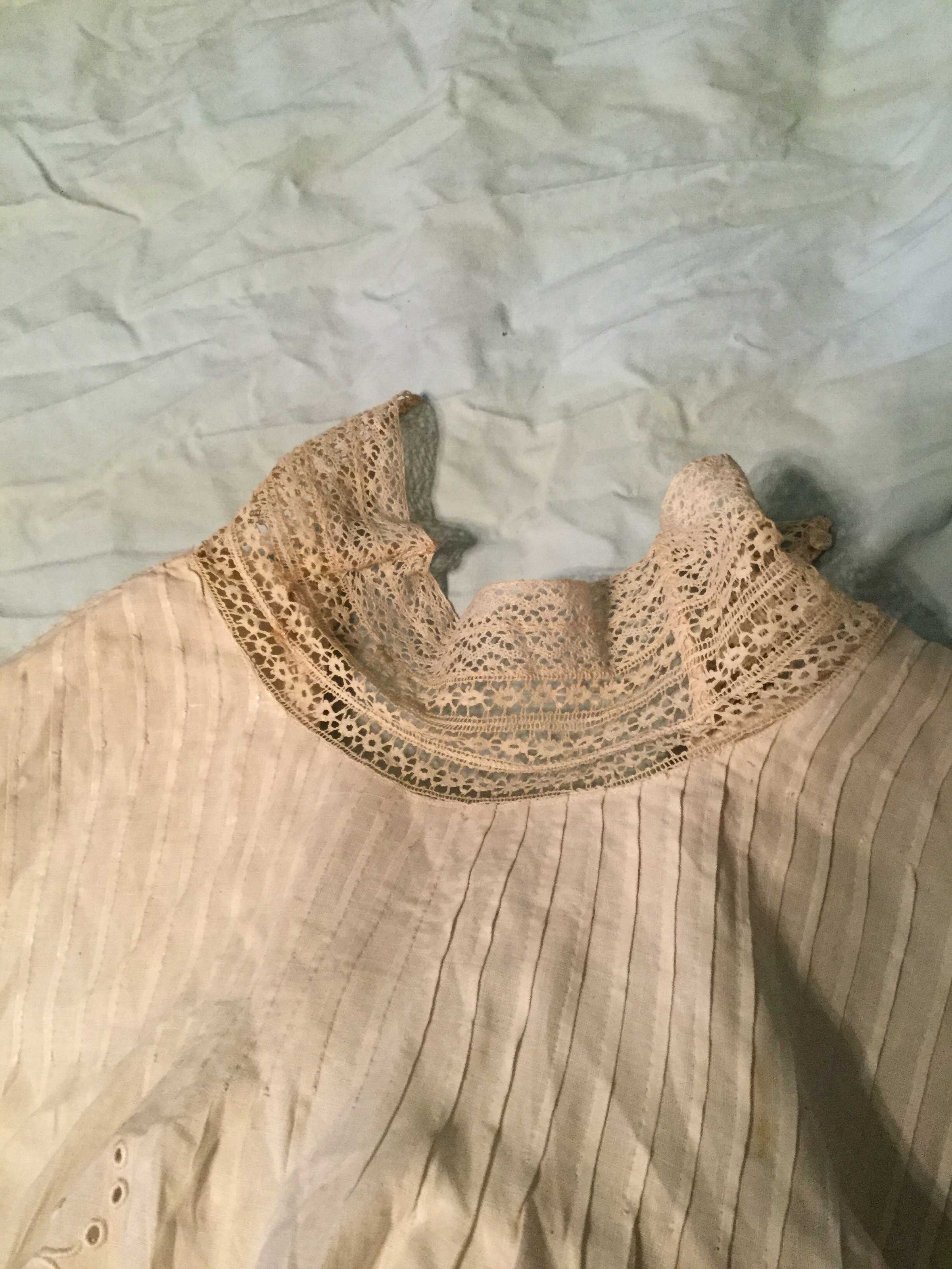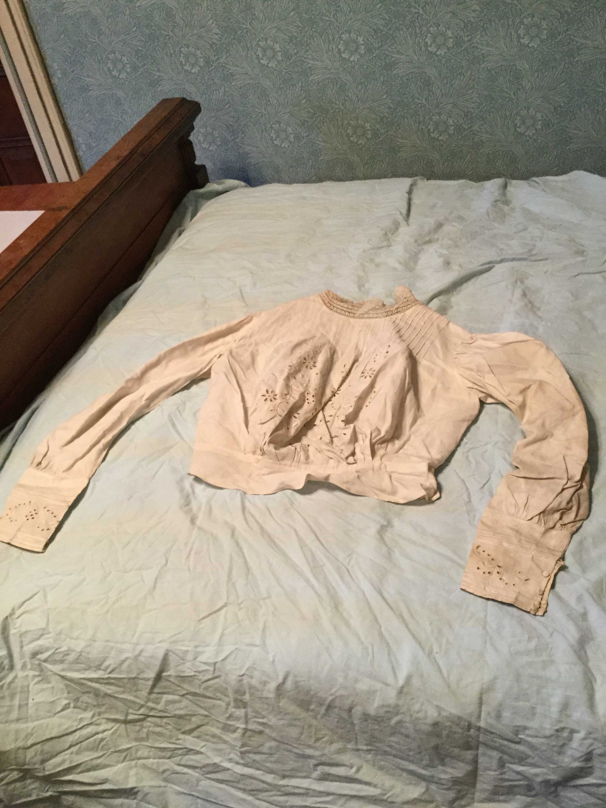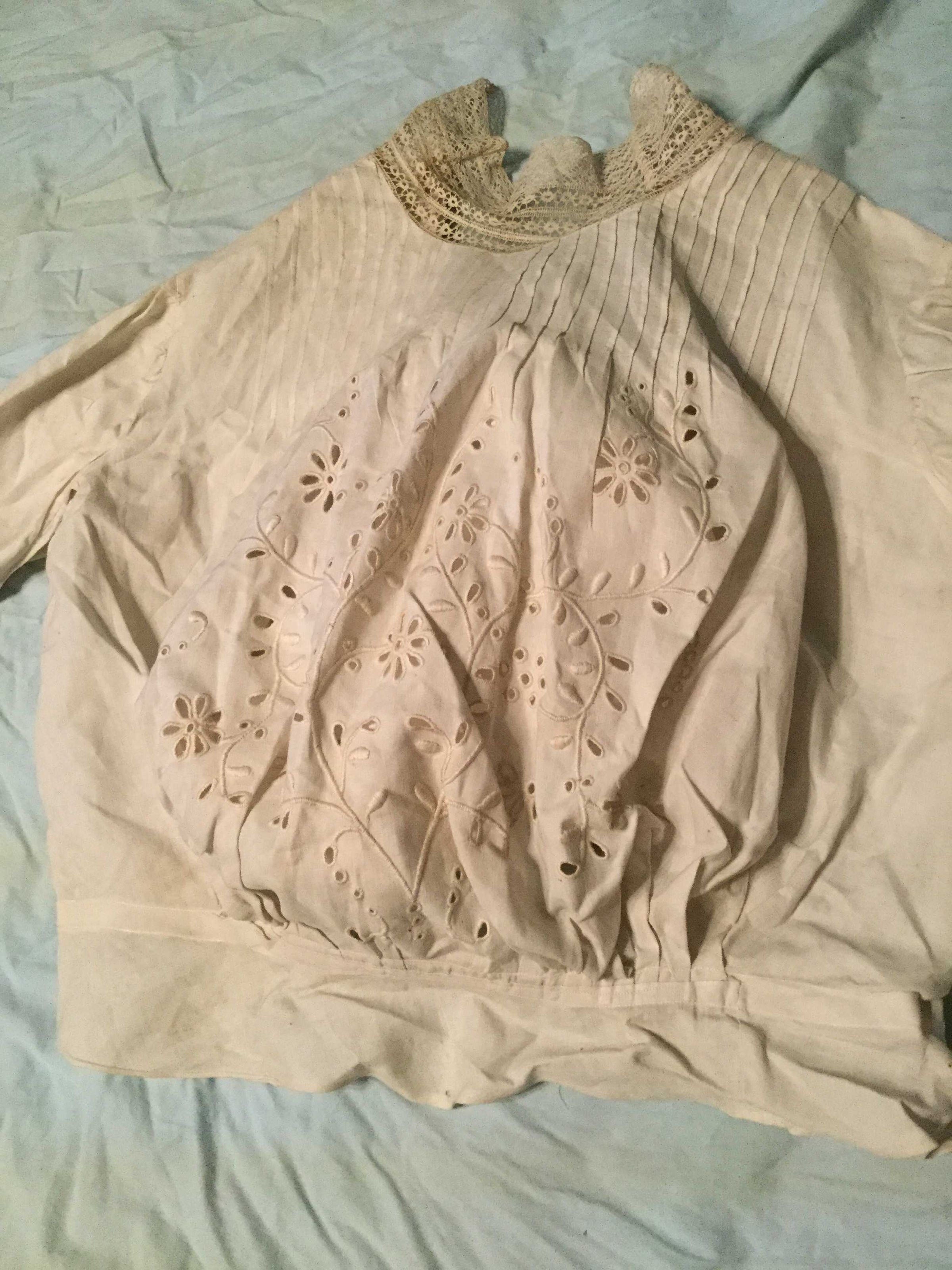 blouse, white over blouse, tucking, embroidered collar, tab, belt, darning 'startched' gathered sleeves, no closures, cuffs pin tucks, pulled. Good condition, longer in front