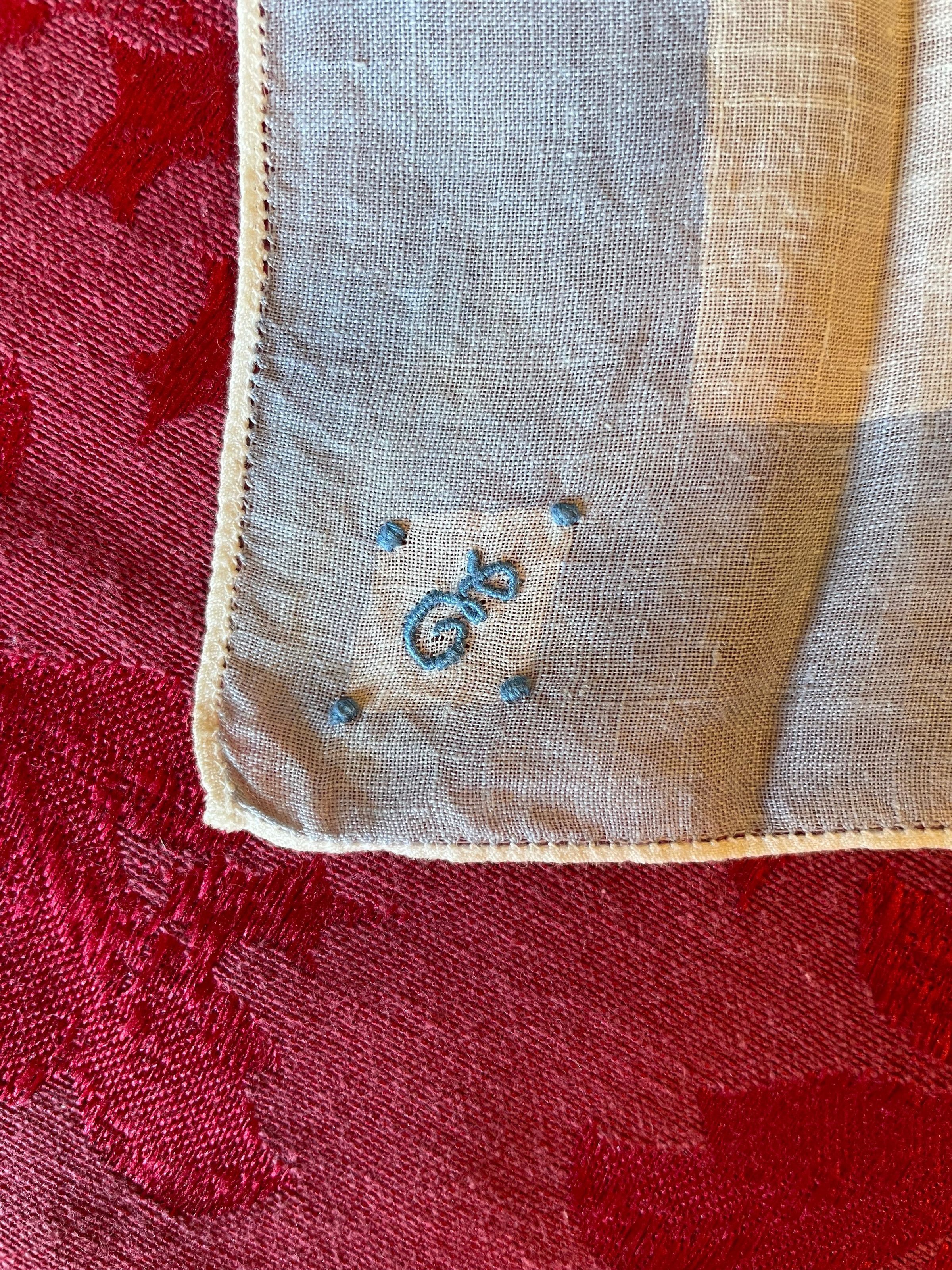 A blue and white patterned handkerchief with the letter “E” for Emelita Cohen stitched onto the lower left hand corner inside of a diamond shape. Blue embroidery thread was used for the four points of the diamond and also her initial.Color