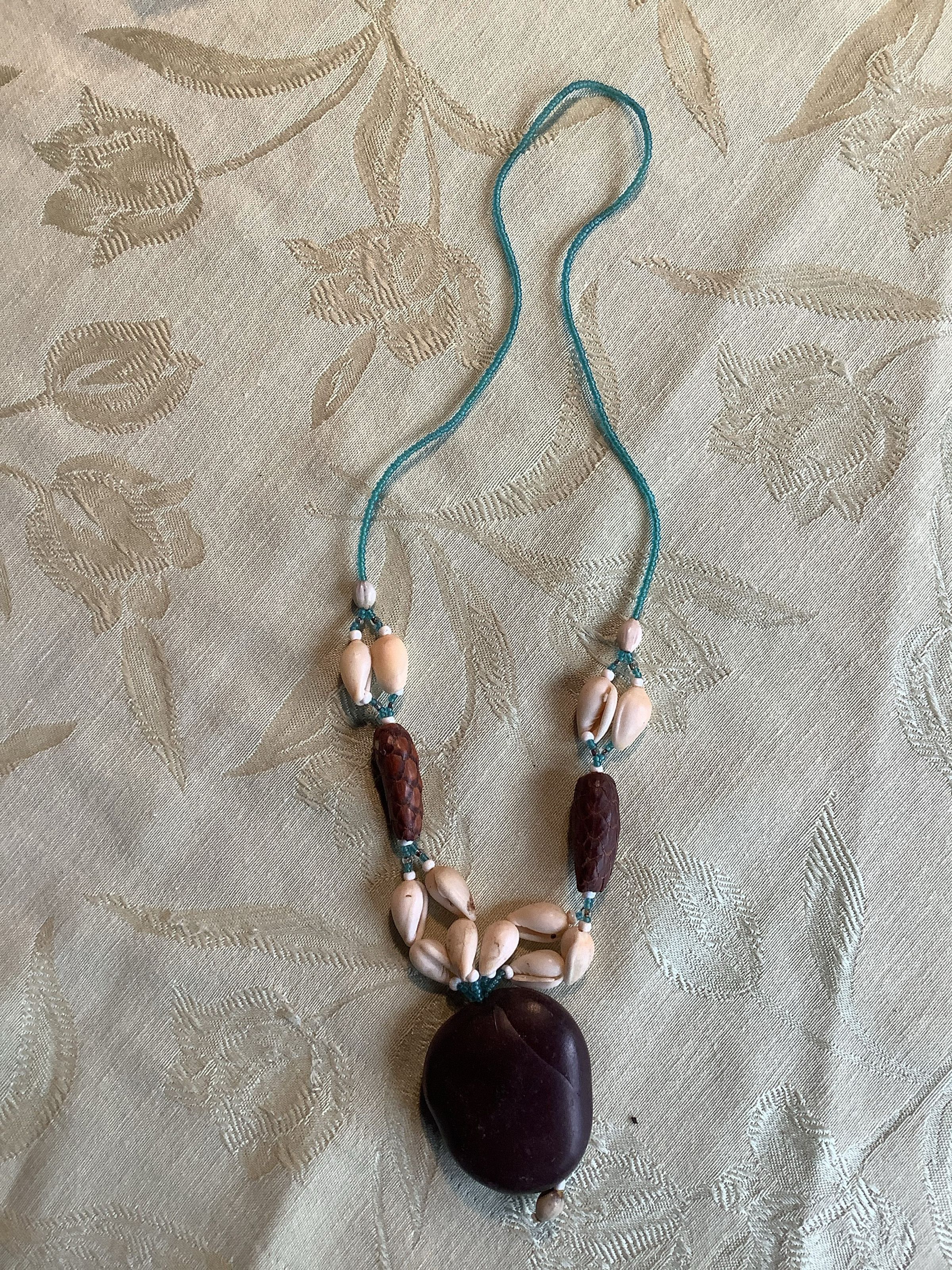 Necklace made of small blue beads, clear beads, and white beads to string together white shells, pine cones, and a pendant made of a tropical seed.Collection