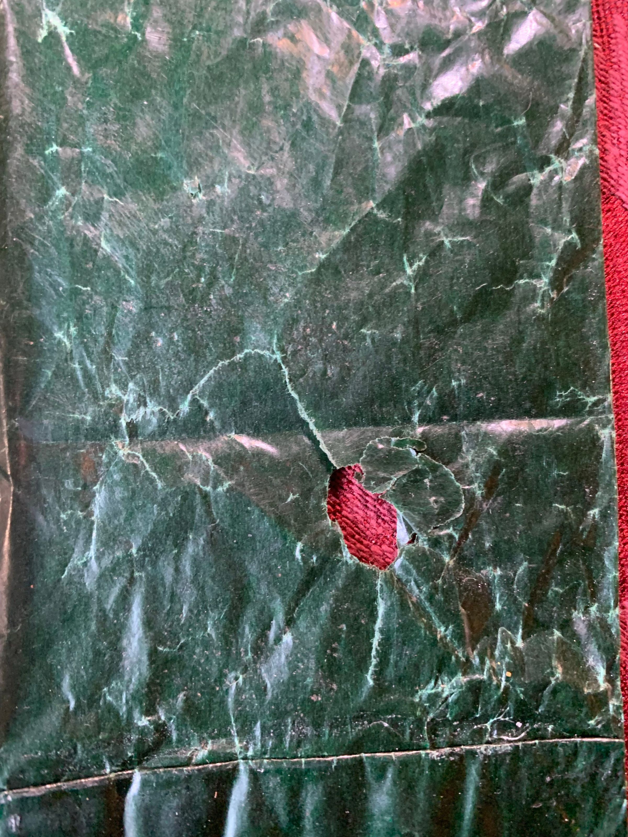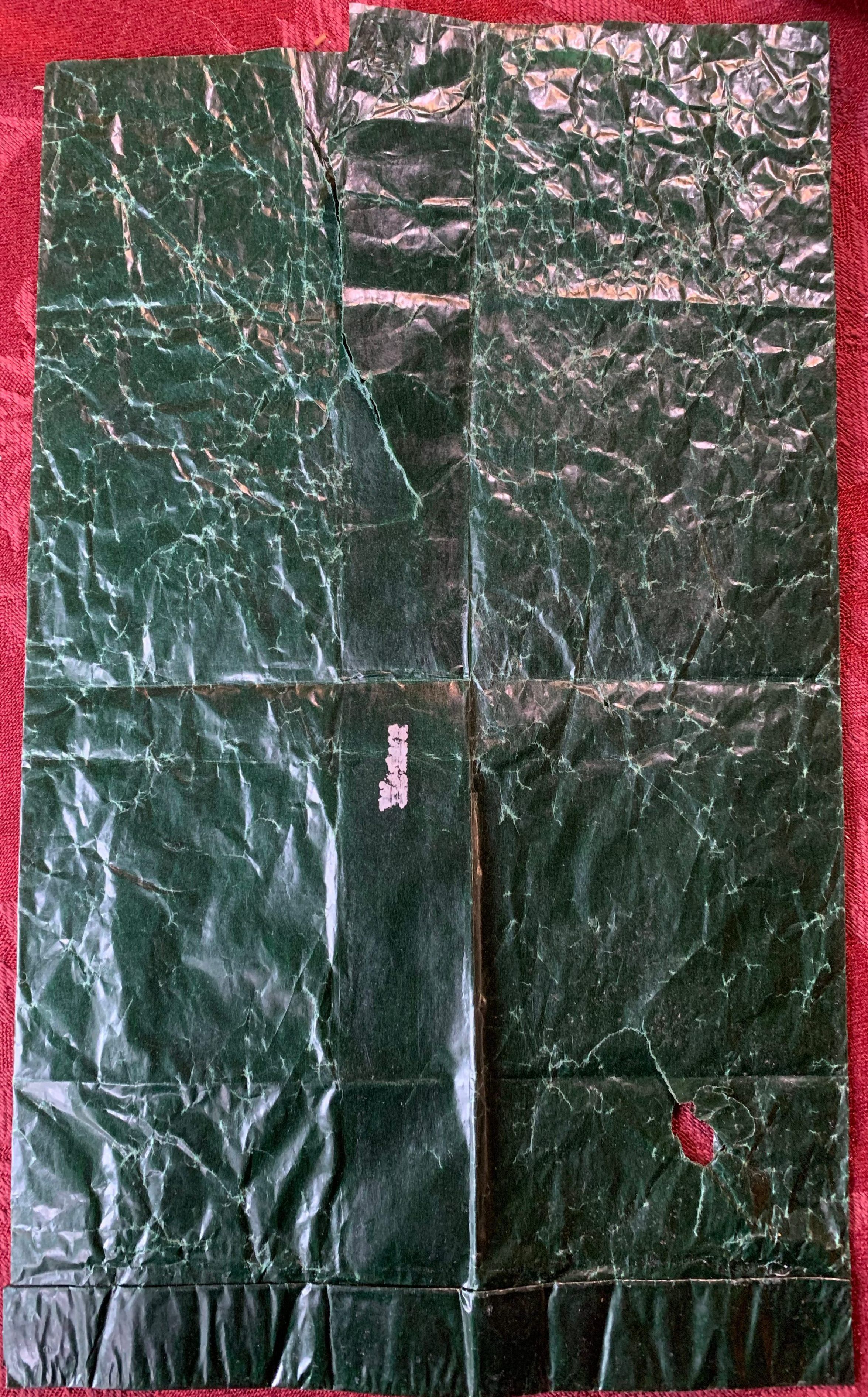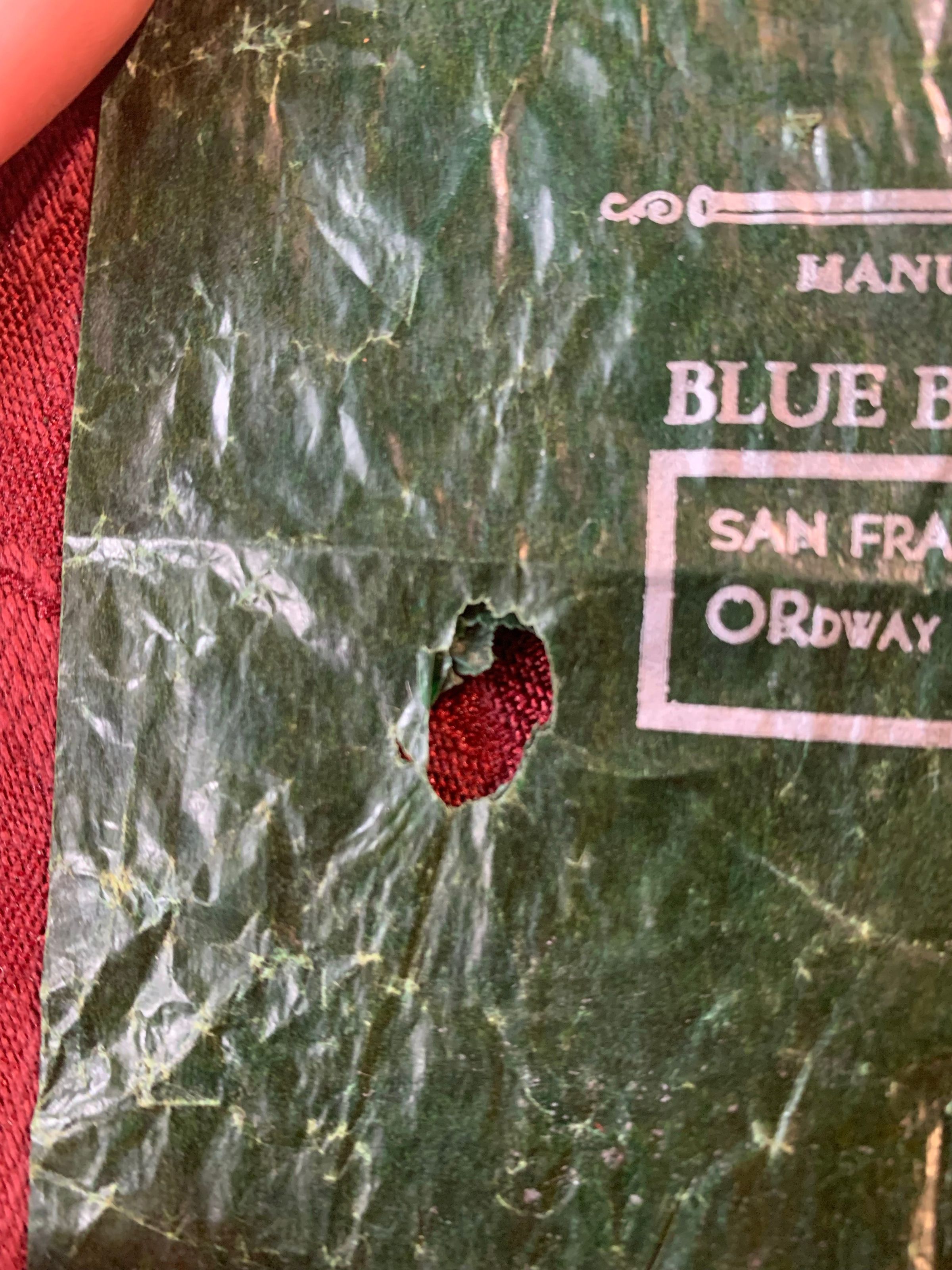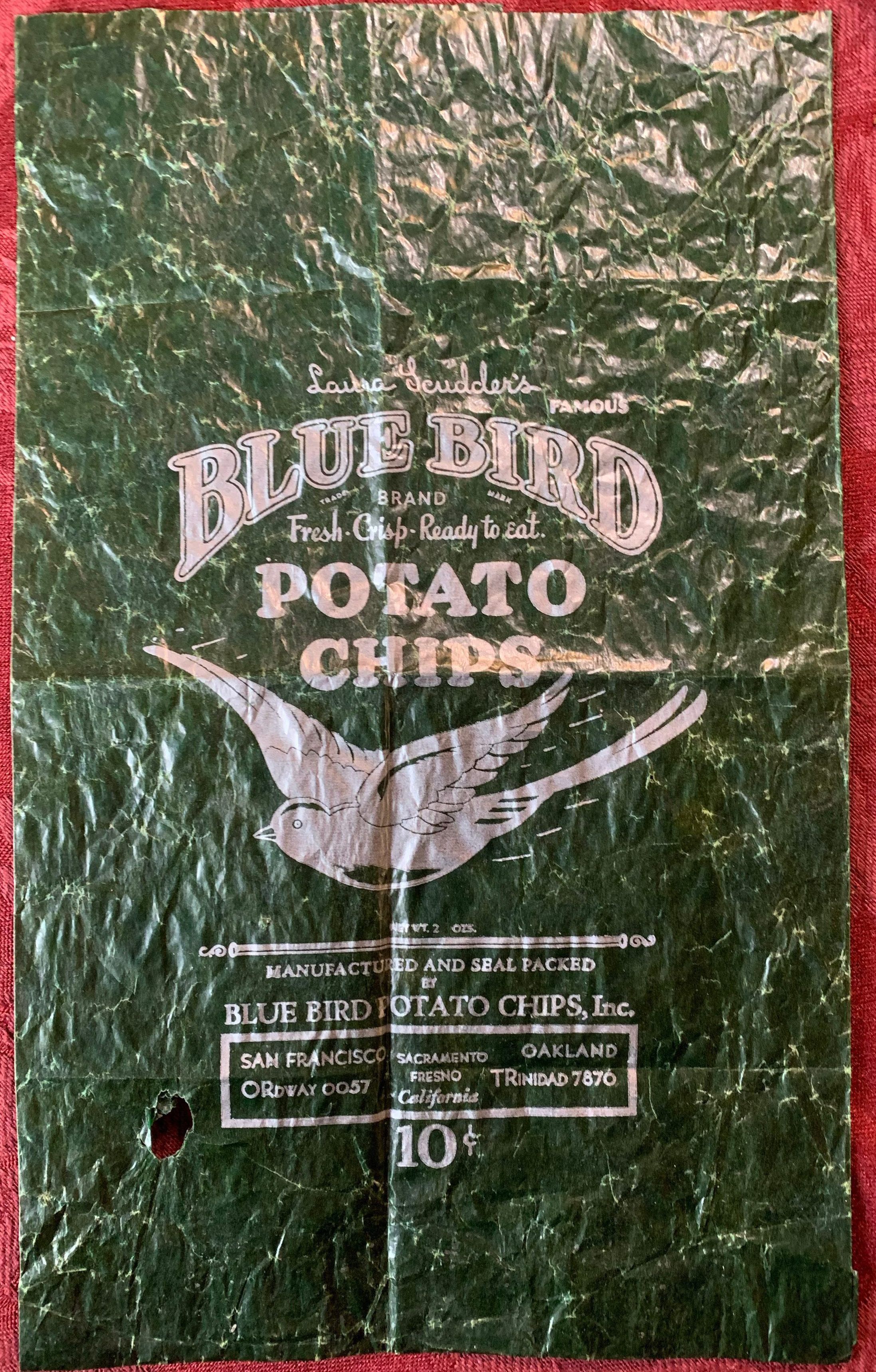 Blue Bird Potato Chip Bag, likely from the 1930s, green with the Blue Bird potato chip logo and made out of wax paper. The Blue Bird company was based in Oakland and revolutionized the sealing technology used for chip bags. The company was owned by Laura Scudder.Made/Created