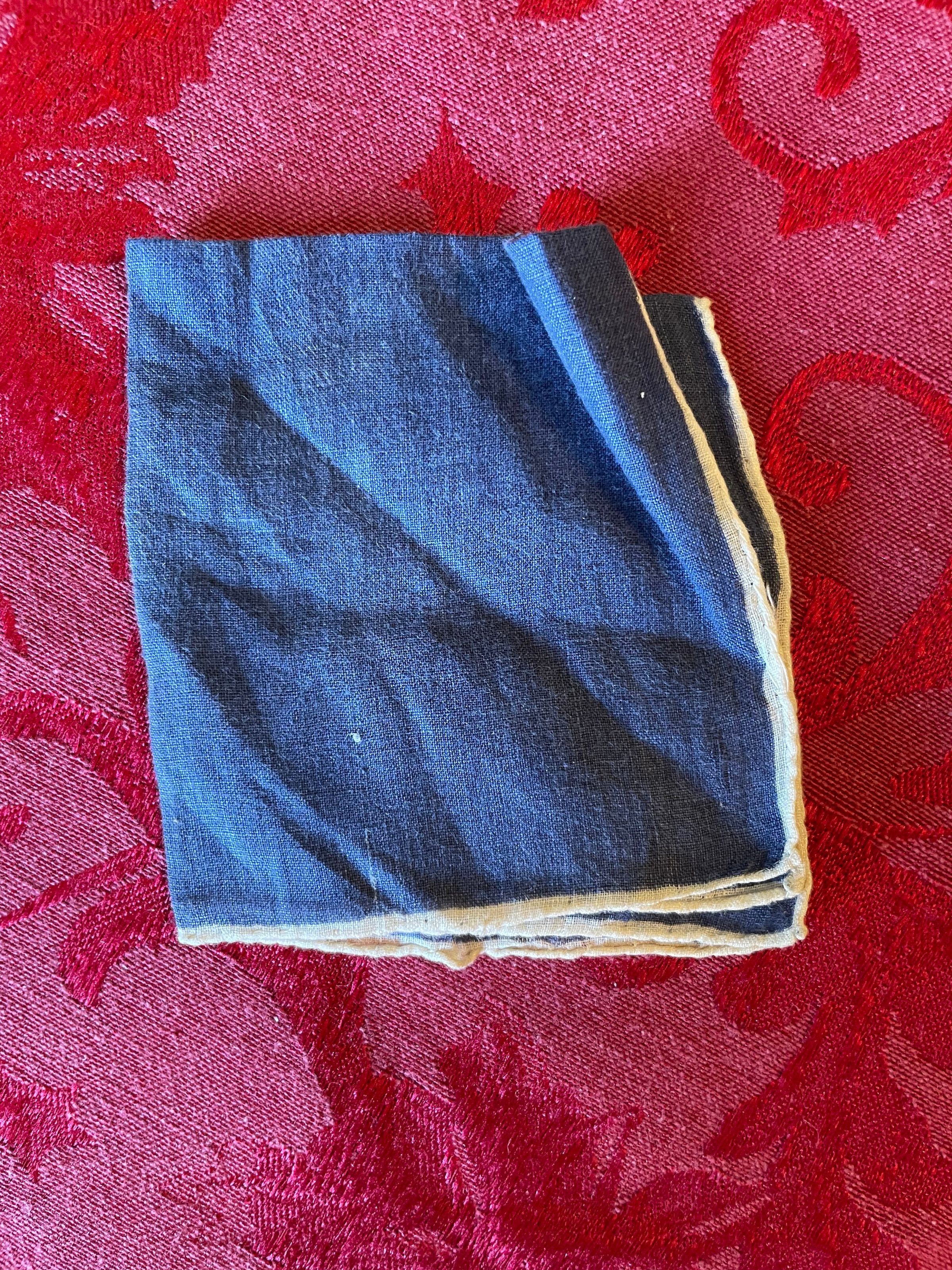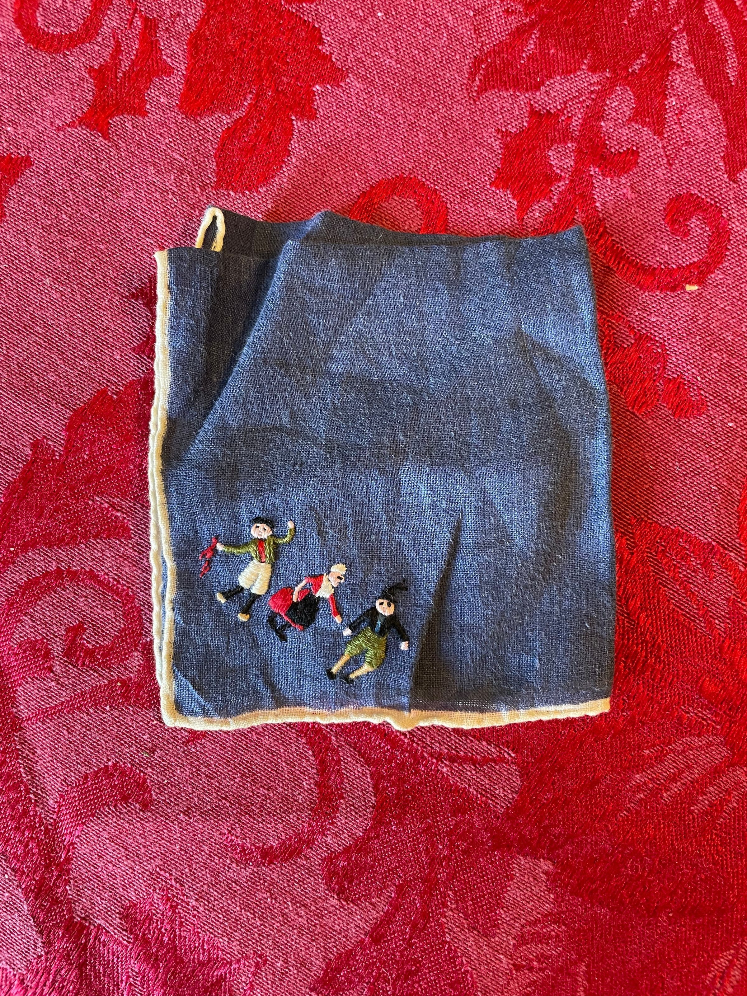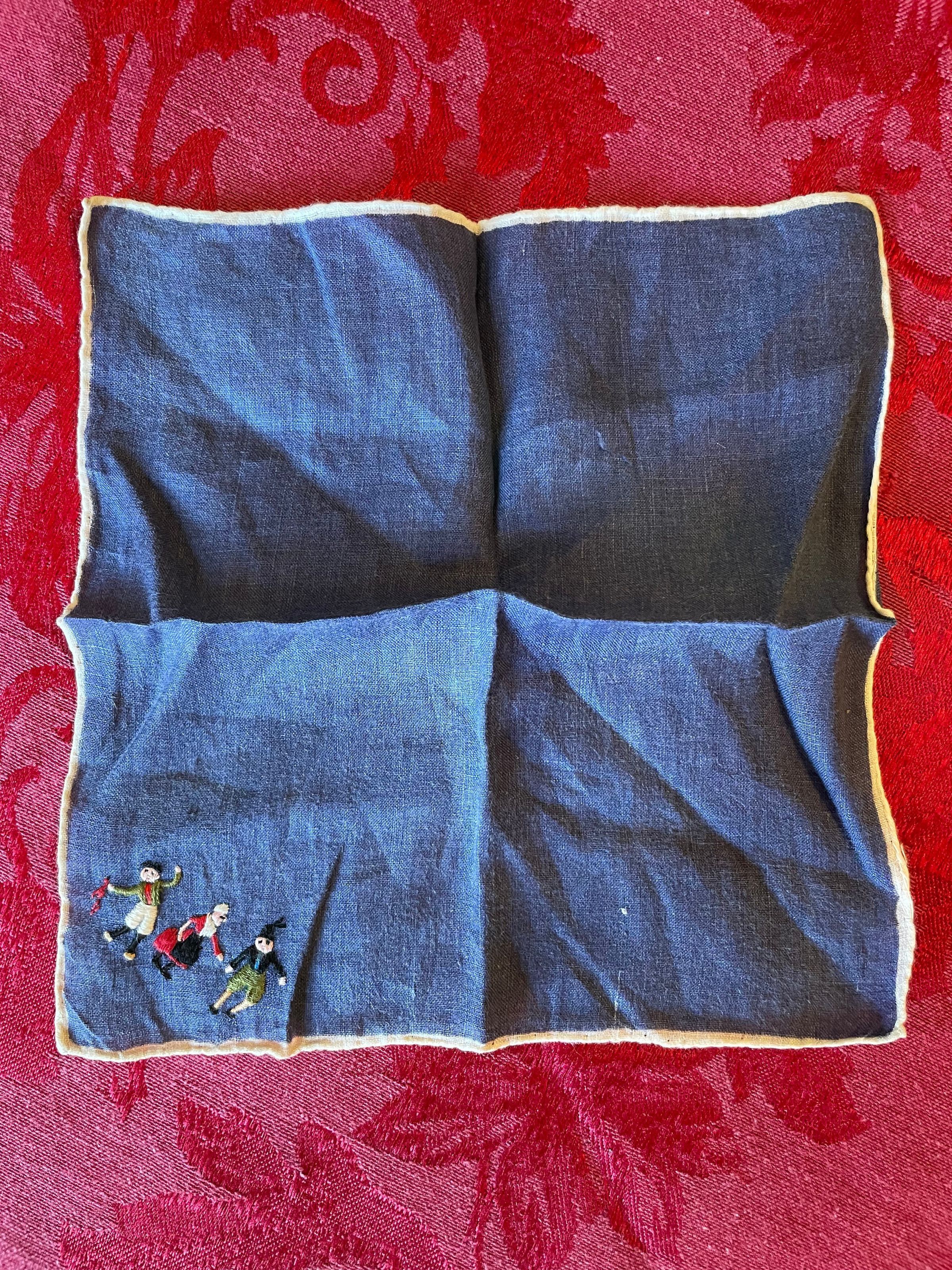 A blue handkerchief with three little figures in European dress embroidered onto the lower left hand corner. It appears to depict a woman and two men, all of whom are dancing in place. The trim is thin and white.Color