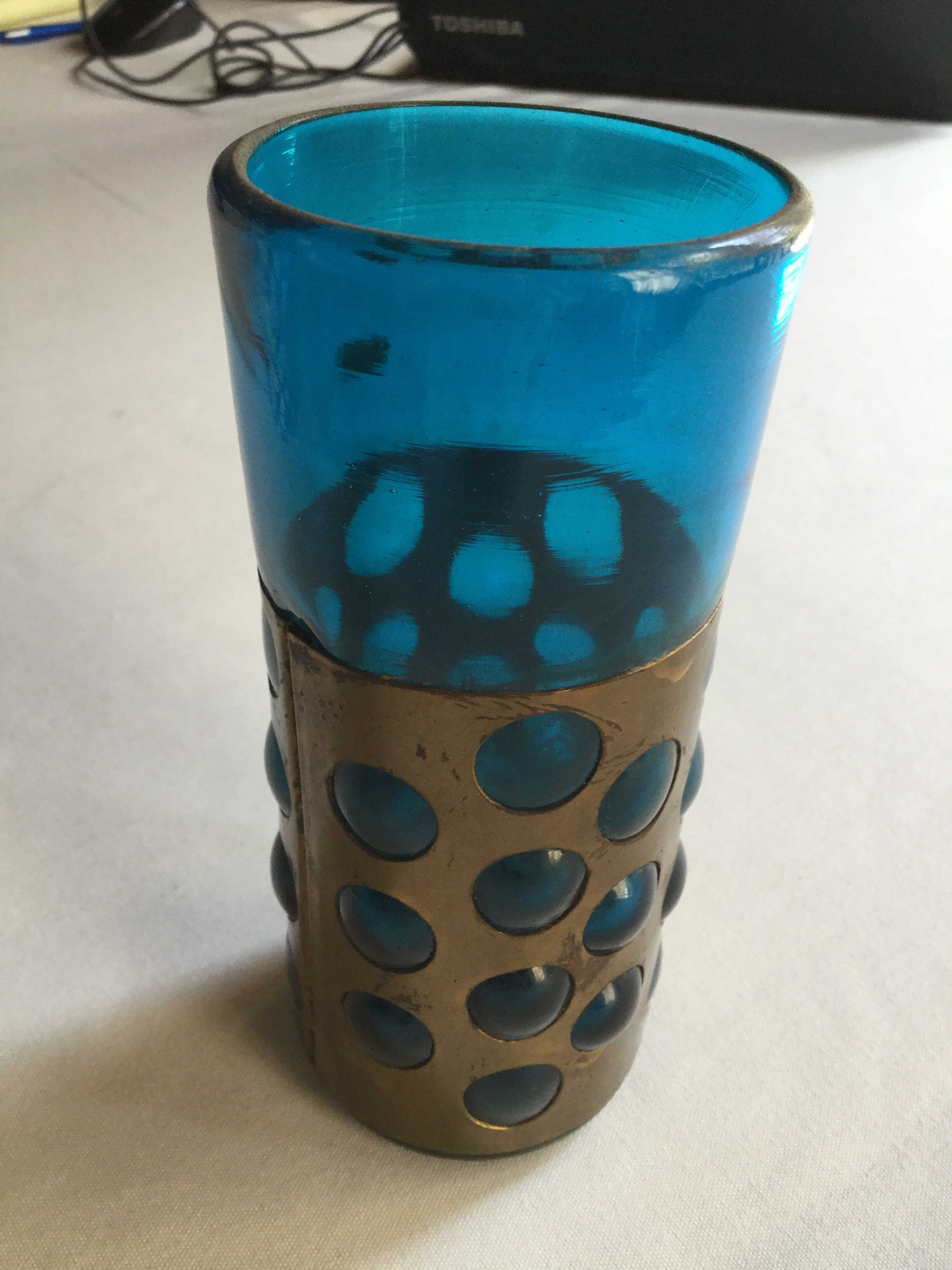 Blue Glass Vase with bronze holder