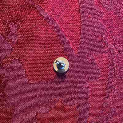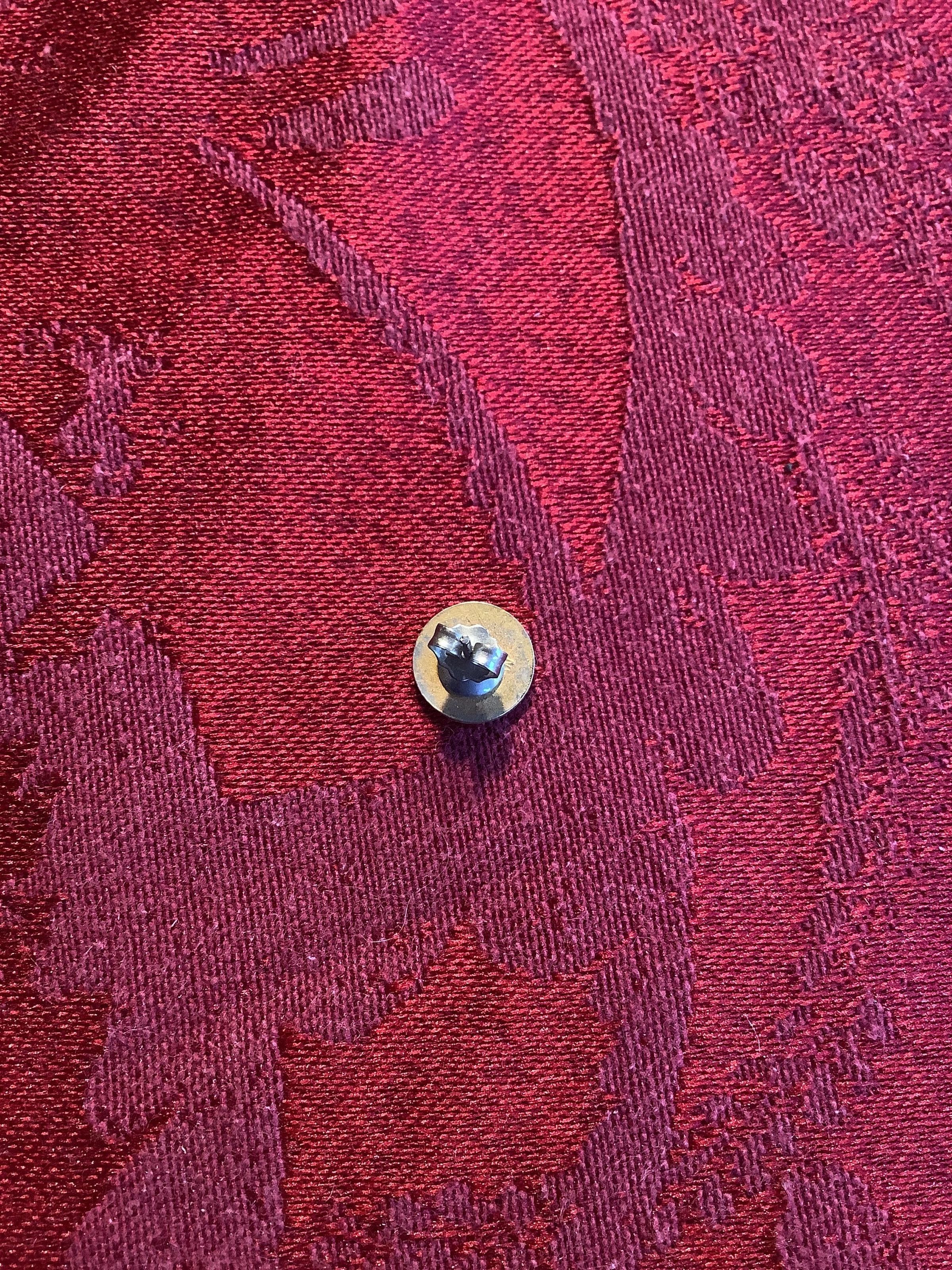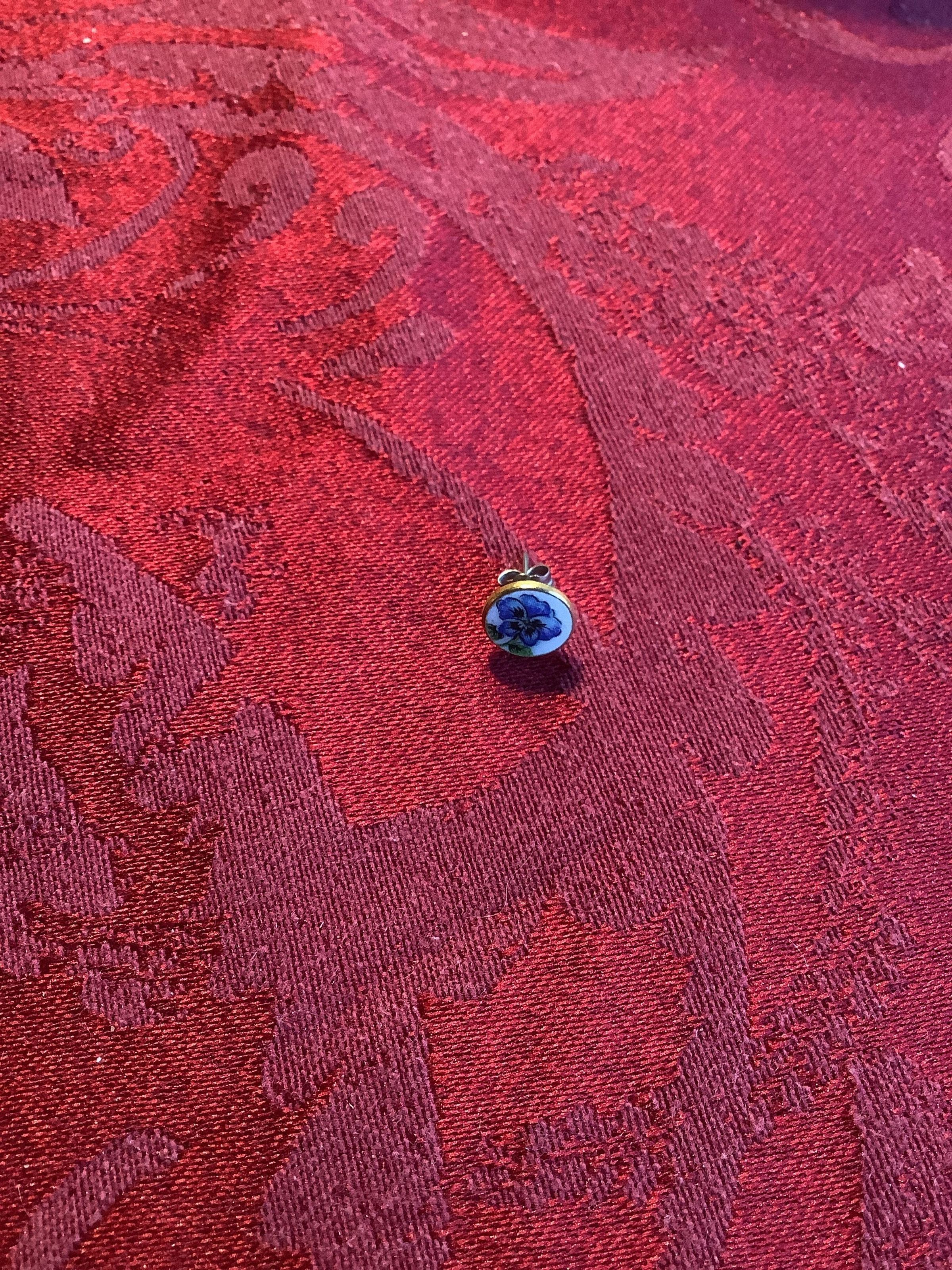 A singular round, enamel earring featuring a blue pansy depicted on a white background and set into a gold toned metal.
