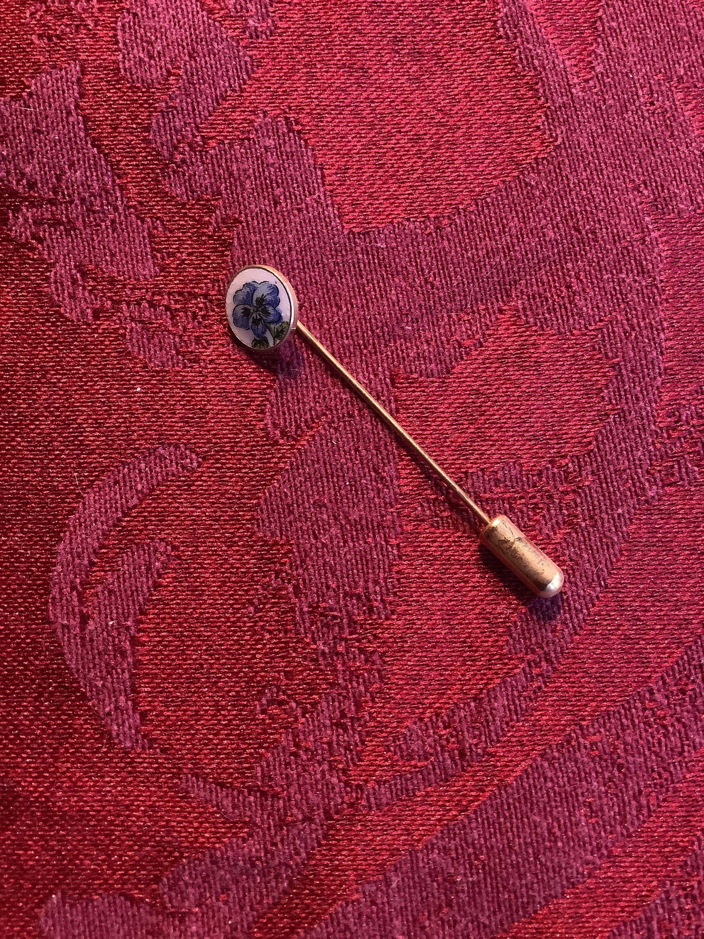 A gold toned, stick pin featuring a blue pansy painted onto a white background on a circular face.