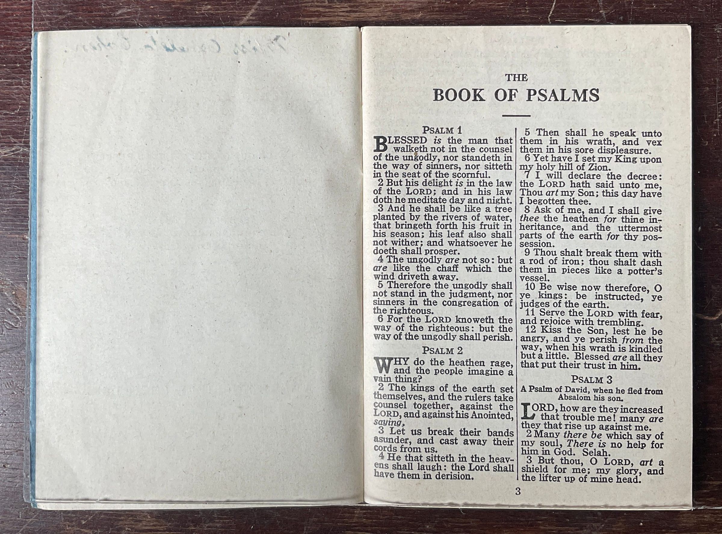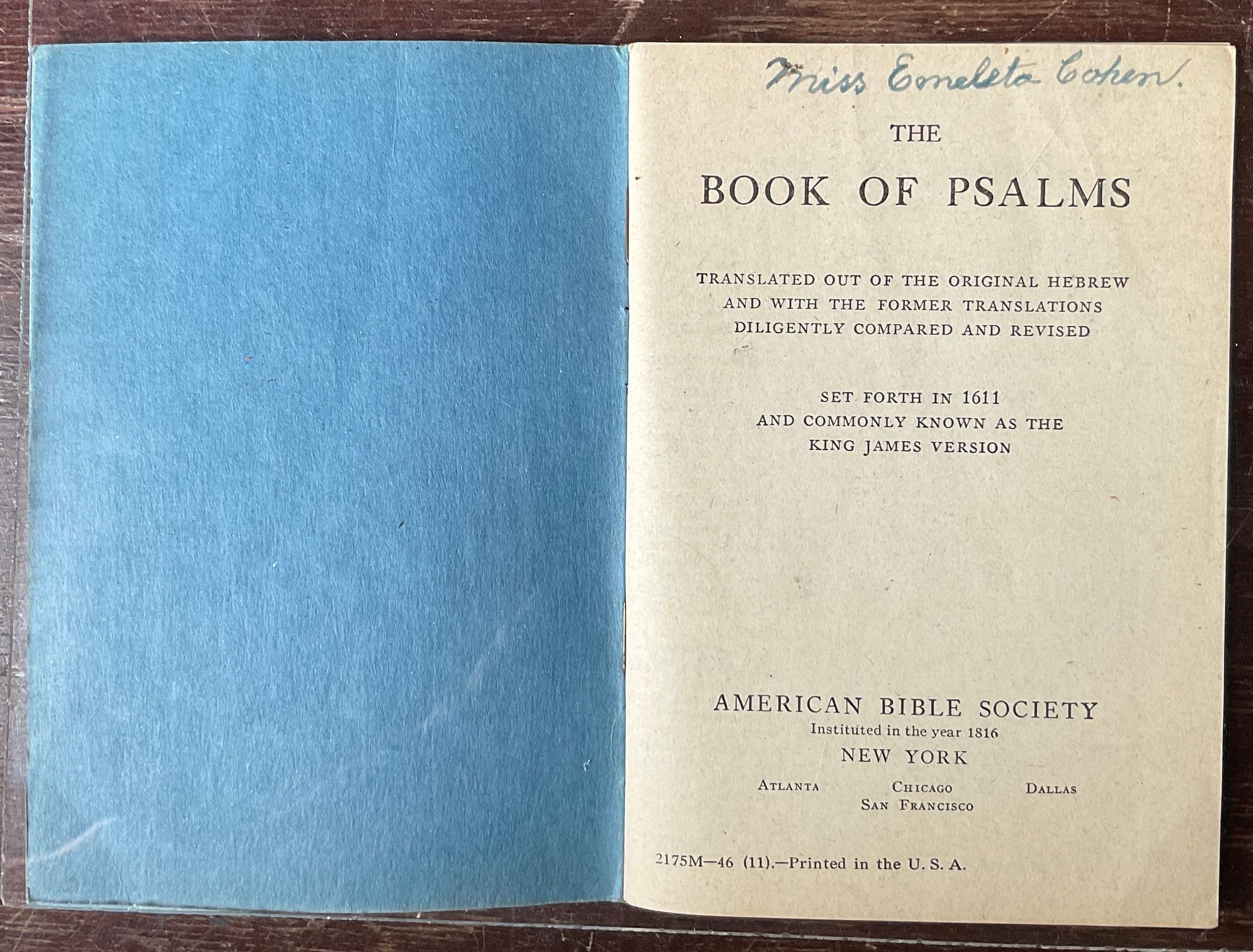 A book of Psalms from the American Bible Society and California Bible Society, Centennial Edition. The book is translated out of the original Hebrew and with the former translations diligently compared and reviewed. Set Forth in 1611 and commonly known as the King James VersionInscription/Signature/Marks