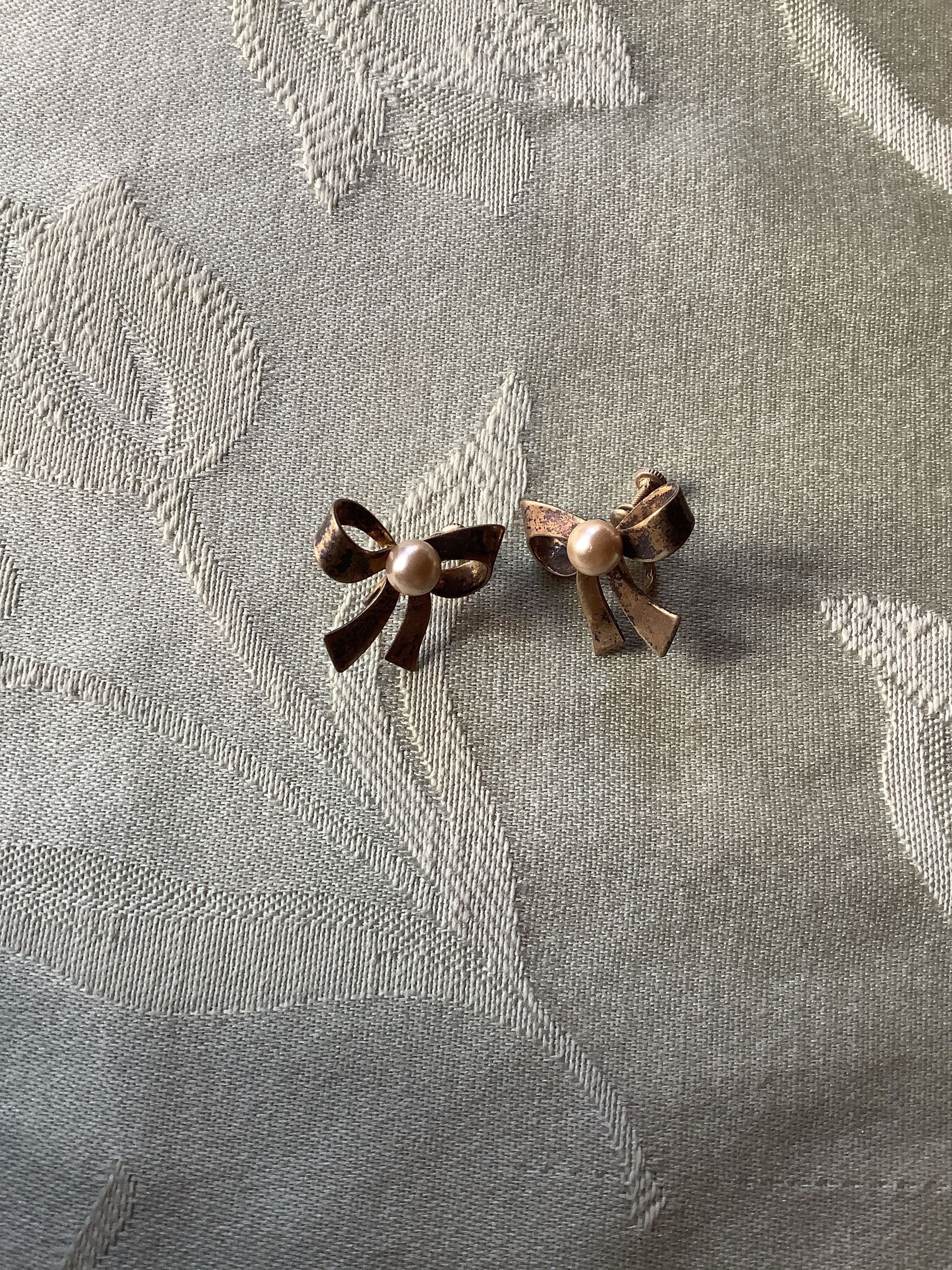 Gold toned bow earrings with a faux pearl in the center, a screw back clip on. These could possibly be Marino earrings from the 1930s or 1940s.Collection