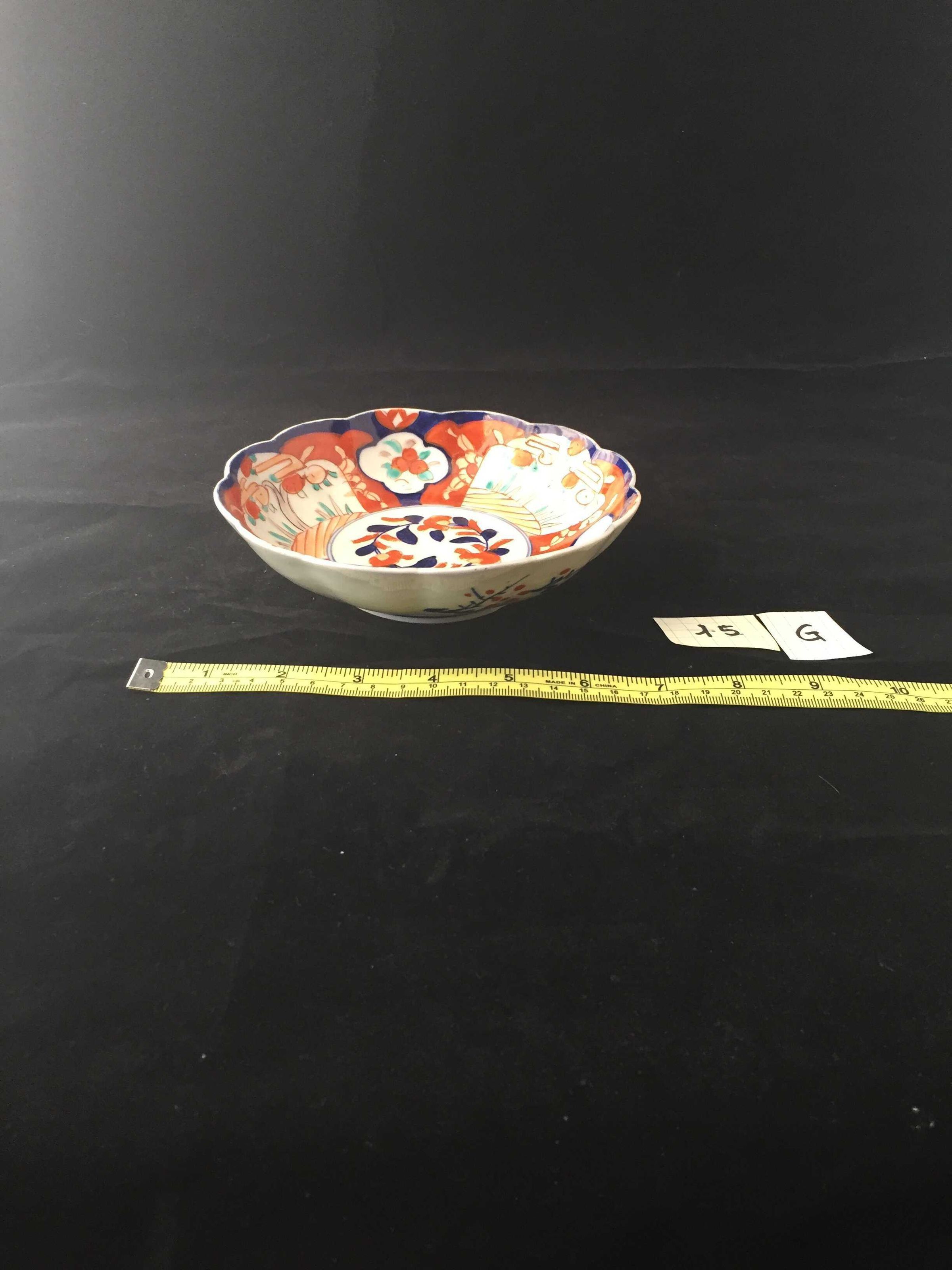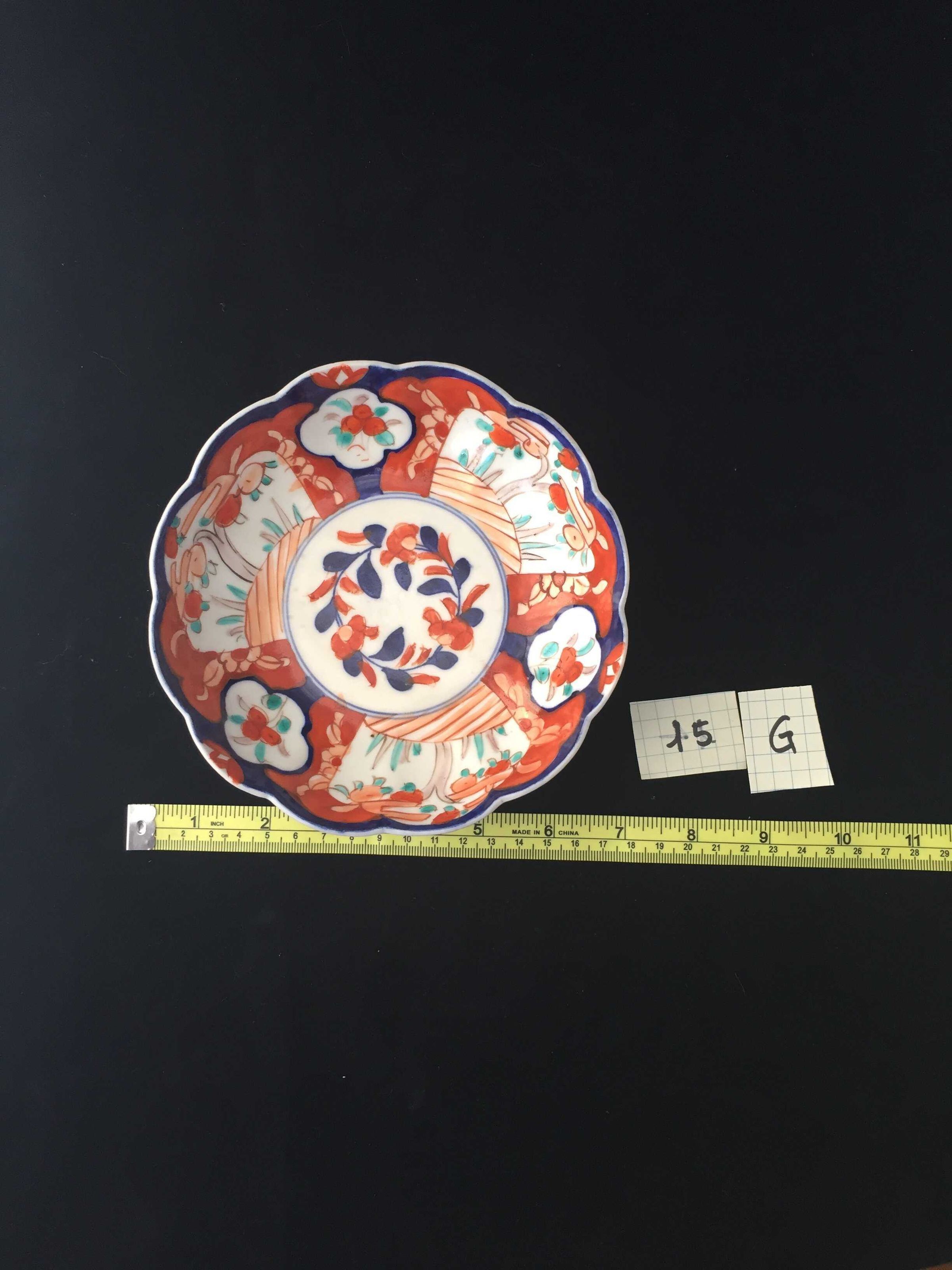 Blue, green and red floral design on face, blue and red floral design on base, scalloped rim, stoneware